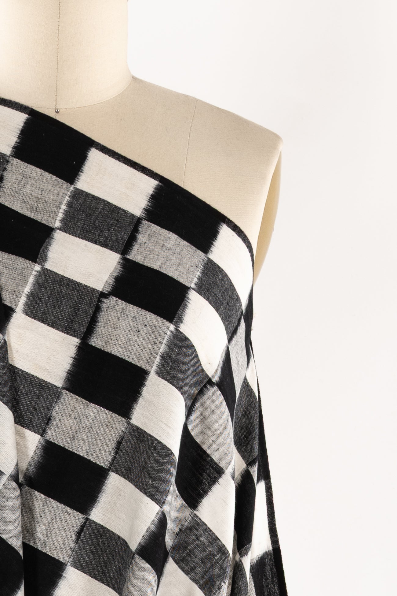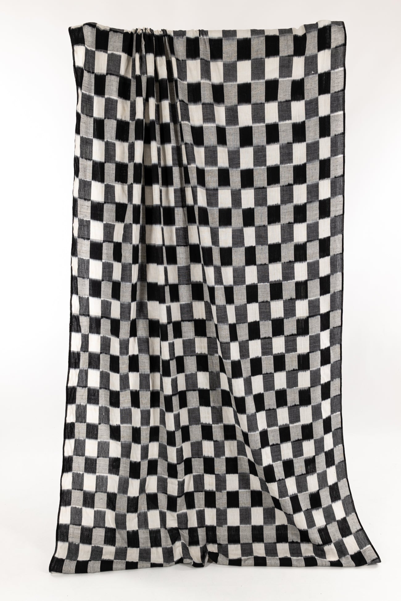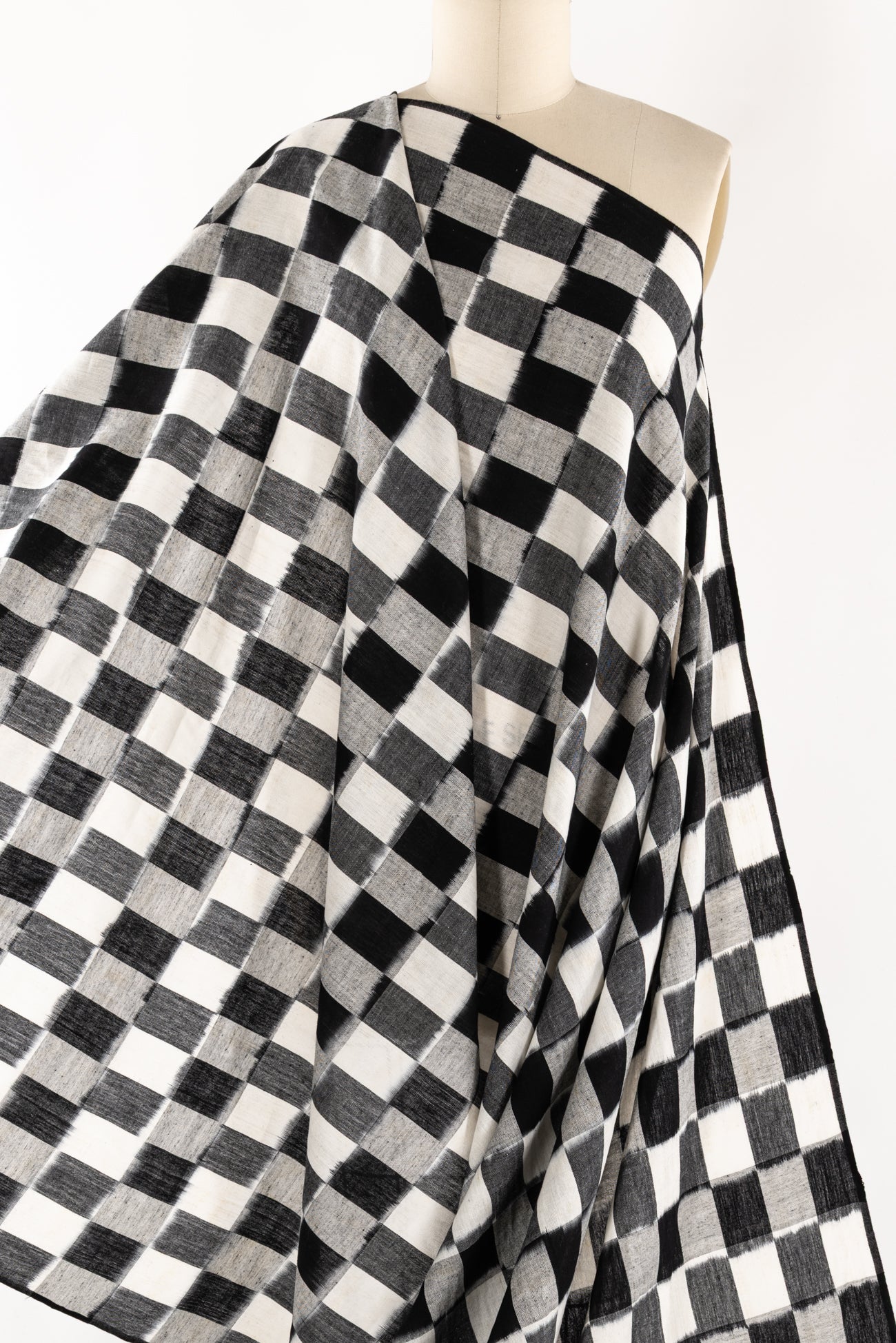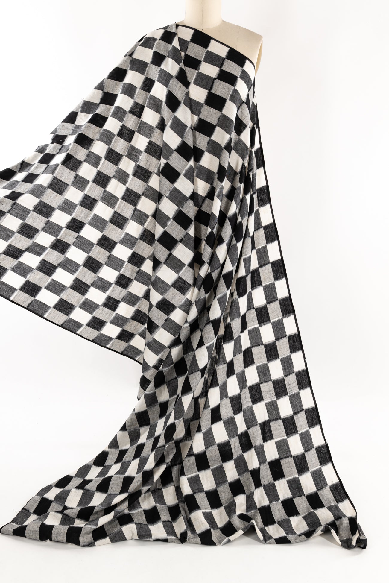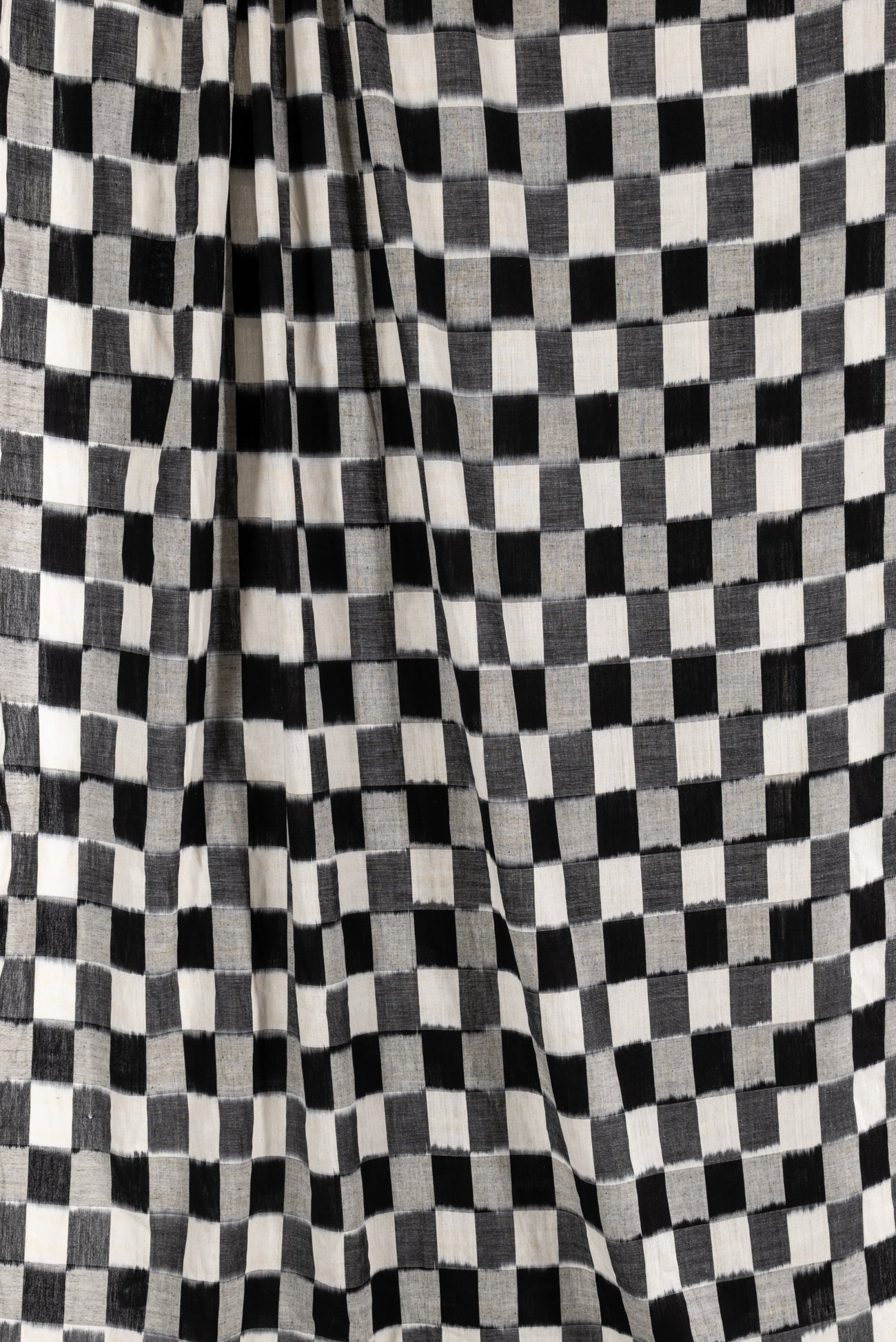 Black, white and gray double ikat squares create a charming checkerboard, in a hand-woven cotton from India that is naturally blurry in a charming way. Some of the most interesting and soulful fabrics are coming out of India today where textile traditions continue. Double Ikat is a technique in which both warp and the weft are resist-dyed prior to weaving, so it it is the most difficult to make and more expensive to produce. Light weight, opaque with a lightly textured appealing cool hand, and airy drape. The weight is right for a tunic, shirt, light jacket, vest, dress, skirt, caftan or soft pants.
