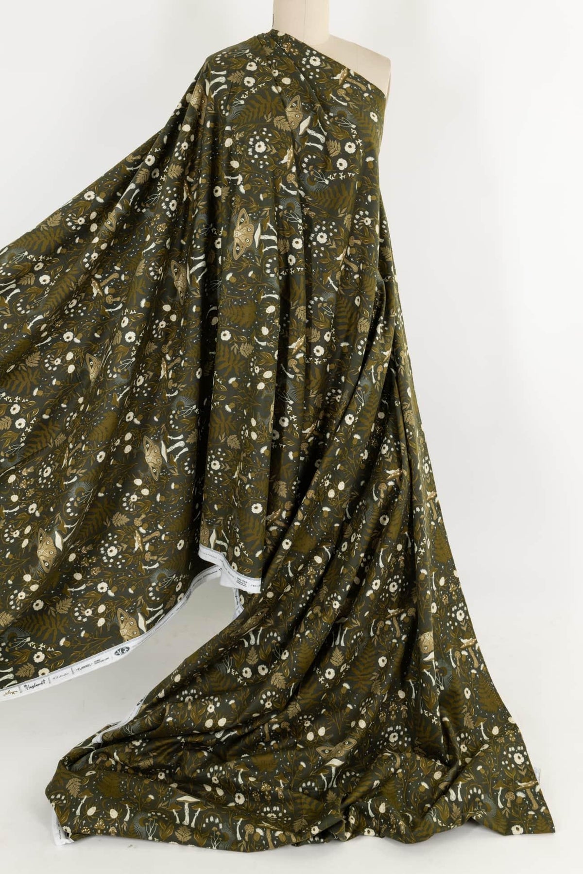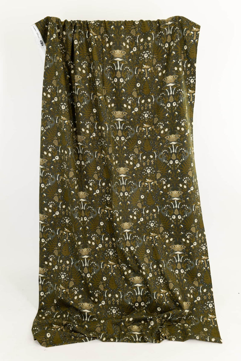 A marvelous medley of moths, mushrooms, ferns and flowers in shades of green on an exceptional quality warm white cotton flannel. Mid-weight with a super soft hand, cozy brushed finish on both sides of the plain weave, with a soft drape and a 12½" repeat. Flannel is on trend this season and oh so comfortable to wear. Perfect for a shirt, dress, vest, tunic, men's shirt, children's clothing and wonderfully cozy pj's or robe. OEKO-TEX certified.