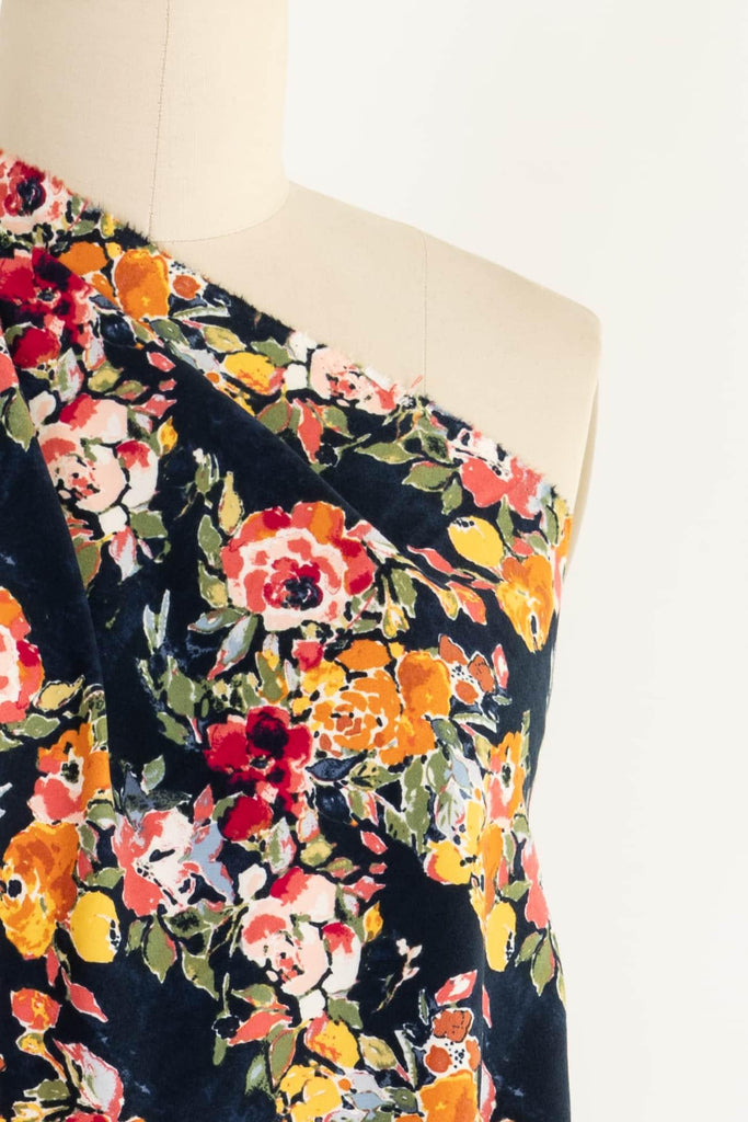The fabulous flowers of fall in warm shades of rust, gold, pink, carmine and green on a deep navy ground. Exceptional quality cotton flannel produced in South Korea is mid-weight with a super soft hand, cozy brushed finish on both sides of the plain weave, with a soft drape and a 12" repeat. Flannel is on trend this season and oh so comfortable to wear. Perfect for a shirt, dress, vest, tunic, men's shirt, children's clothing and wonderfully cozy pj's or robe. OEKO-TEX certified.