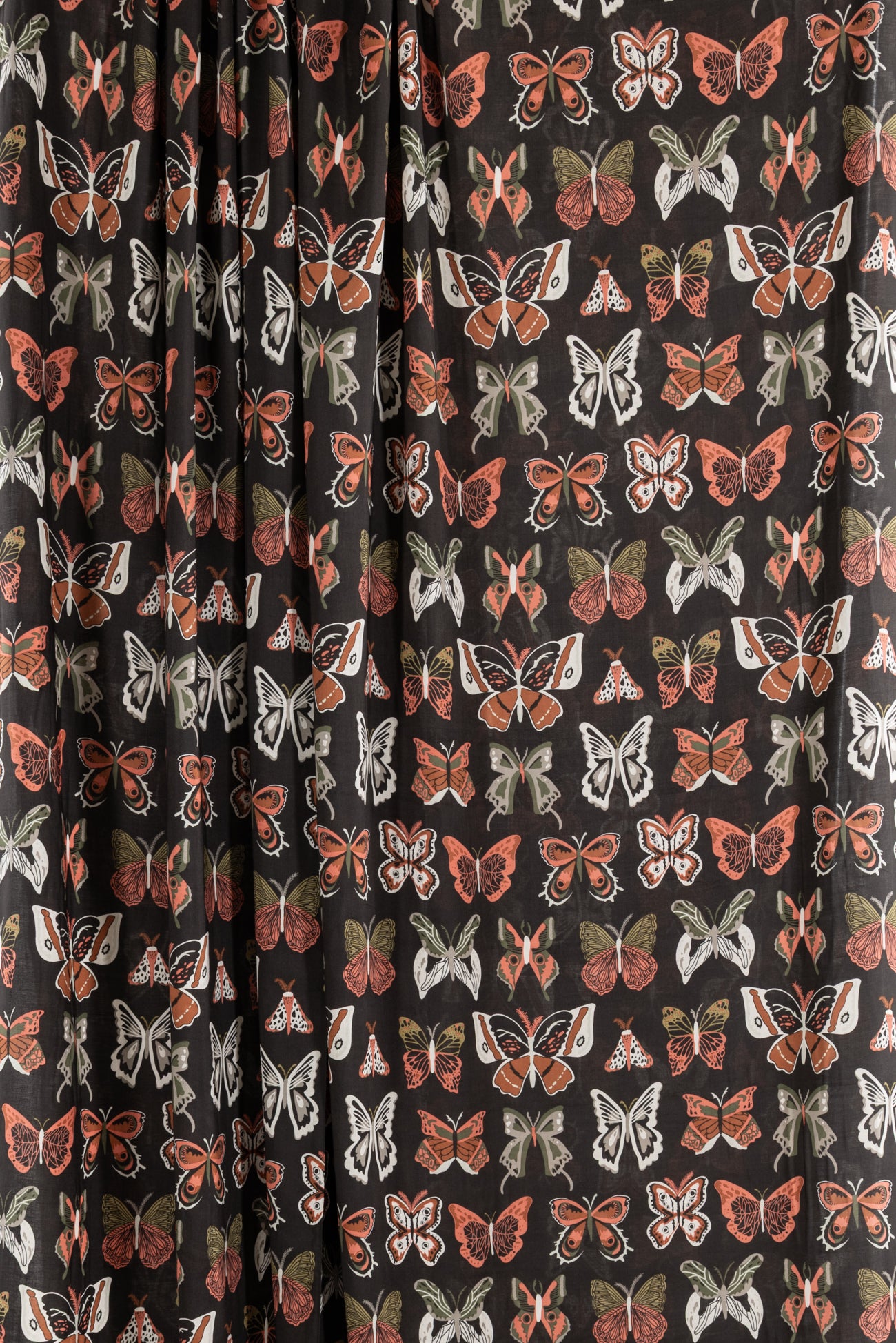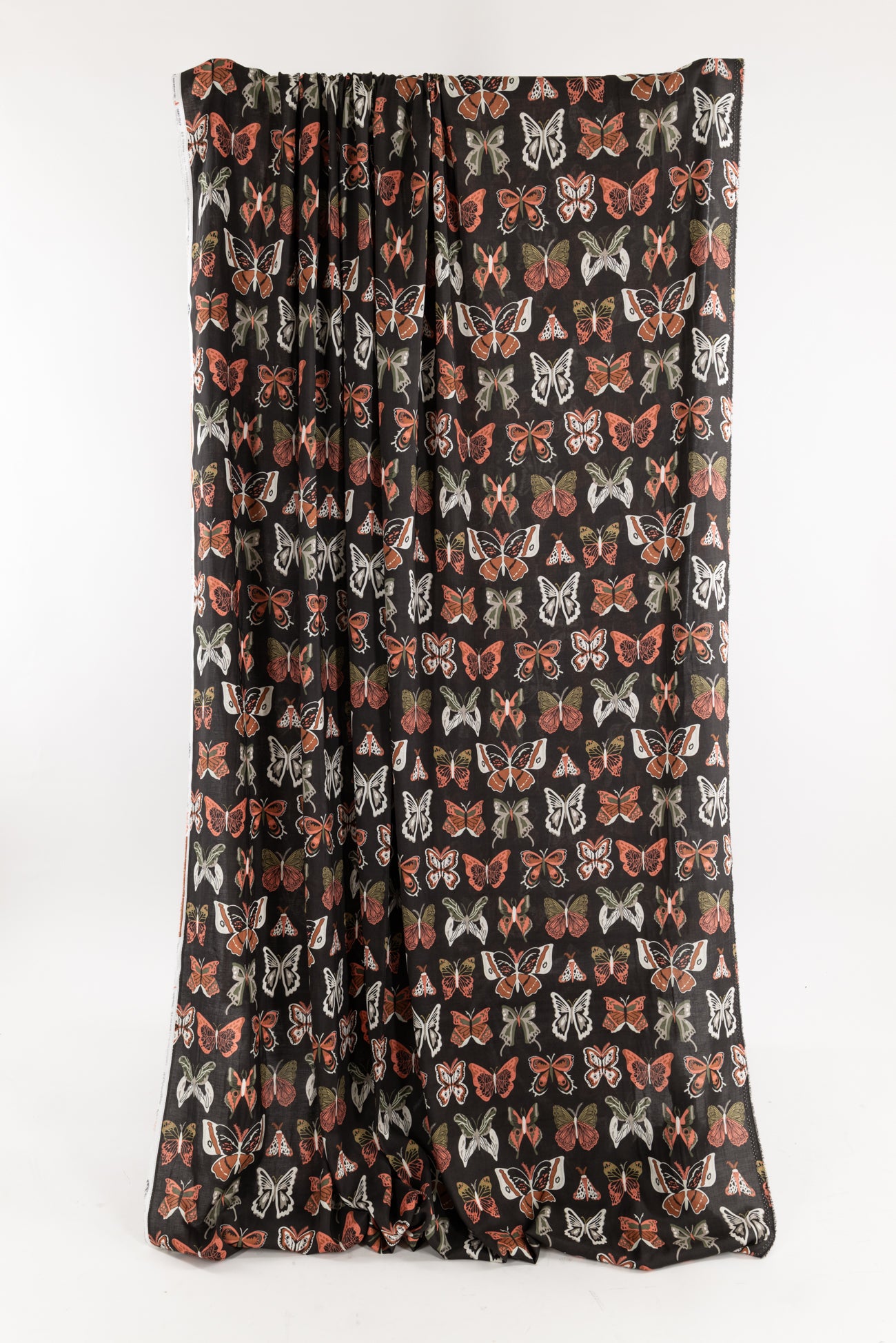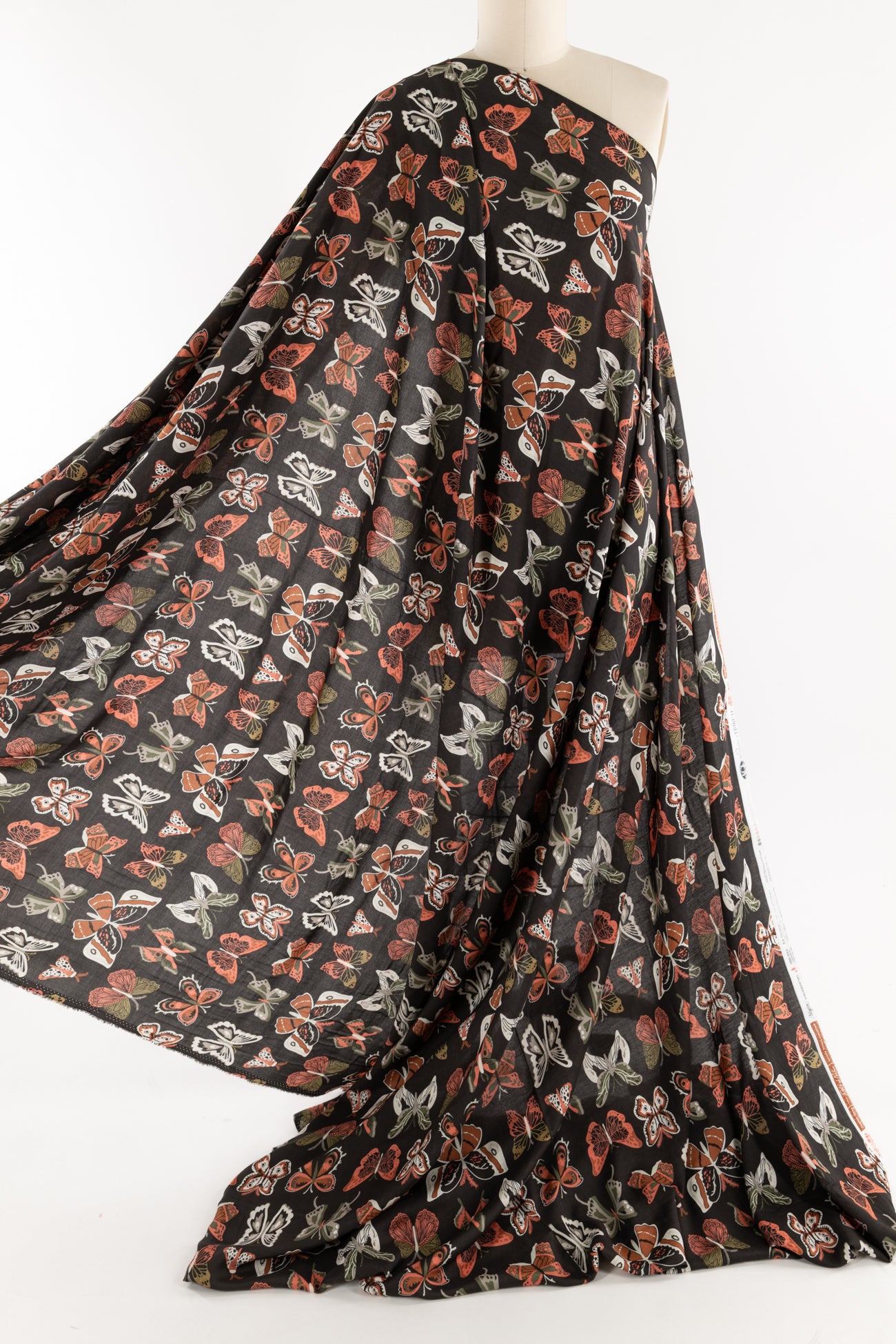 A fanciful fluttering of butterflies in coral, caramel, and olive with cream and gray accents on deep moss green. Lightweight Oeko-Tex® certified rayon with a smooth buttery hand, 12½" repeat, and liquid drape. Right for a dress, skirt, shirt, tunic, soft pants, kimono, caftan, loungewear, men's, or children's.