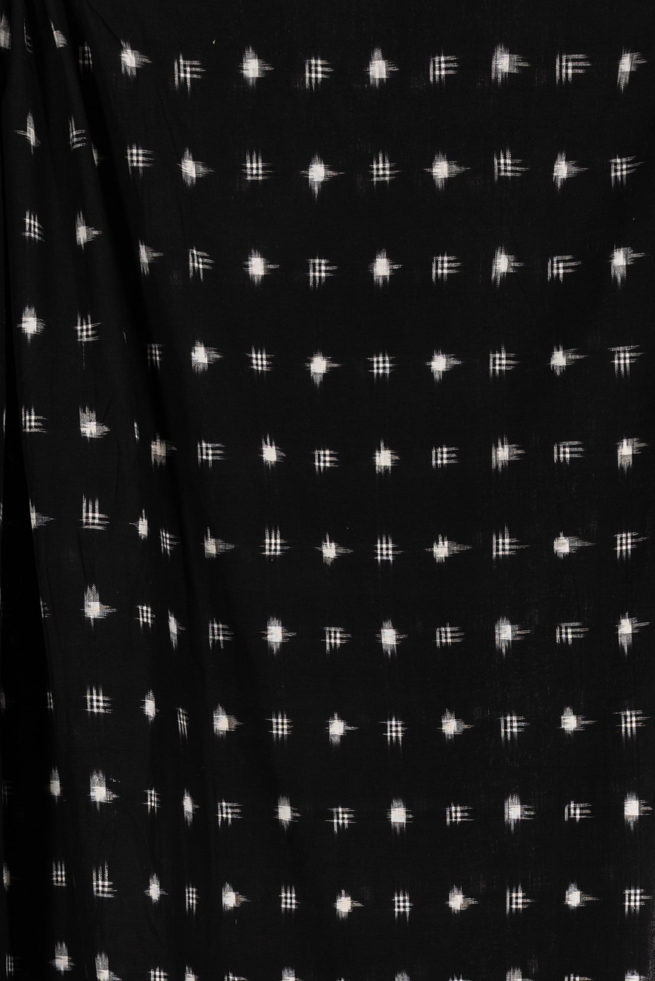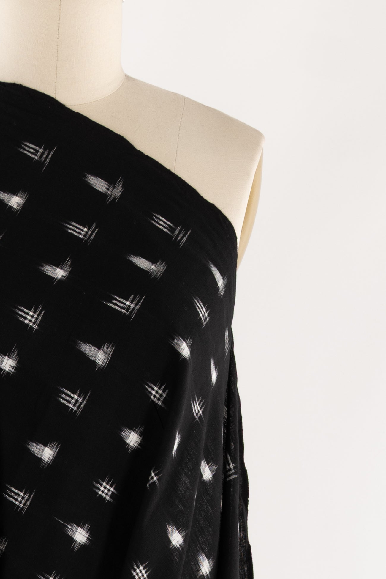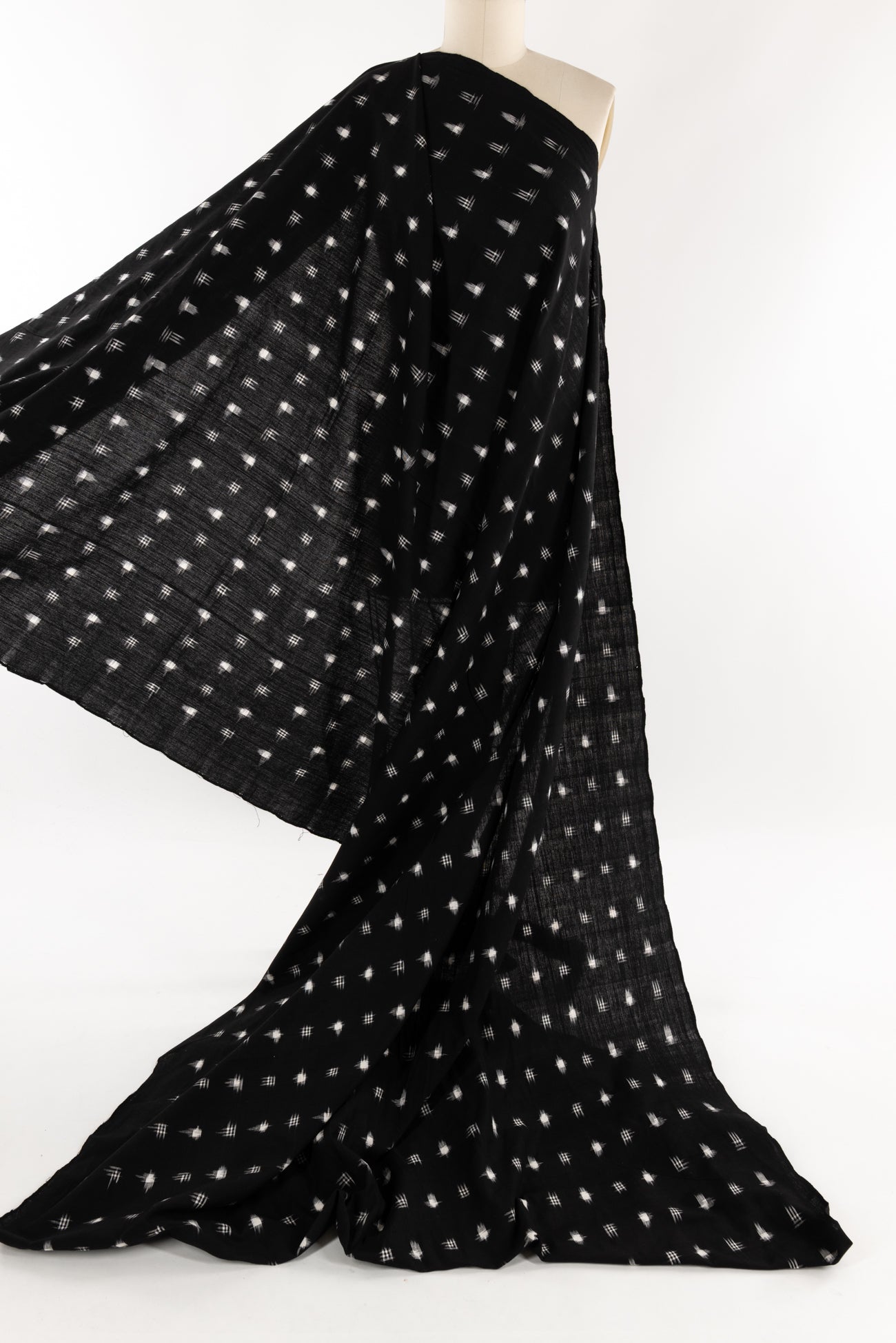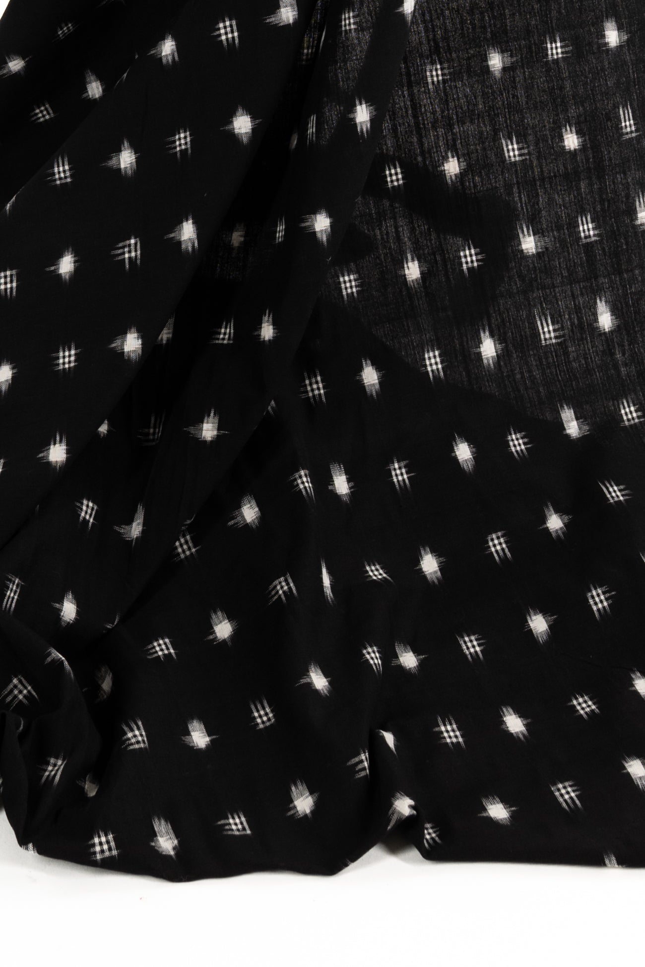 White on black small double ikat squares and checks, in a hand-woven cotton from India that is naturally blurry in a charming way. Some of the most interesting and soulful fabrics are coming out of India today where textile traditions continue. Double Ikat is a technique in which both warp and the weft are resist-dyed prior to weaving, so it it is the most difficult to make and more expensive to produce. Light weight, opaque with a lightly textured appealing cool hand, and airy drape. The weight is right for a tunic, shirt, light jacket, vest, dress, skirt, caftan or soft pants.