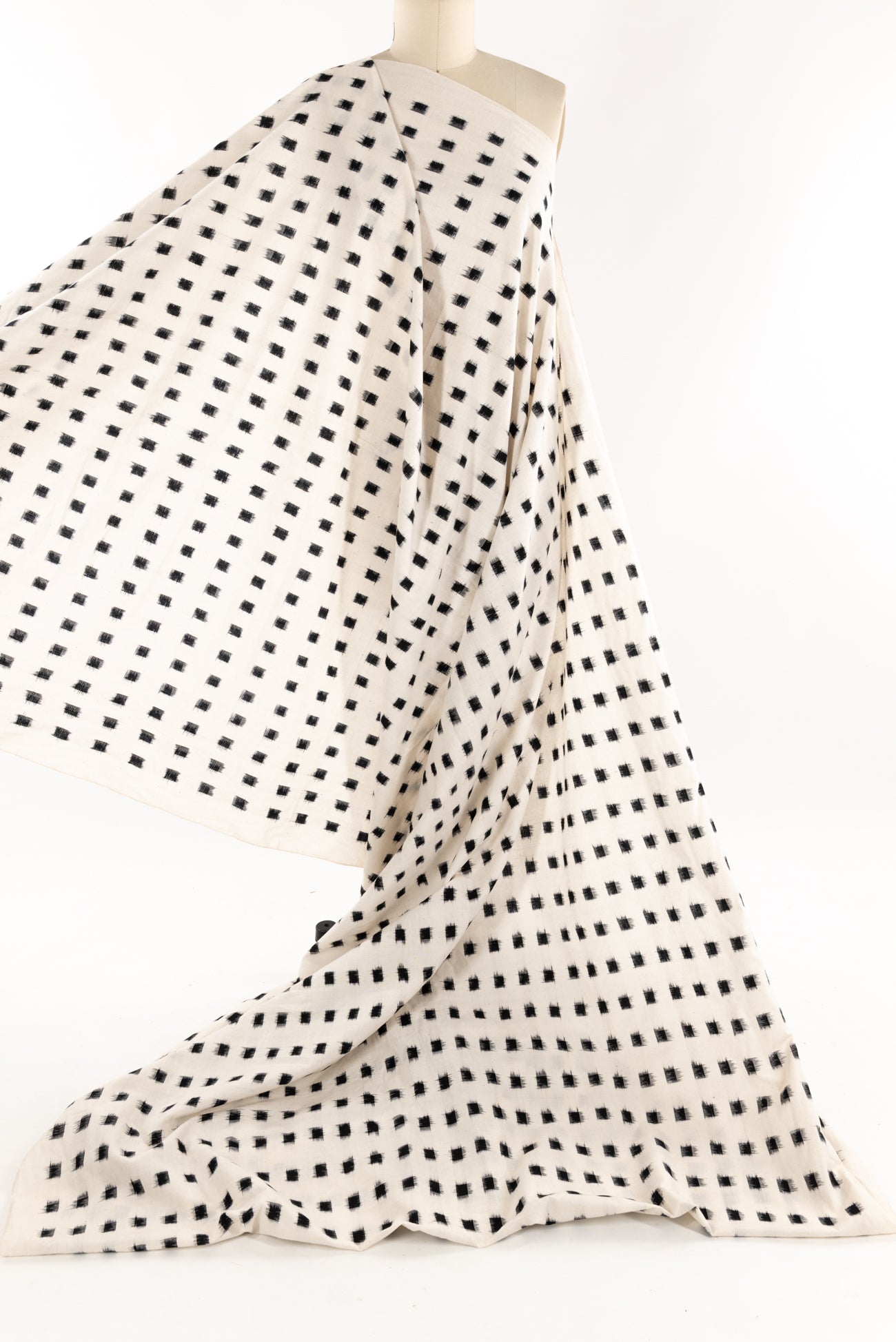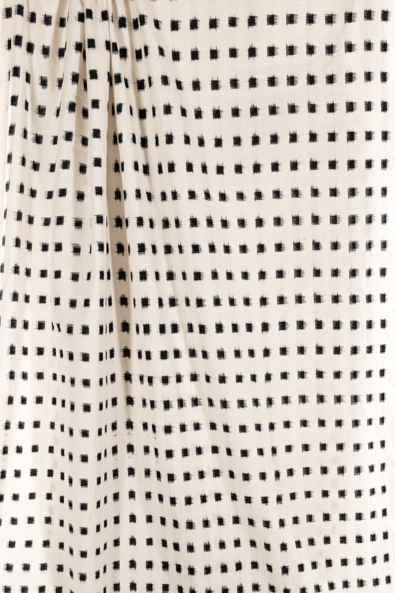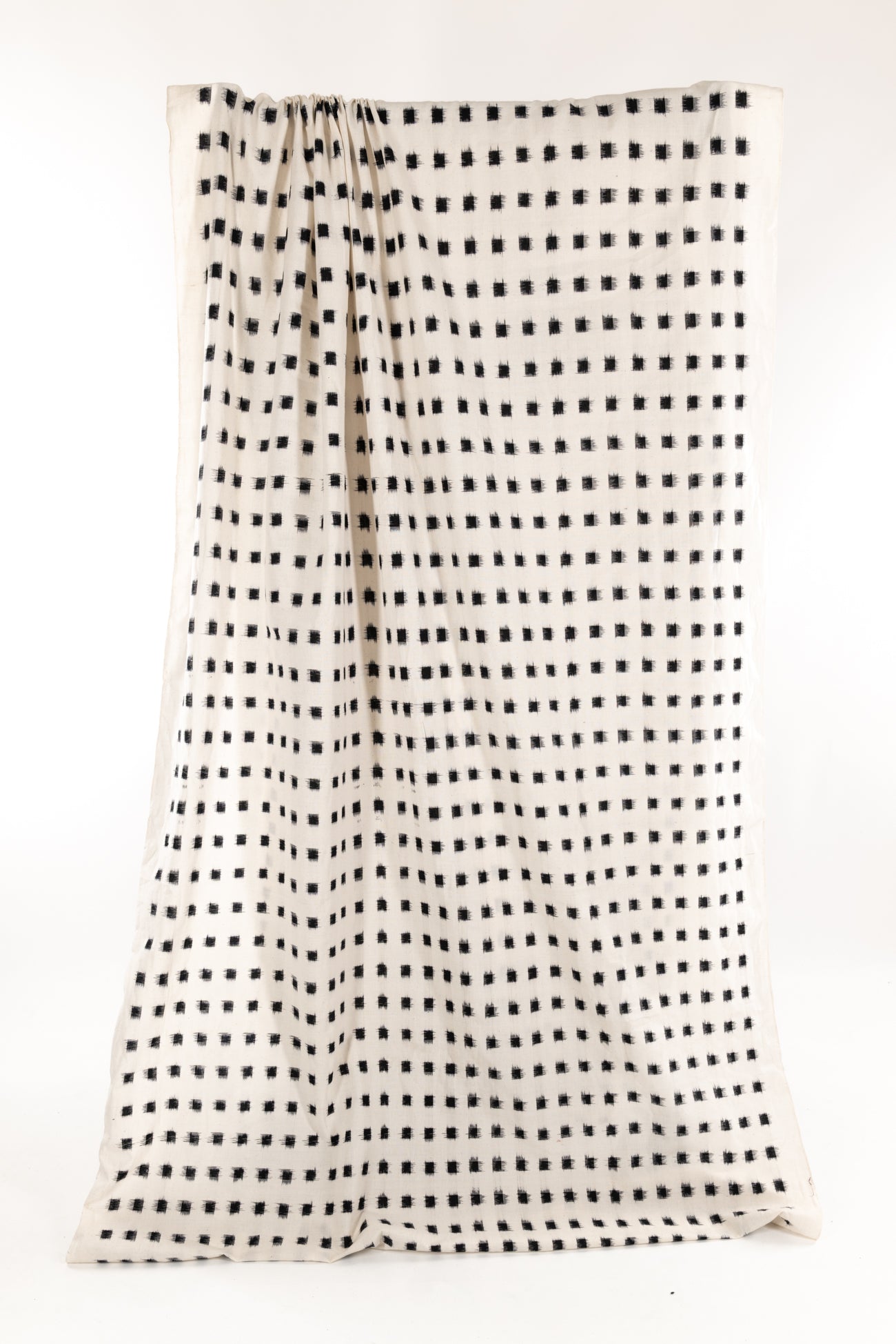 Black on warm white small double ikat squares, in a hand-woven cotton from India that is naturally blurry in a charming way. Some of the most interesting and soulful fabrics are coming out of India today where textile traditions continue. Double Ikat is a technique in which both warp and the weft are resist-dyed prior to weaving, so it it is the most difficult to make and more expensive to produce. Light weight, opaque with a lightly textured appealing cool hand, and airy drape. The weight is right for a tunic, shirt, light jacket, vest, dress, skirt, caftan or soft pants.