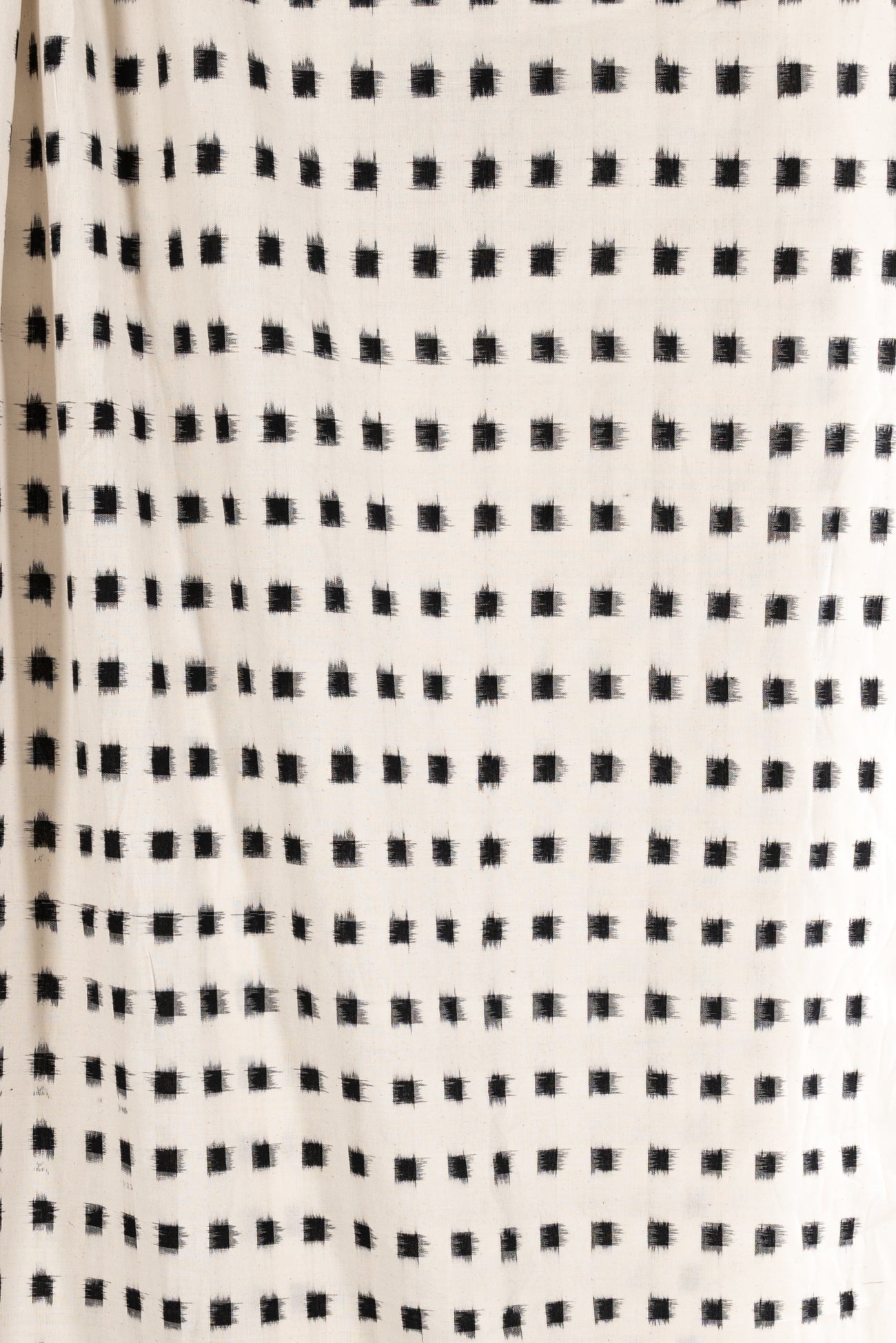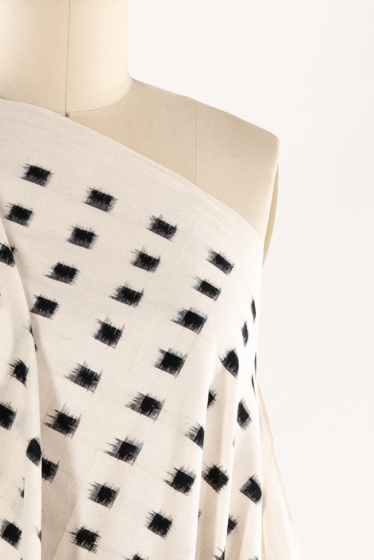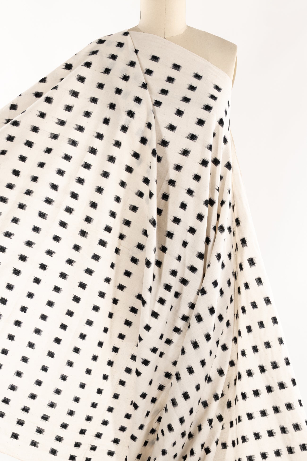 Black on warm white small double ikat squares, in a hand-woven cotton from India that is naturally blurry in a charming way. Some of the most interesting and soulful fabrics are coming out of India today where textile traditions continue. Double Ikat is a technique in which both warp and the weft are resist-dyed prior to weaving, so it it is the most difficult to make and more expensive to produce. Light weight, opaque with a lightly textured appealing cool hand, and airy drape. The weight is right for a tunic, shirt, light jacket, vest, dress, skirt, caftan or soft pants.
