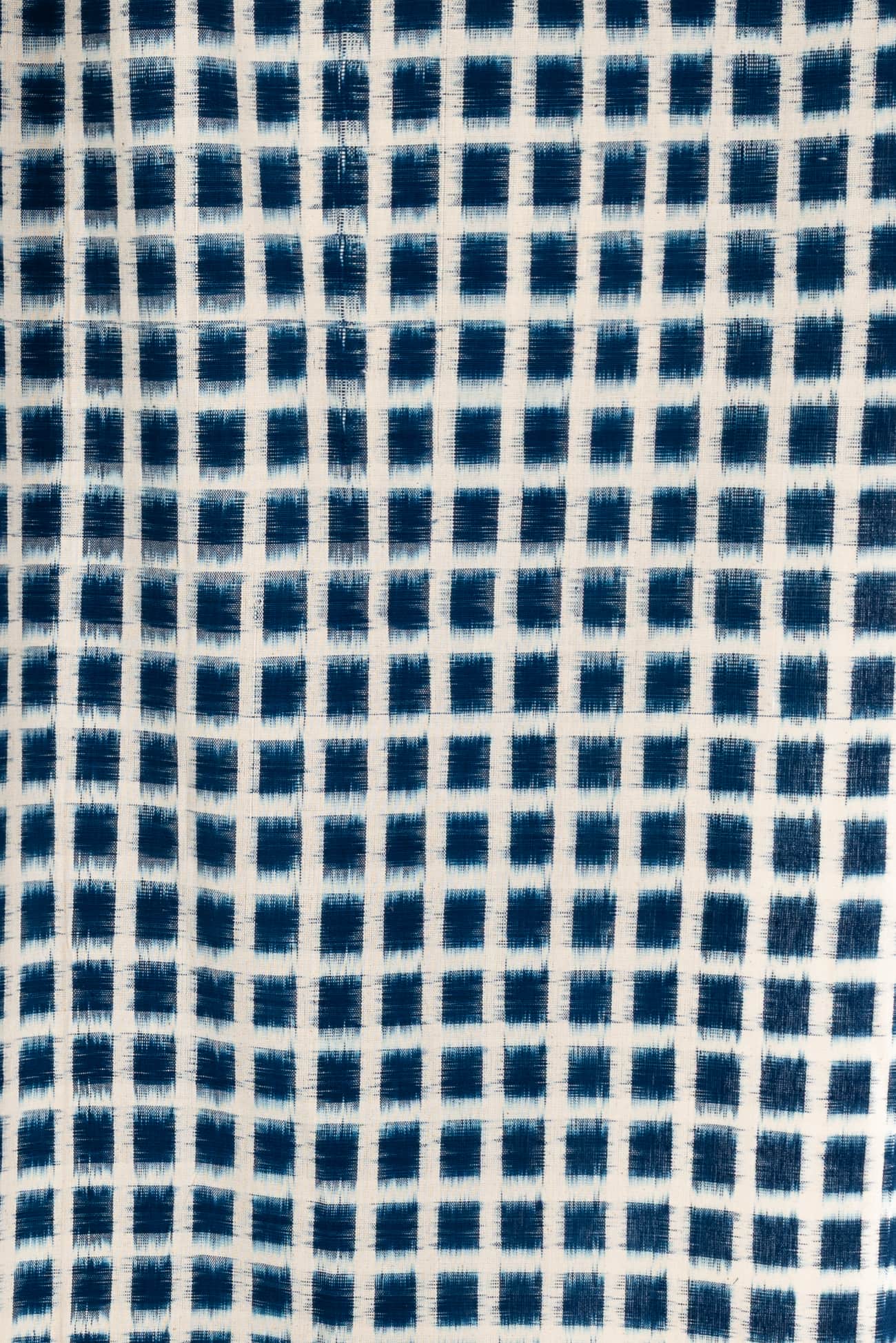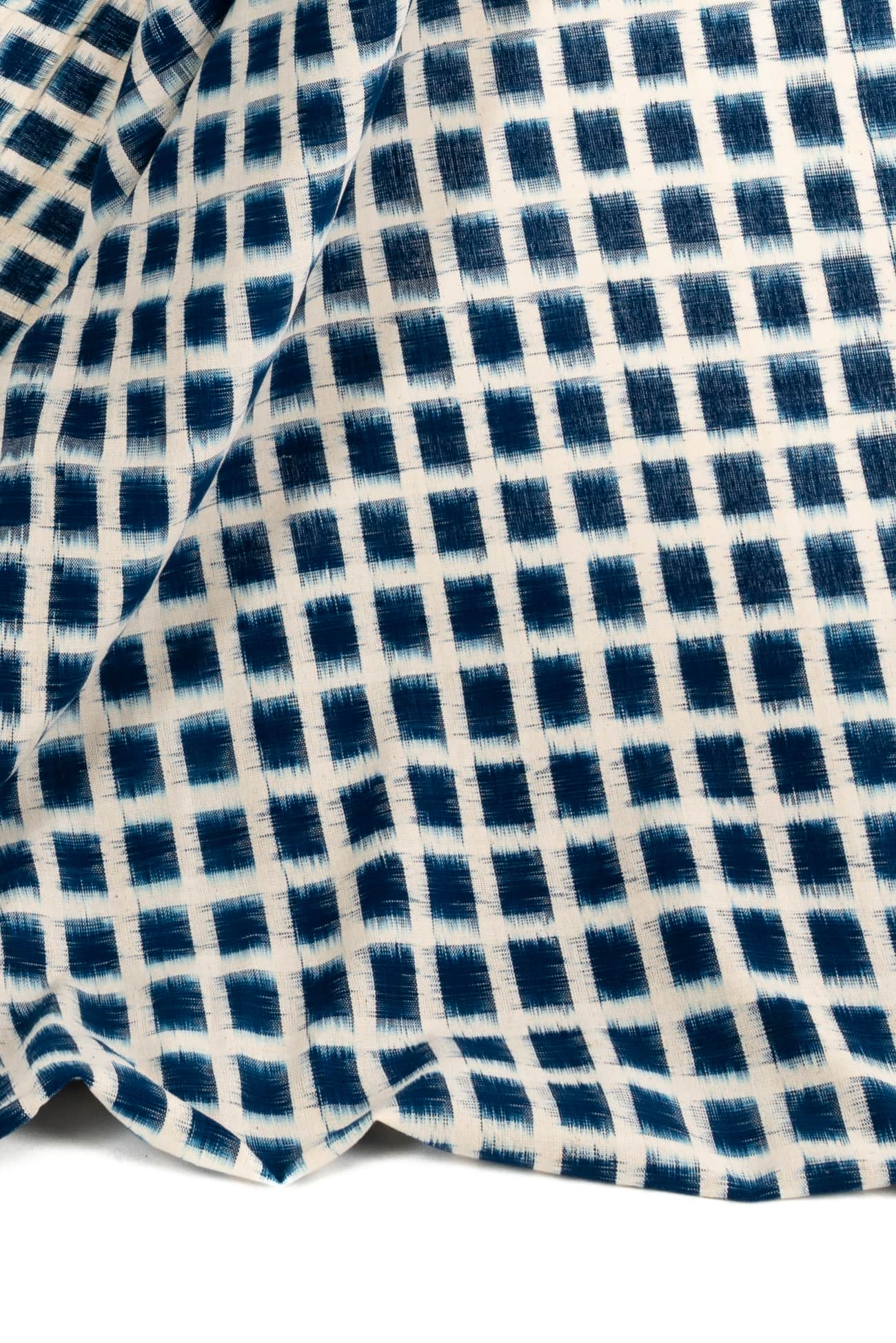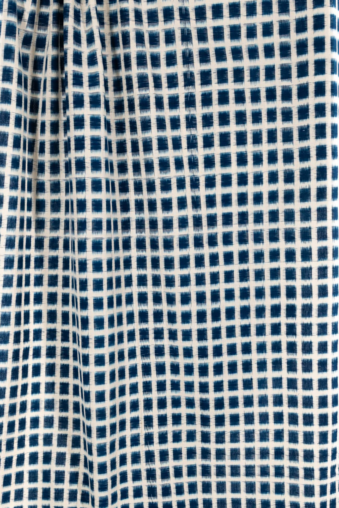 Clear blue and white double ikat rectangles, in a hand-woven cotton from India that is naturally blurry in a charming way. Some of the most interesting and soulful fabrics are coming out of India today where textile traditions continue. Double Ikat is a technique in which both warp and the weft are resist-dyed prior to weaving, so it it is the most difficult to make and more expensive to produce. Mid/light weight, opaque with a lightly textured appealing cool hand, and airy drape. The weight is right for a tunic, shirt, light jacket, vest, dress, skirt or soft pants.