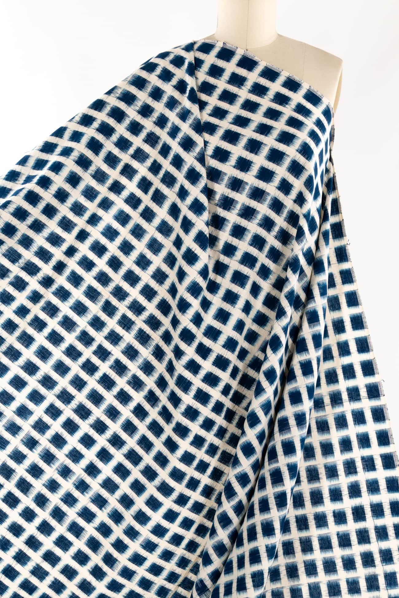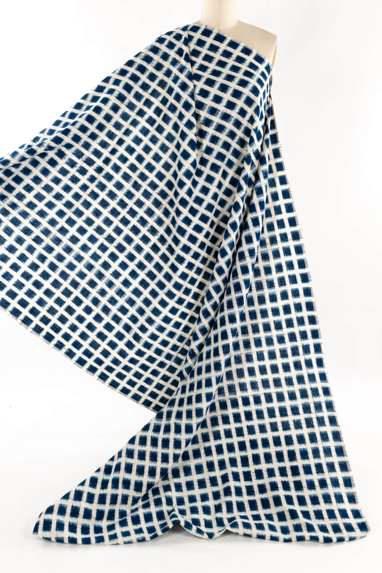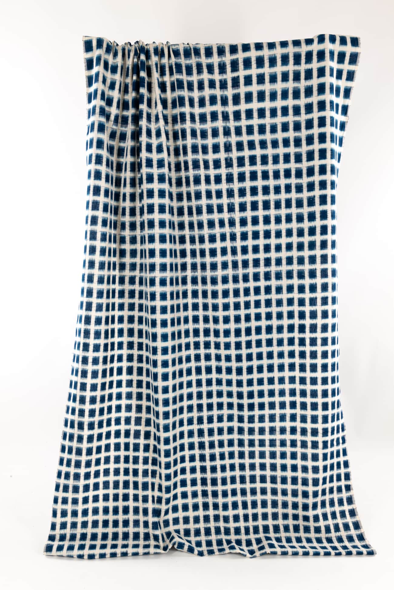 Clear blue and white double ikat rectangles, in a hand-woven cotton from India that is naturally blurry in a charming way. Some of the most interesting and soulful fabrics are coming out of India today where textile traditions continue. Double Ikat is a technique in which both warp and the weft are resist-dyed prior to weaving, so it it is the most difficult to make and more expensive to produce. Mid/light weight, opaque with a lightly textured appealing cool hand, and airy drape. The weight is right for a tunic, shirt, light jacket, vest, dress, skirt or soft pants.