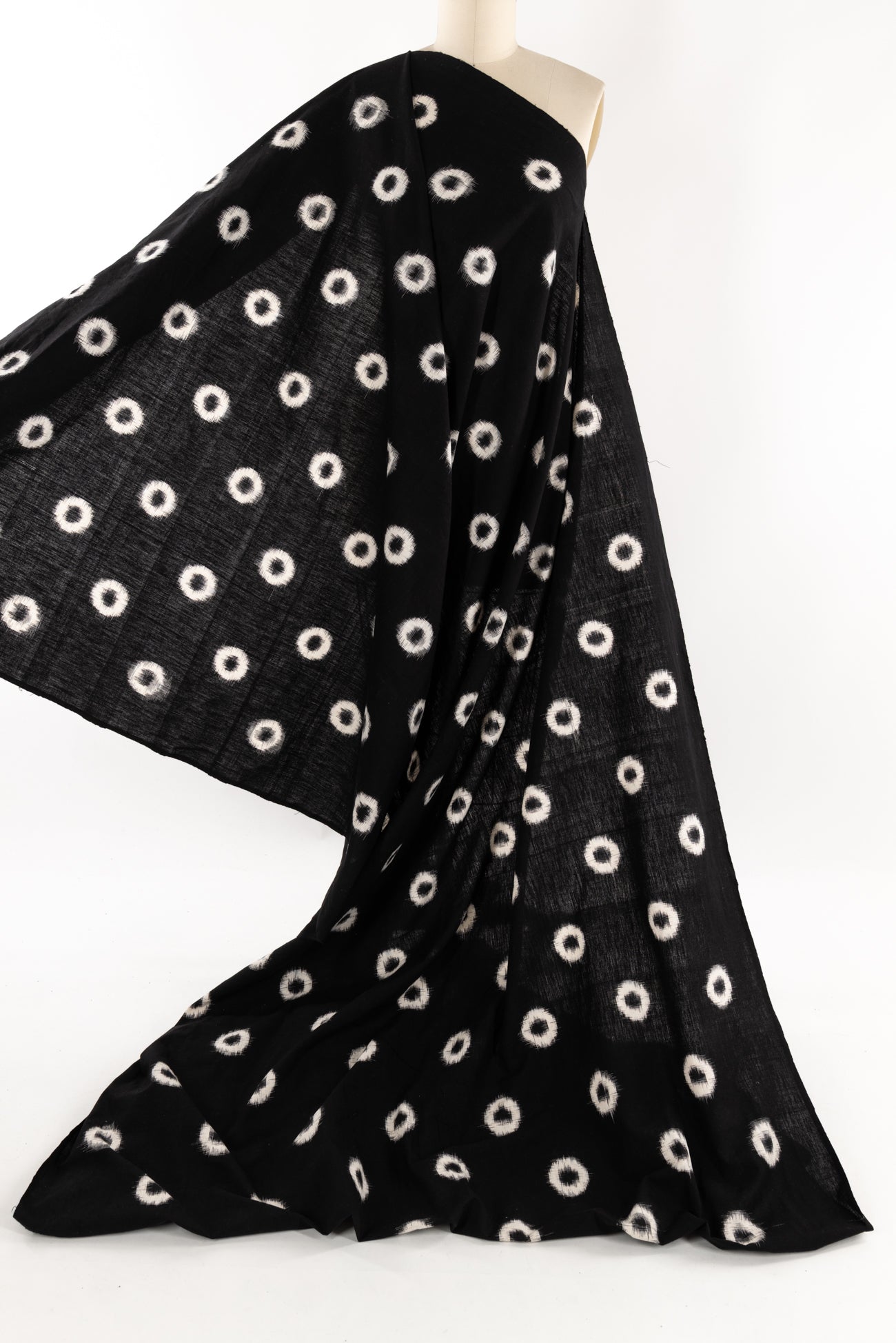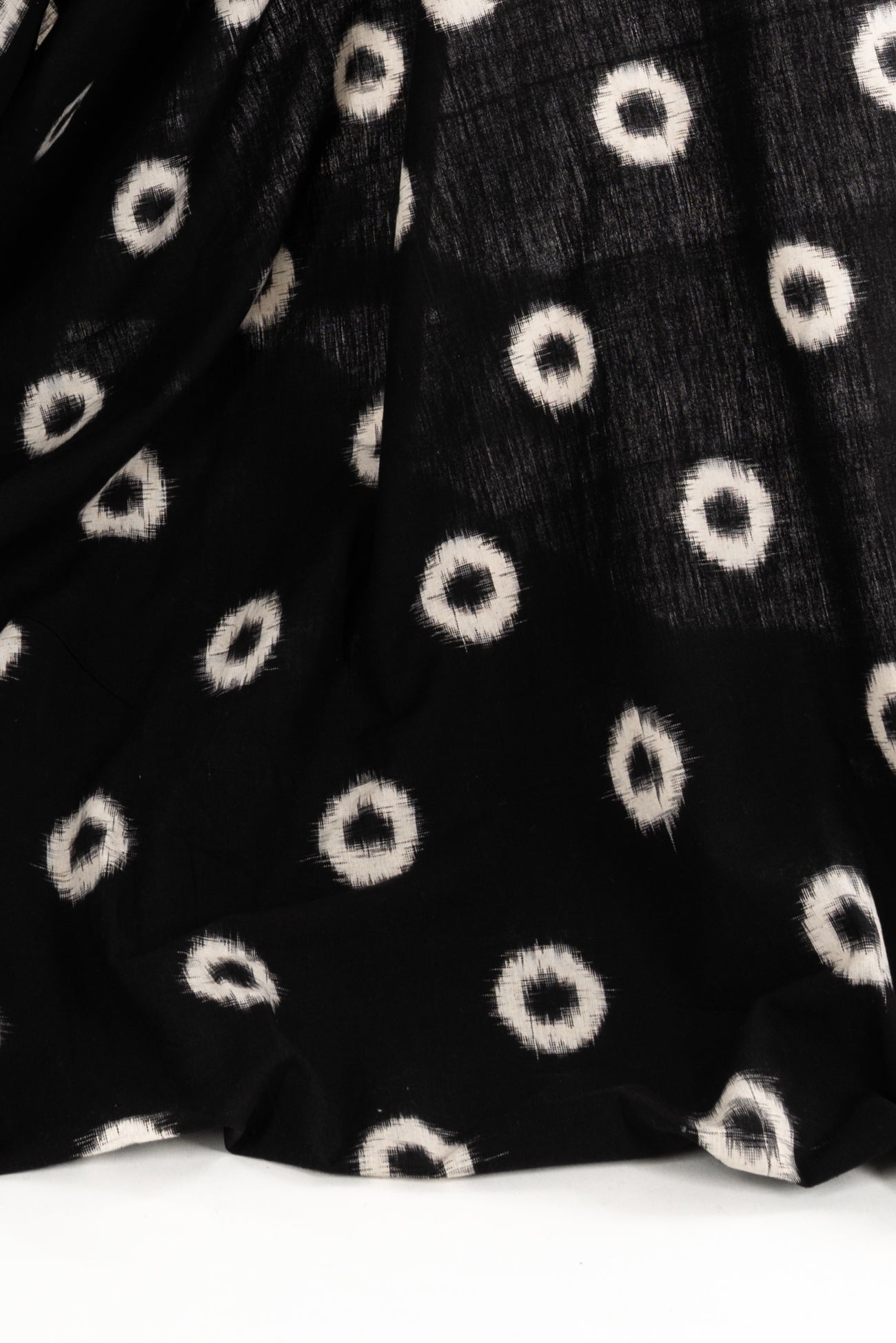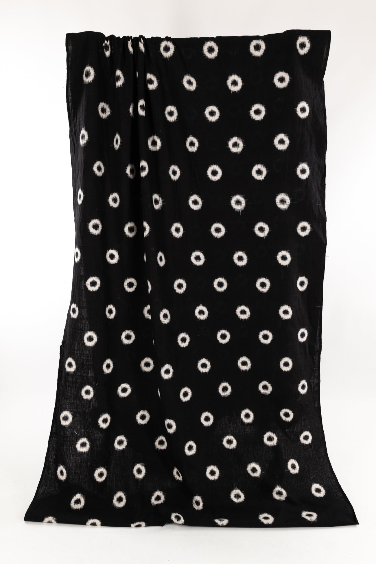 Charming circles in a warm white on black double ikat, a hand-woven cotton from India that is naturally blurry in an appealing way. Some of the most interesting and soulful fabrics are coming out of India today where textile traditions continue. Double Ikat is a technique in which both warp and the weft are resist-dyed prior to weaving, so it it is the most difficult to make and more expensive to produce. Light weight, opaque with a lightly textured appealing cool hand, and airy drape. The weight is right for a tunic, shirt, light jacket, vest, dress, skirt, caftan or soft pants.