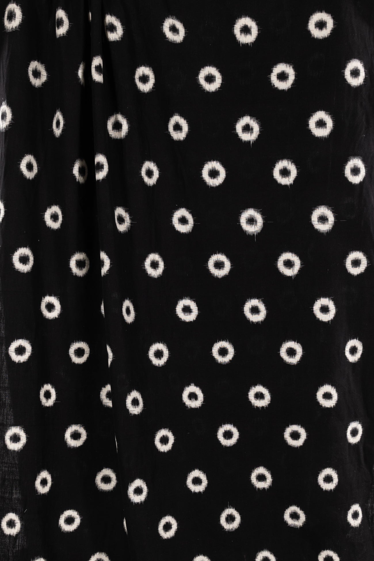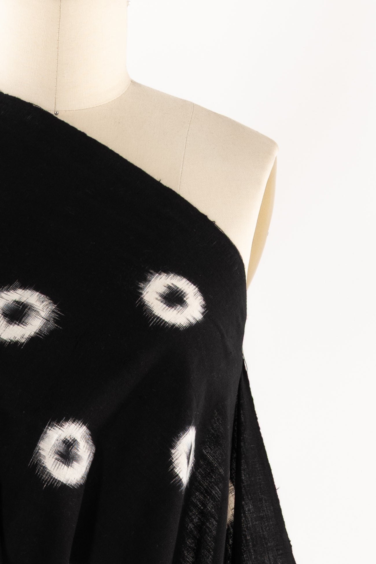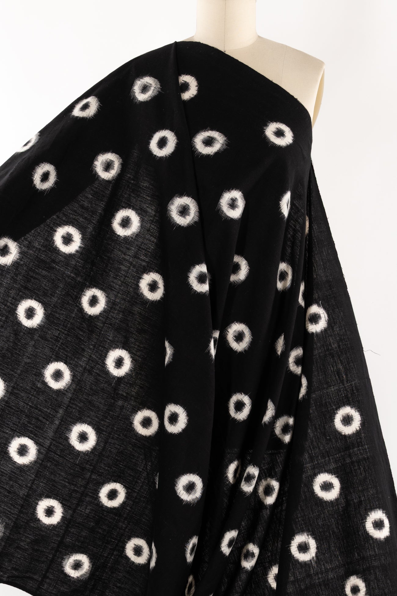 Charming circles in a warm white on black double ikat, a hand-woven cotton from India that is naturally blurry in an appealing way. Some of the most interesting and soulful fabrics are coming out of India today where textile traditions continue. Double Ikat is a technique in which both warp and the weft are resist-dyed prior to weaving, so it it is the most difficult to make and more expensive to produce. Light weight, opaque with a lightly textured appealing cool hand, and airy drape. The weight is right for a tunic, shirt, light jacket, vest, dress, skirt, caftan or soft pants.