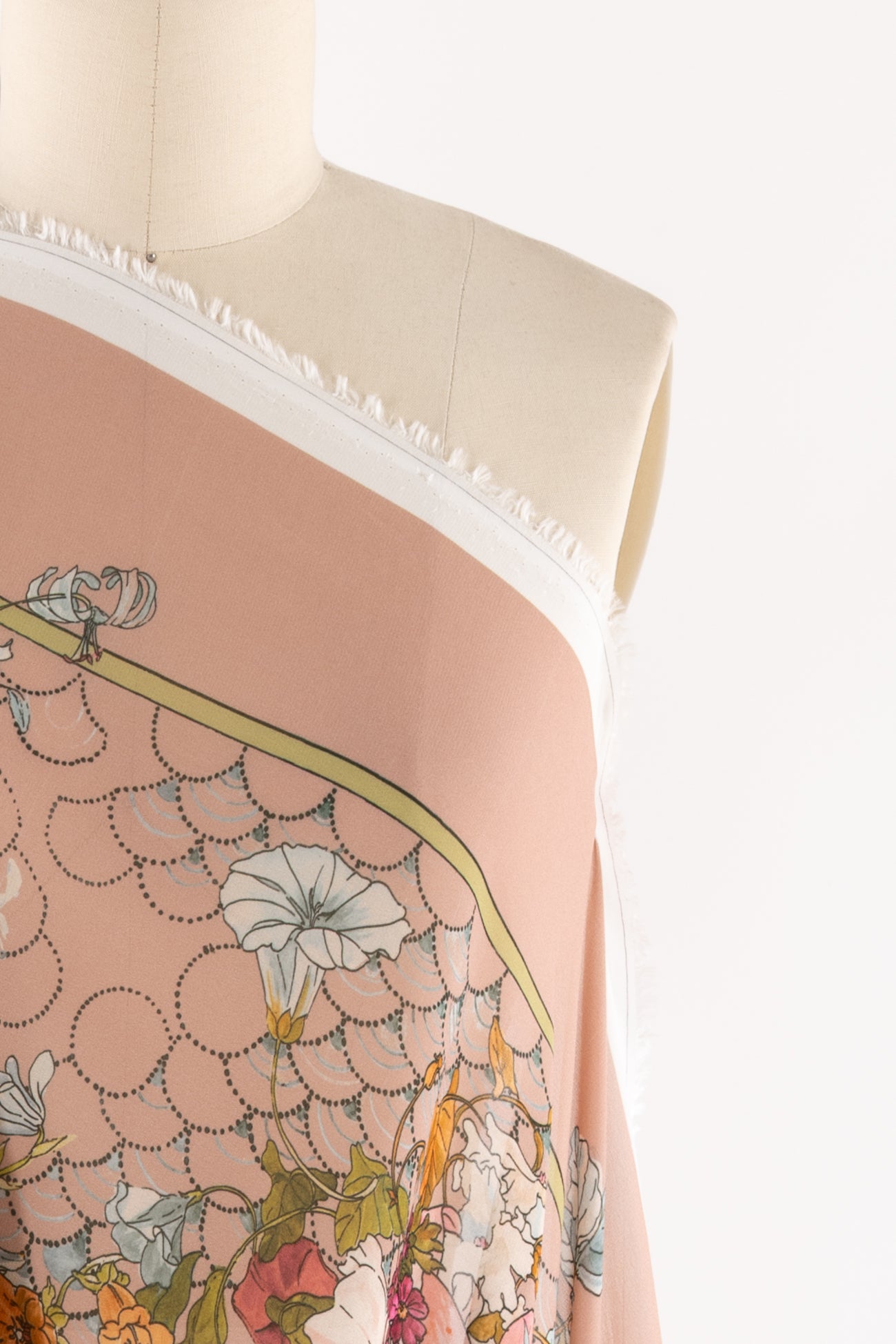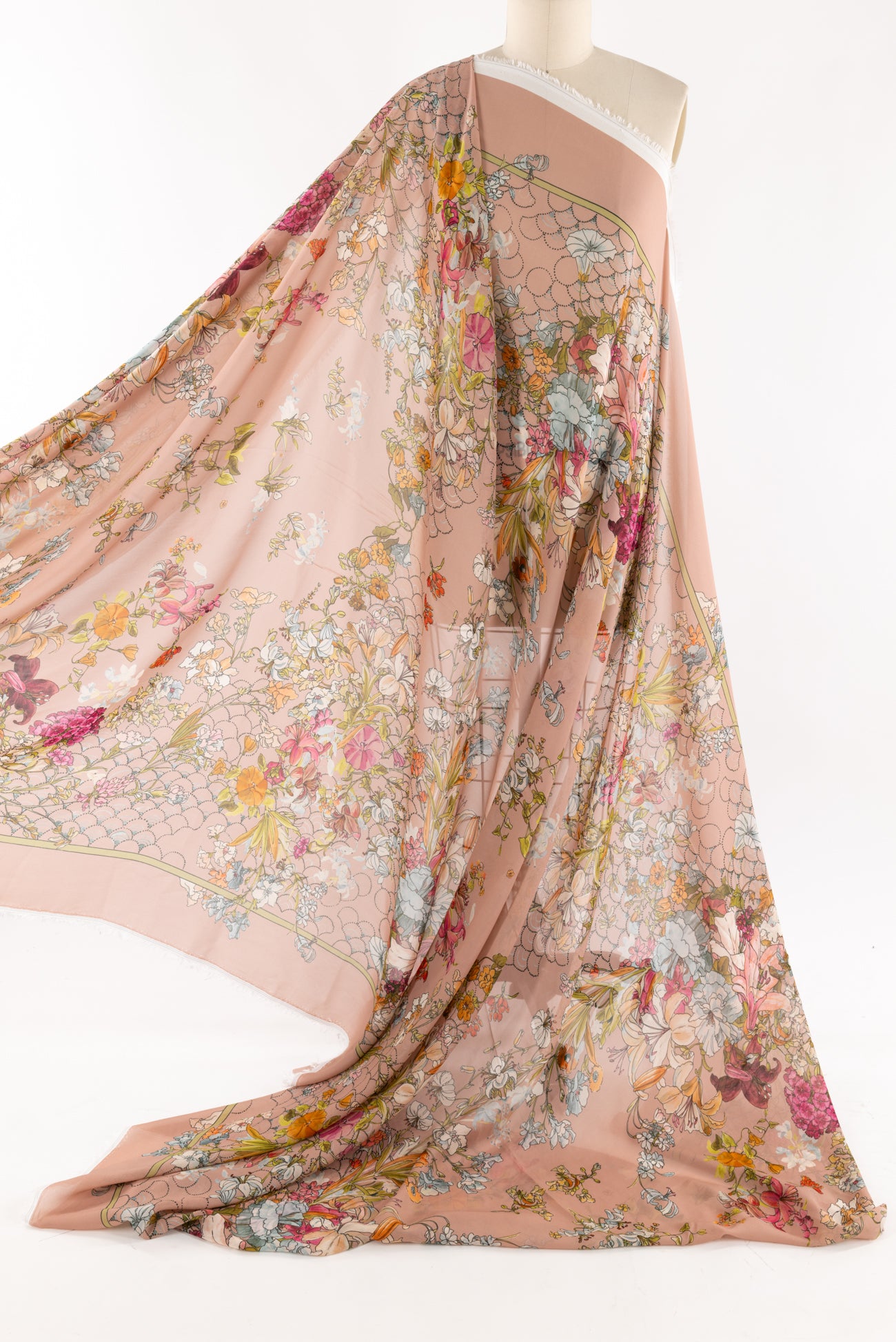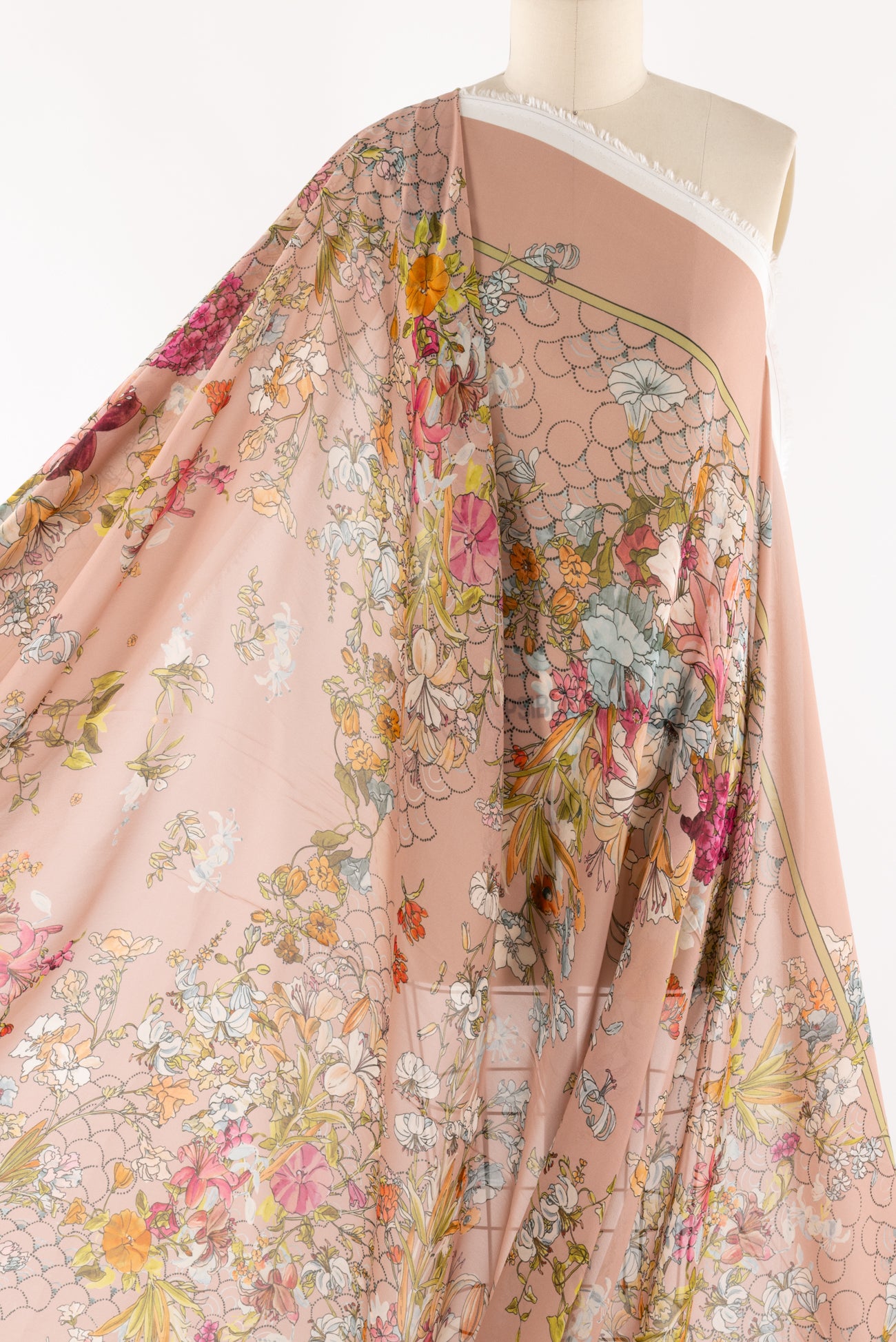 A glamorous garden of flowers accented with deep blue on dusty pink on a fine quality viscose georgette. Beautiful dramatic deadstock from Dolce & Gabbana, milled in Italy. Lightweight, semi-opaque, with a cool soft matte hand and airy drape. One-way design with a 37¼" repeat. Right for a dress, tunic, top, shirt, skirt, soft pant, loungewear or kimono. Limited quantity available.