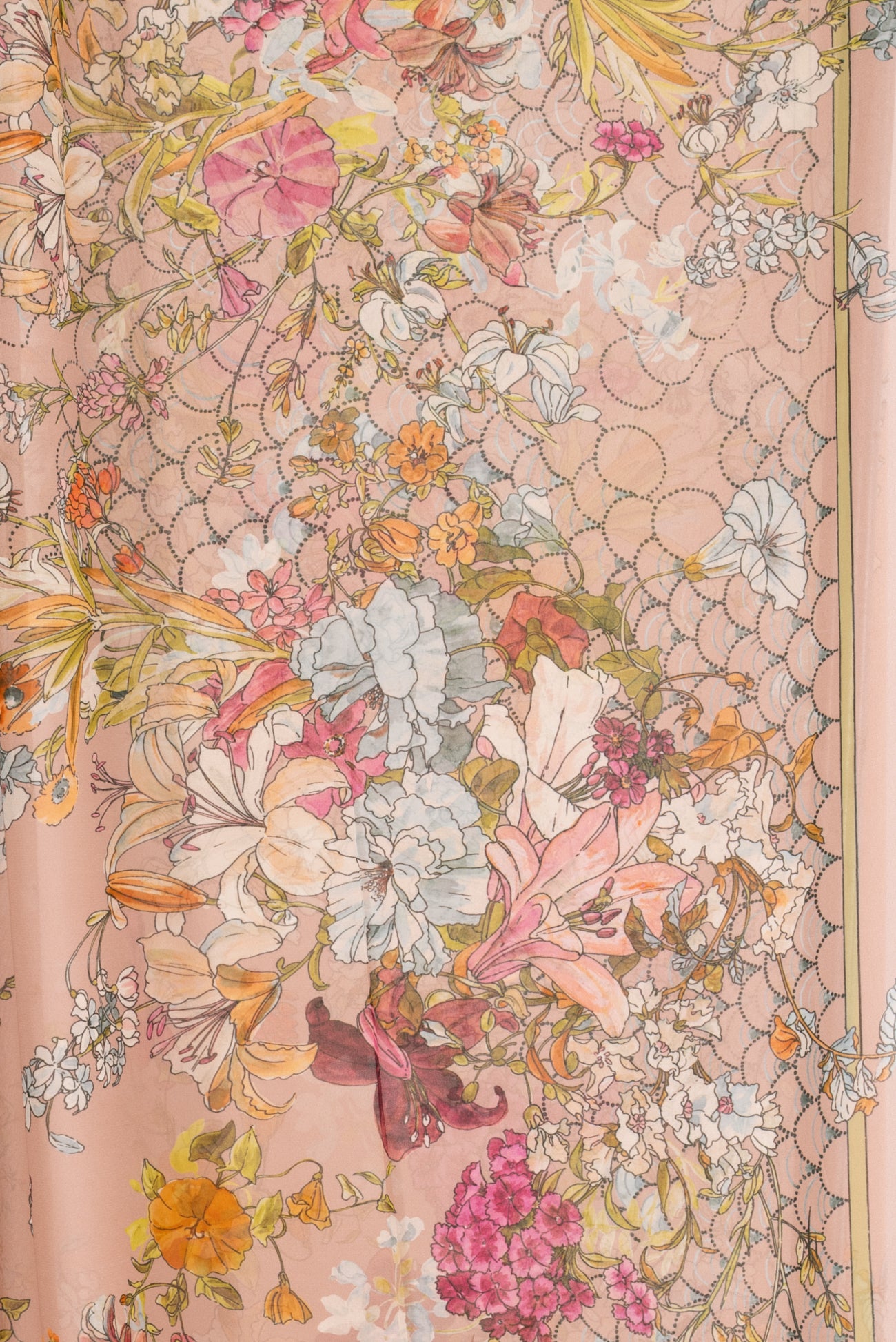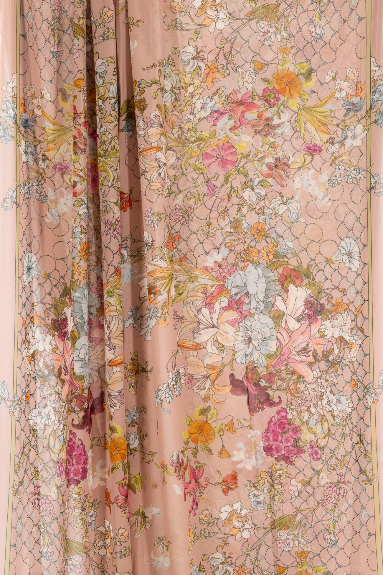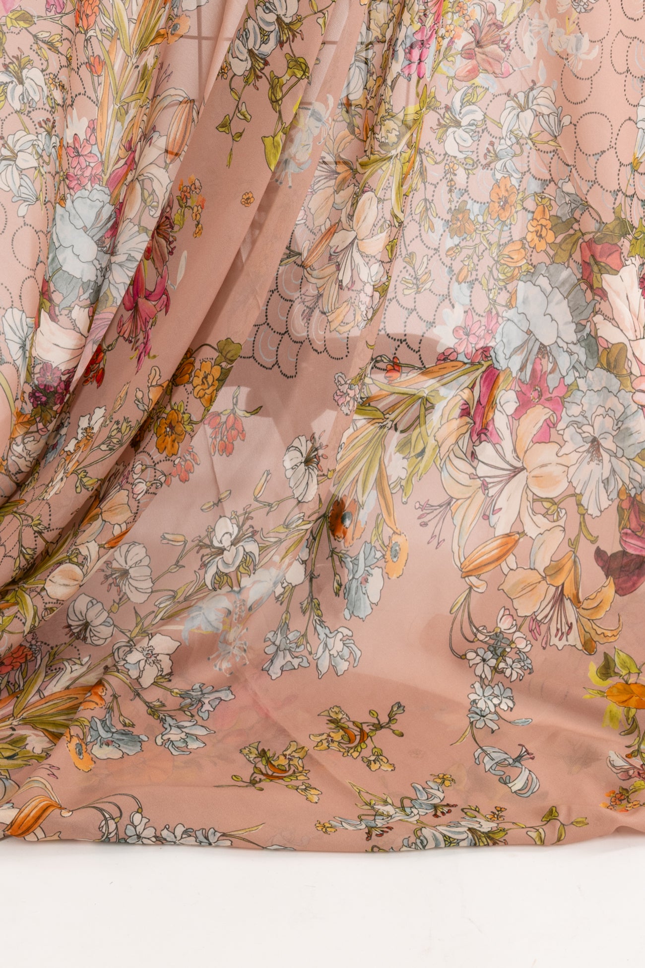 A glamorous garden of flowers accented with deep blue on dusty pink on a fine quality viscose georgette. Beautiful dramatic deadstock from Dolce & Gabbana, milled in Italy. Lightweight, semi-opaque, with a cool soft matte hand and airy drape. One-way design with a 37¼" repeat. Right for a dress, tunic, top, shirt, skirt, soft pant, loungewear or kimono. Limited quantity available.