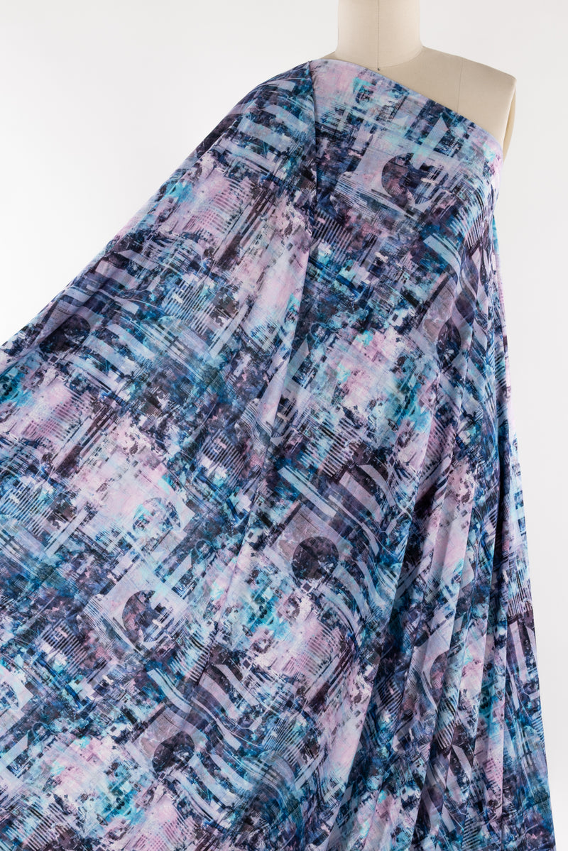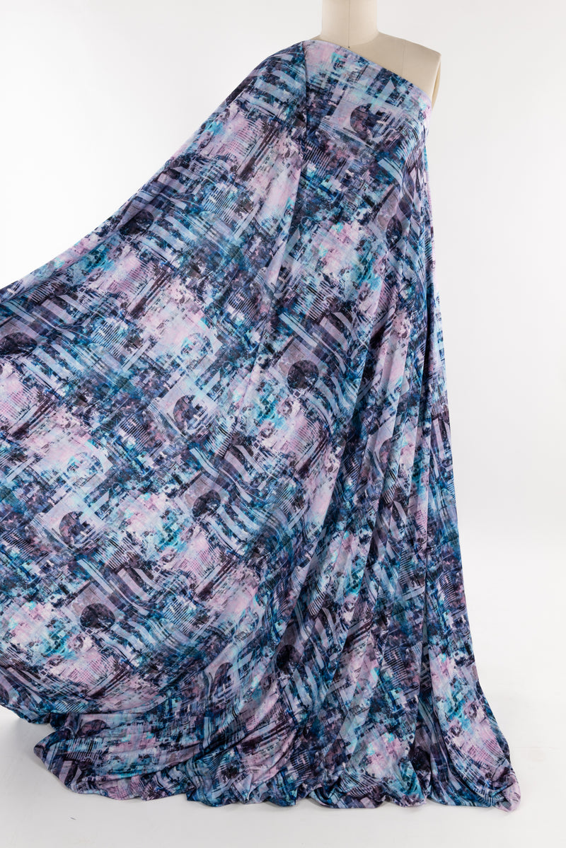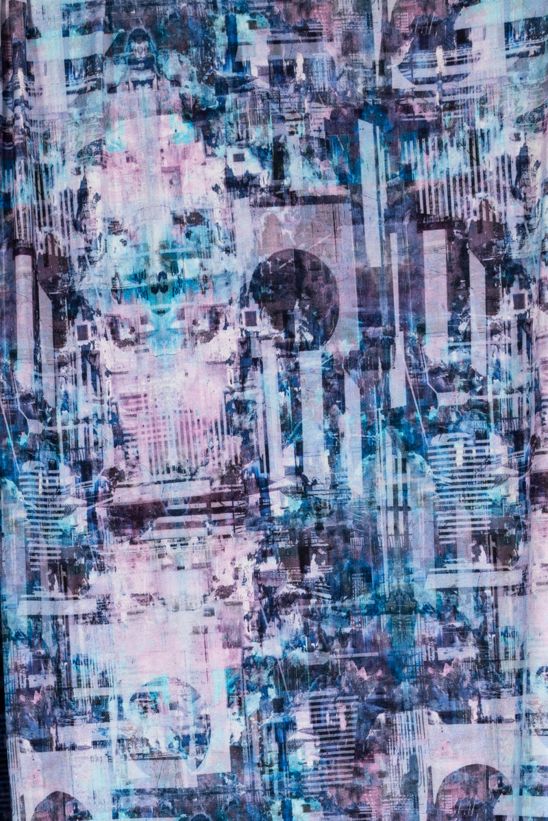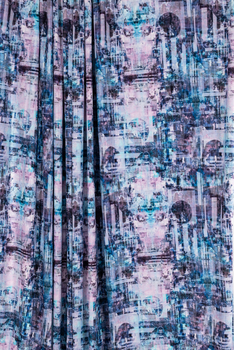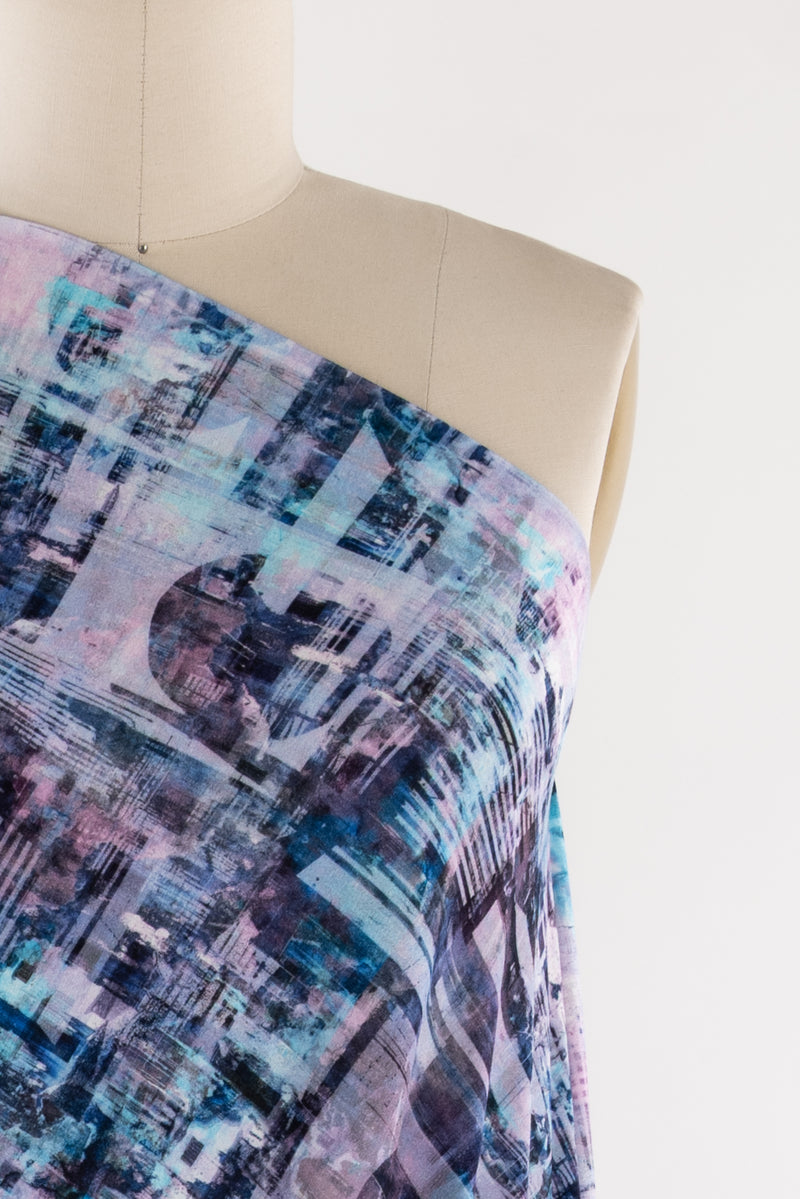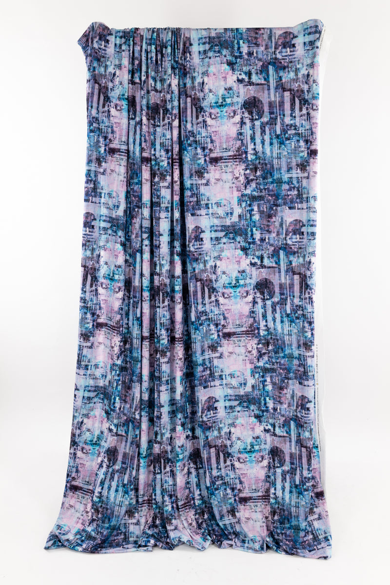 An arty abstract cityscape in pastel tints of aqua, pink, and purple, in a gorgeous digital print on an impeccable European quality viscose/spandex jersey knit, produced in Denmark. Light/mid-weight, opaque, and will skim the body in a flattering way. With a soft smooth hand, fluid drape, 4-way stretch, and some rolling at the cut edge. Right for a variety of garments; t-shirt, tunic, dress, soft pants, leggings, cardigan, skirt, loungewear, or children's. Oeko-Tex® certified. One-way design, 21" repeat.