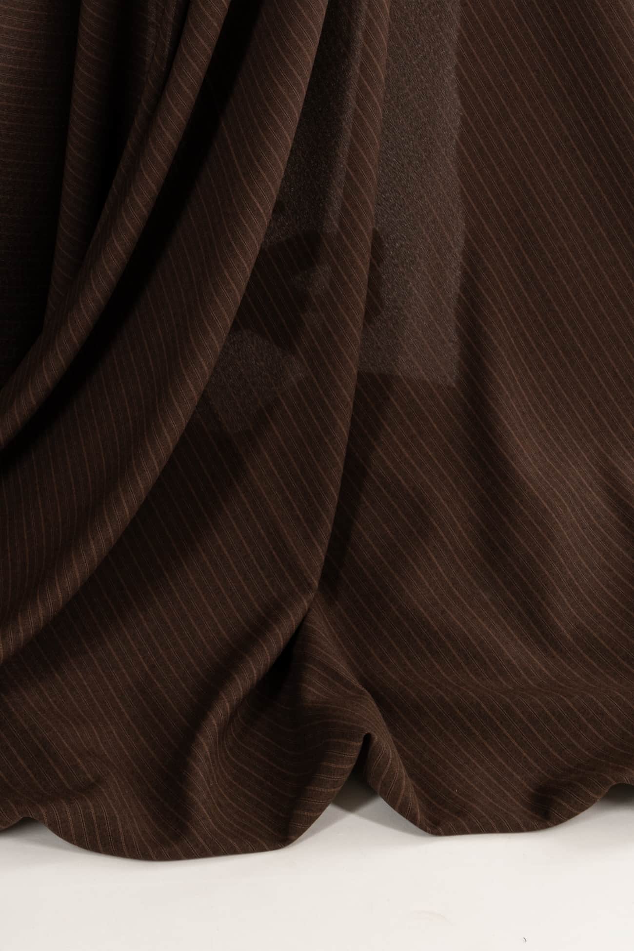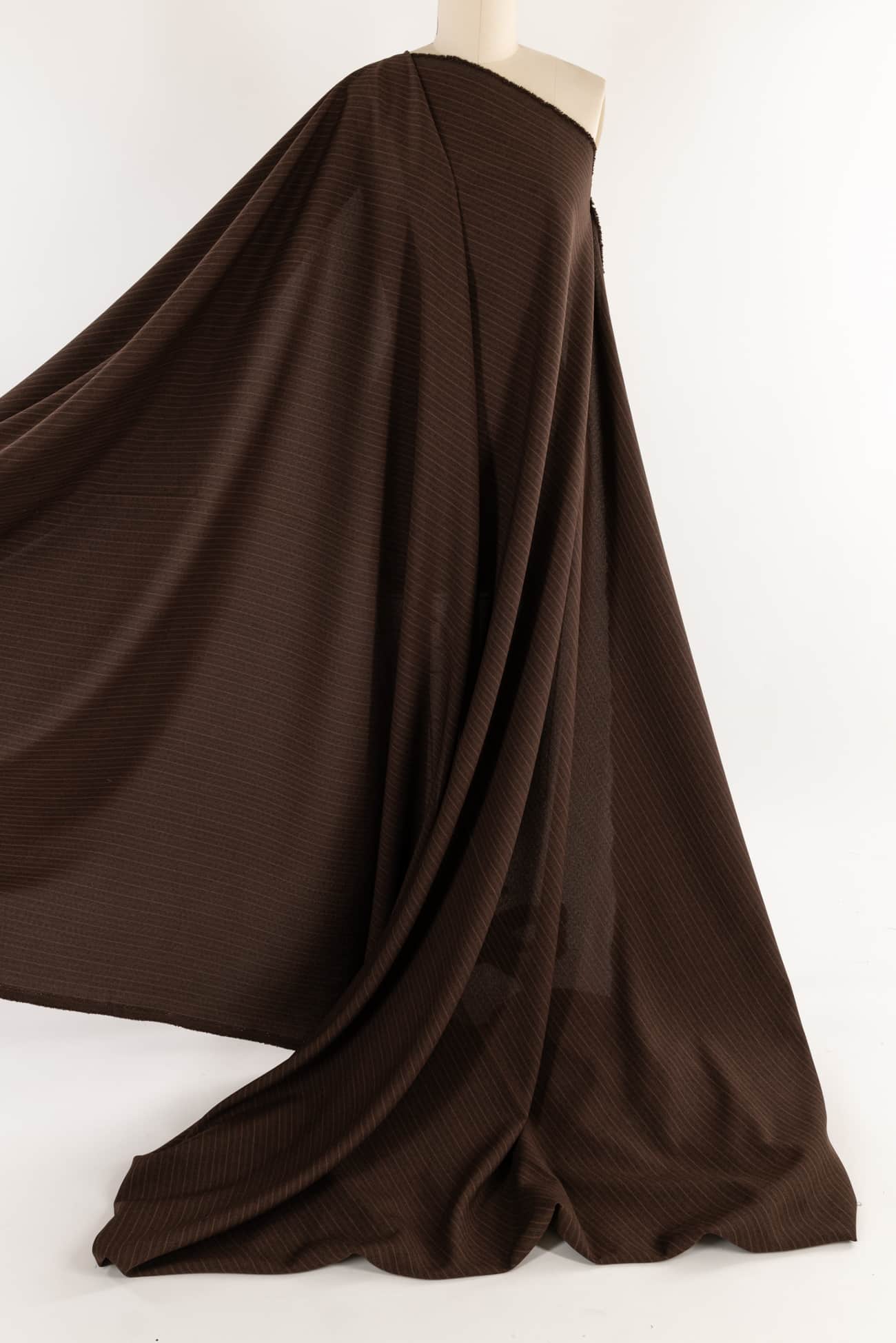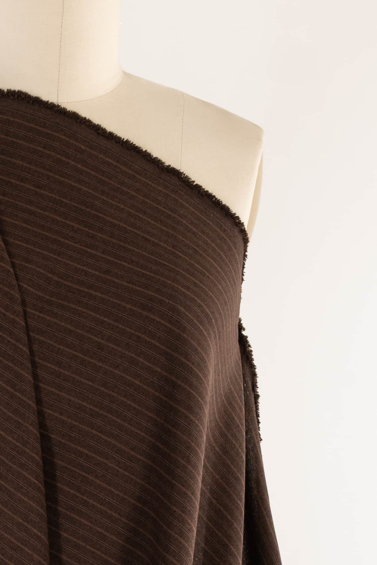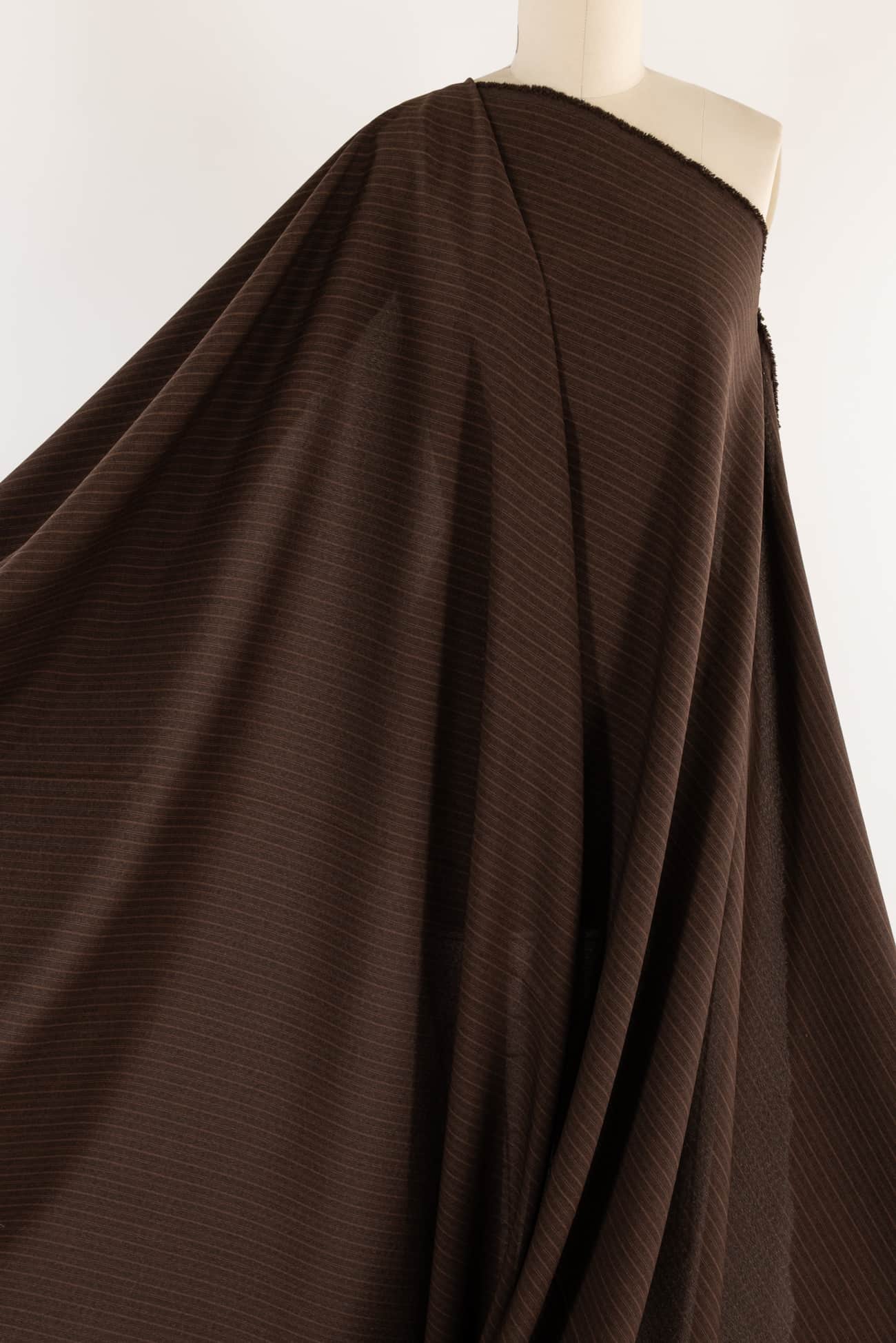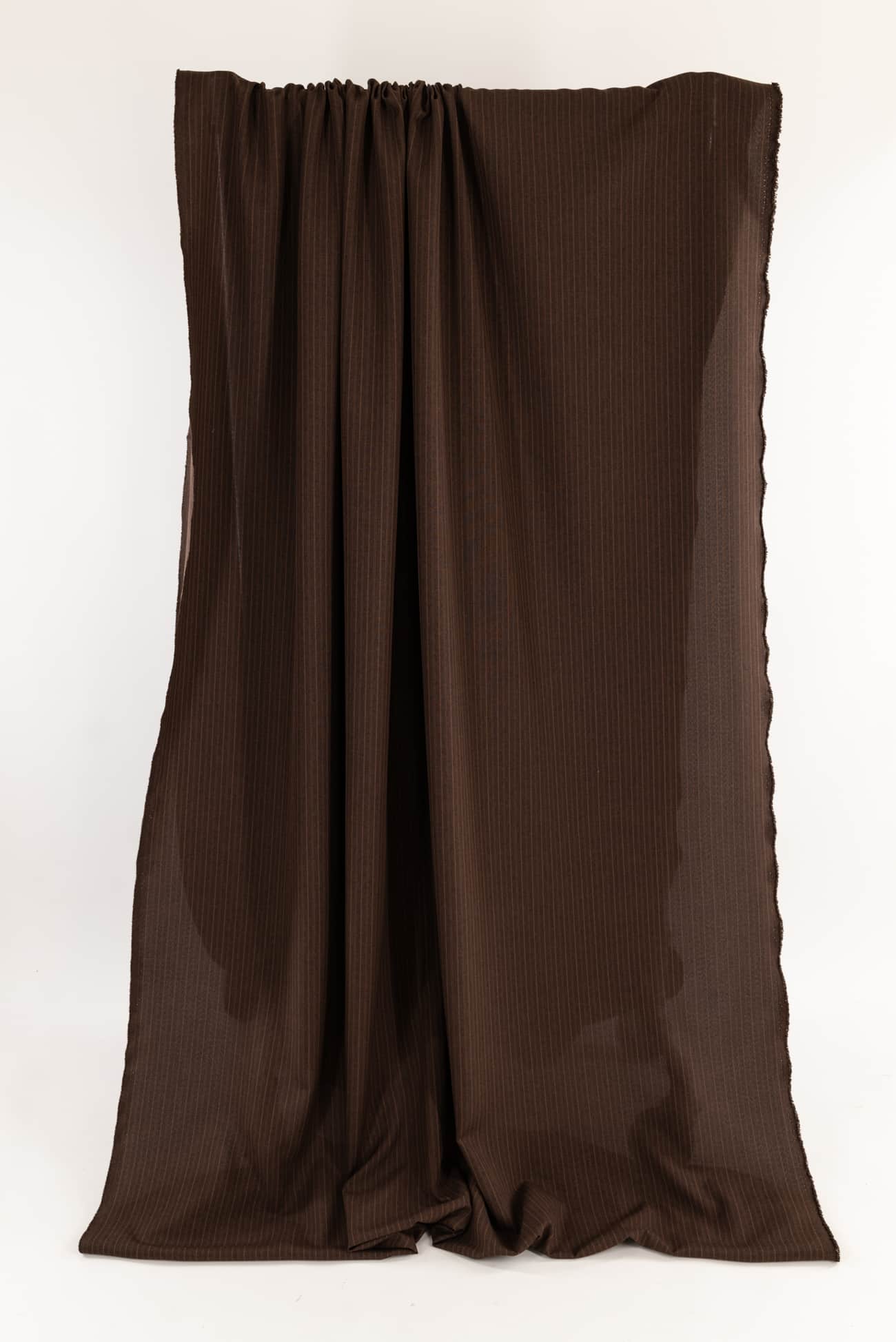 Quiet yarn-dyed stripe in trending brown saddle brown and black. LA designer deadstock is light/shirting weight, opaque, with a smooth cool dry hand and fluid drape. Right for a shirt, dress, blouse, tunic, skirt, soft pant, caftan, kimono, children's or men's.