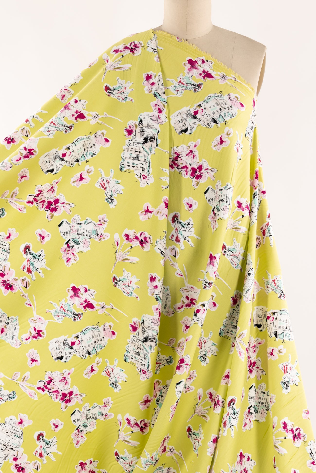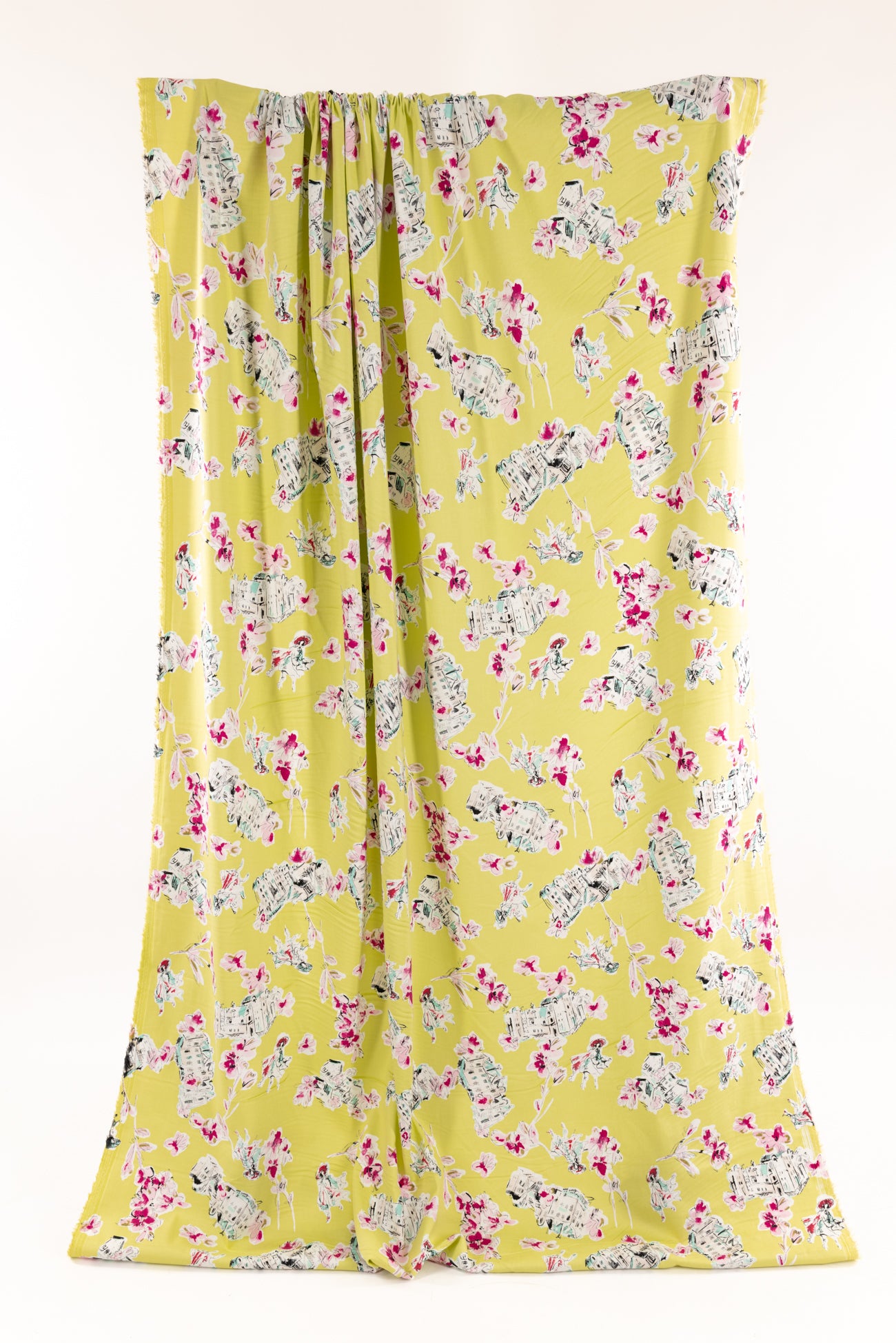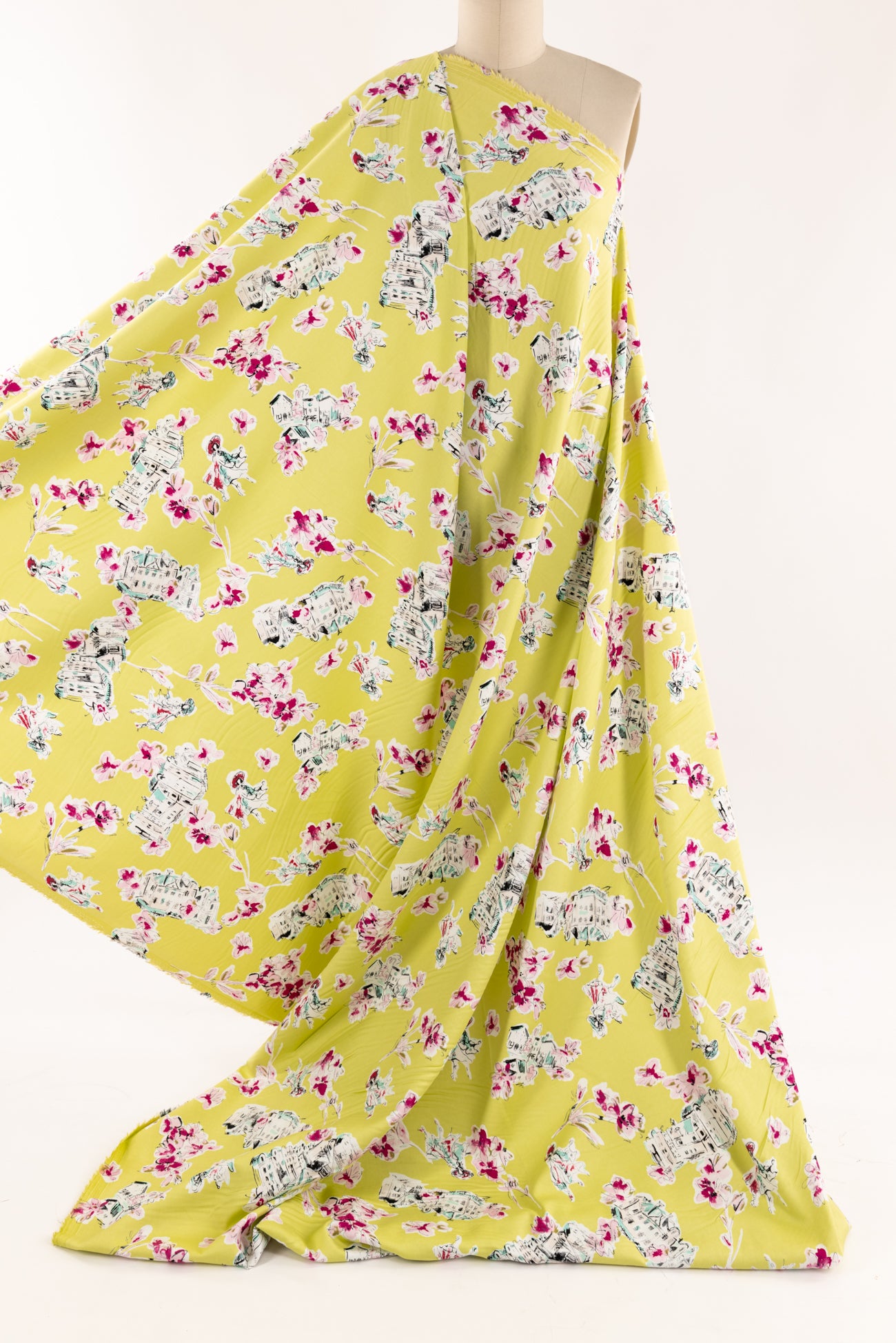 Lively flowers, figures, and a village create the romance in this acid green, pink, turquoise, and white print. Lightweight cotton with a smooth malleable hand, a 24½" repeat, and soft drape. Just right for a shirt, tunic, top, vest, pants, or dress.