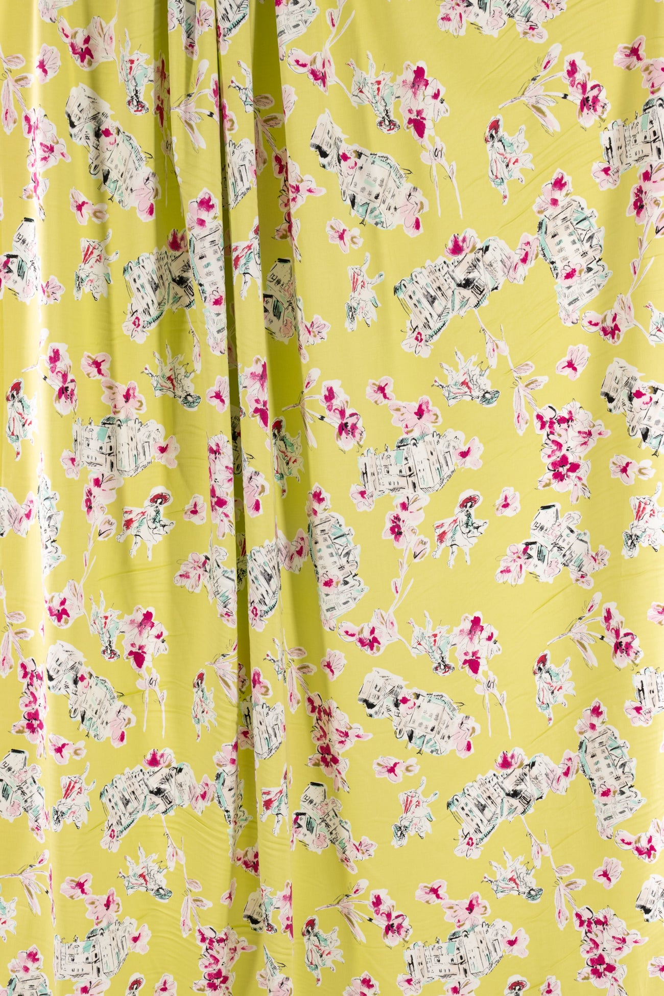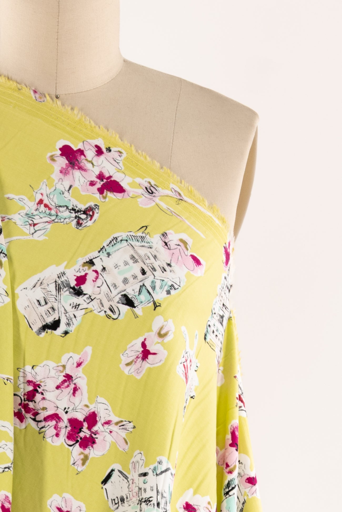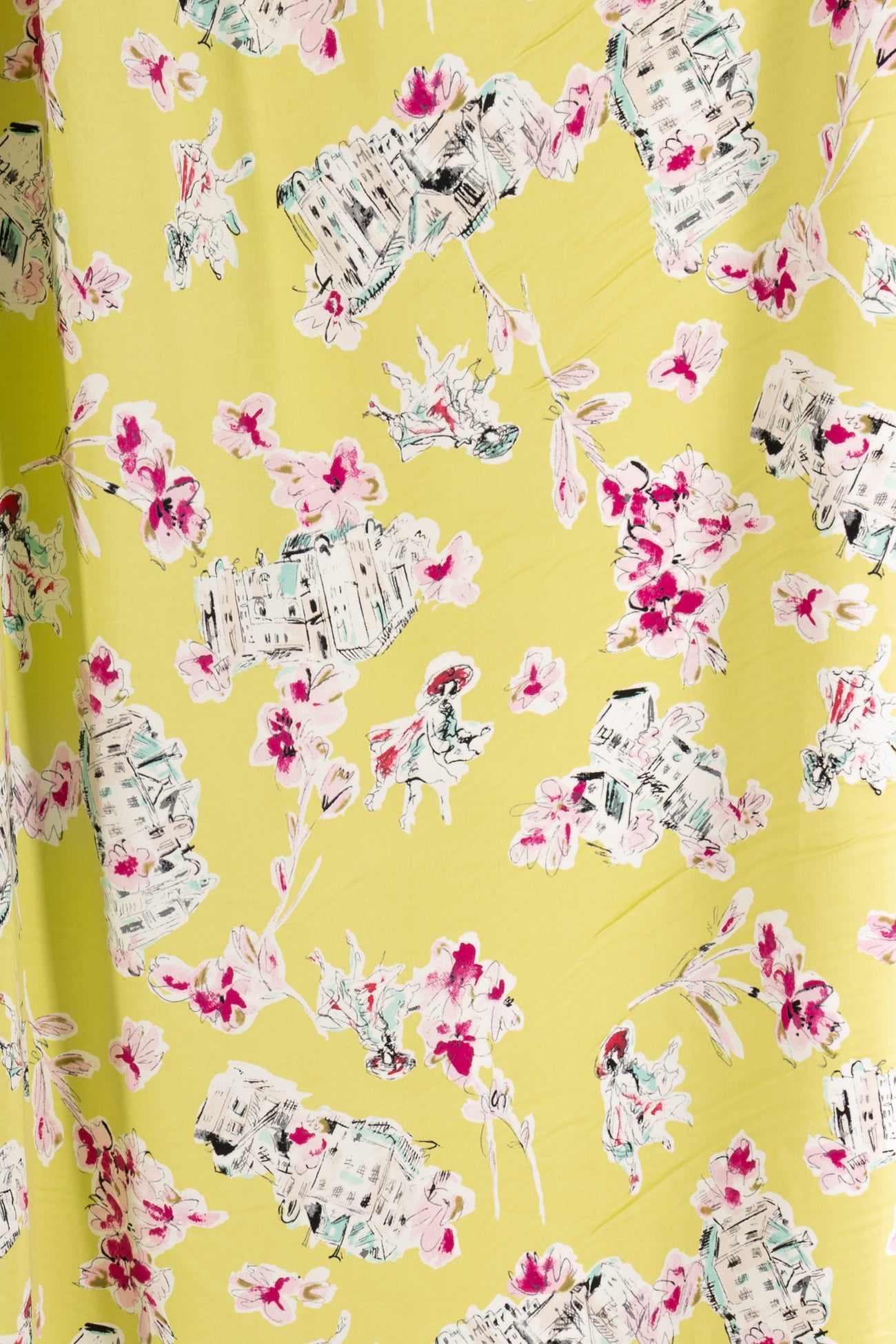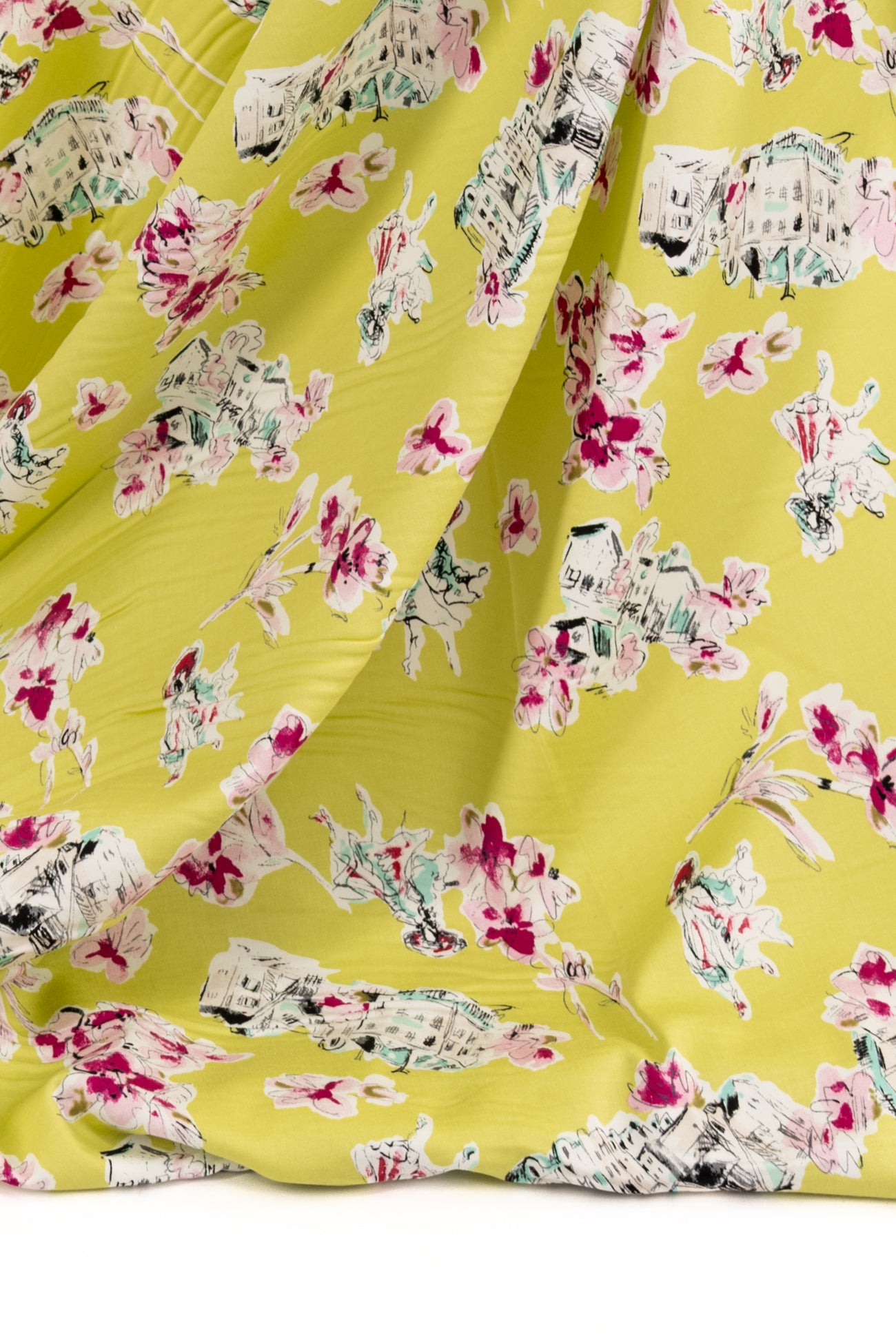 Lively flowers, figures, and a village create the romance in this acid green, pink, turquoise, and white print. Lightweight cotton with a smooth malleable hand, a 24½" repeat, and soft drape. Just right for a shirt, tunic, top, vest, pants, or dress.