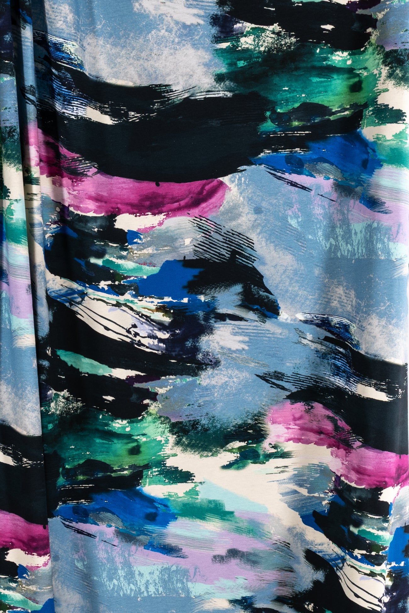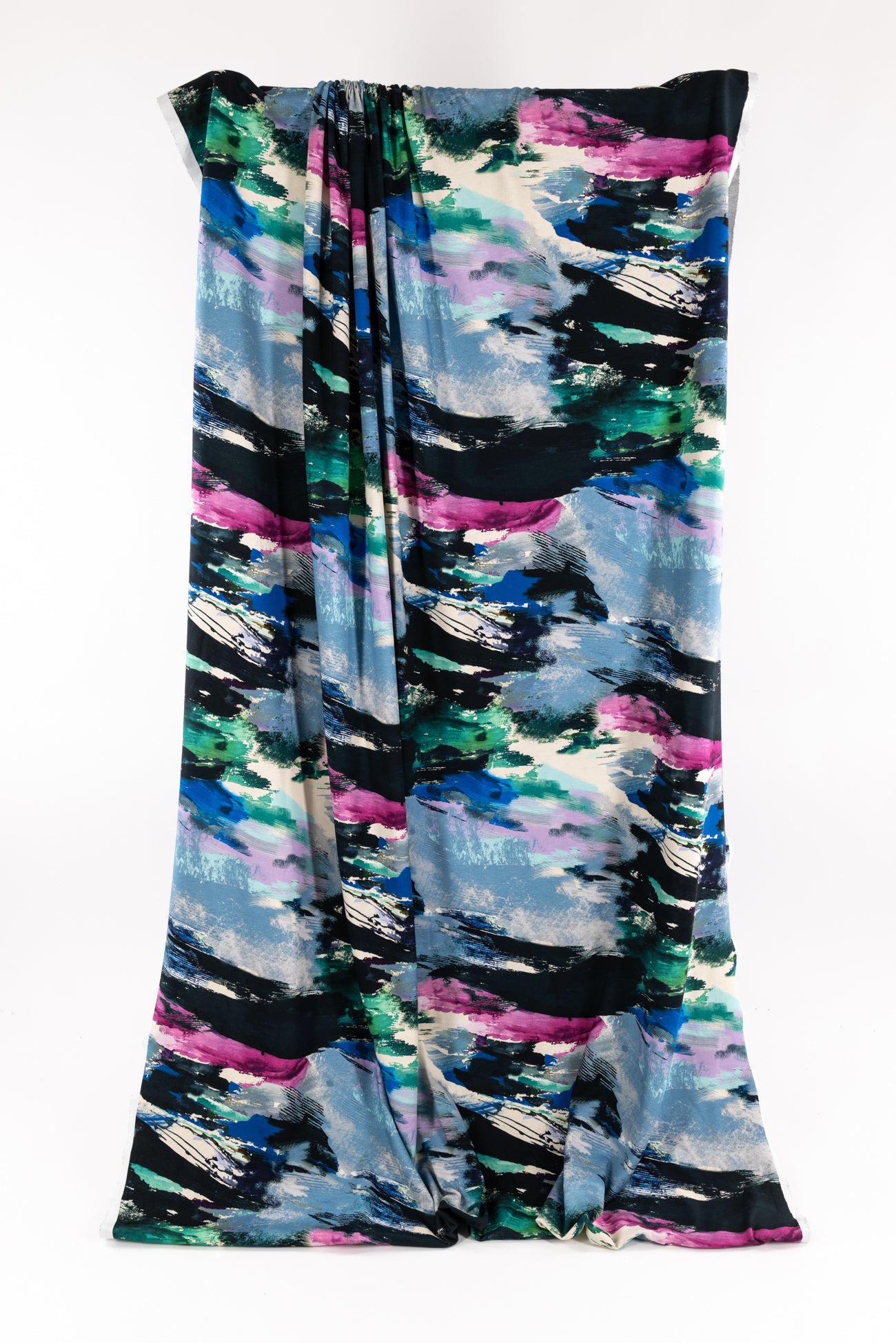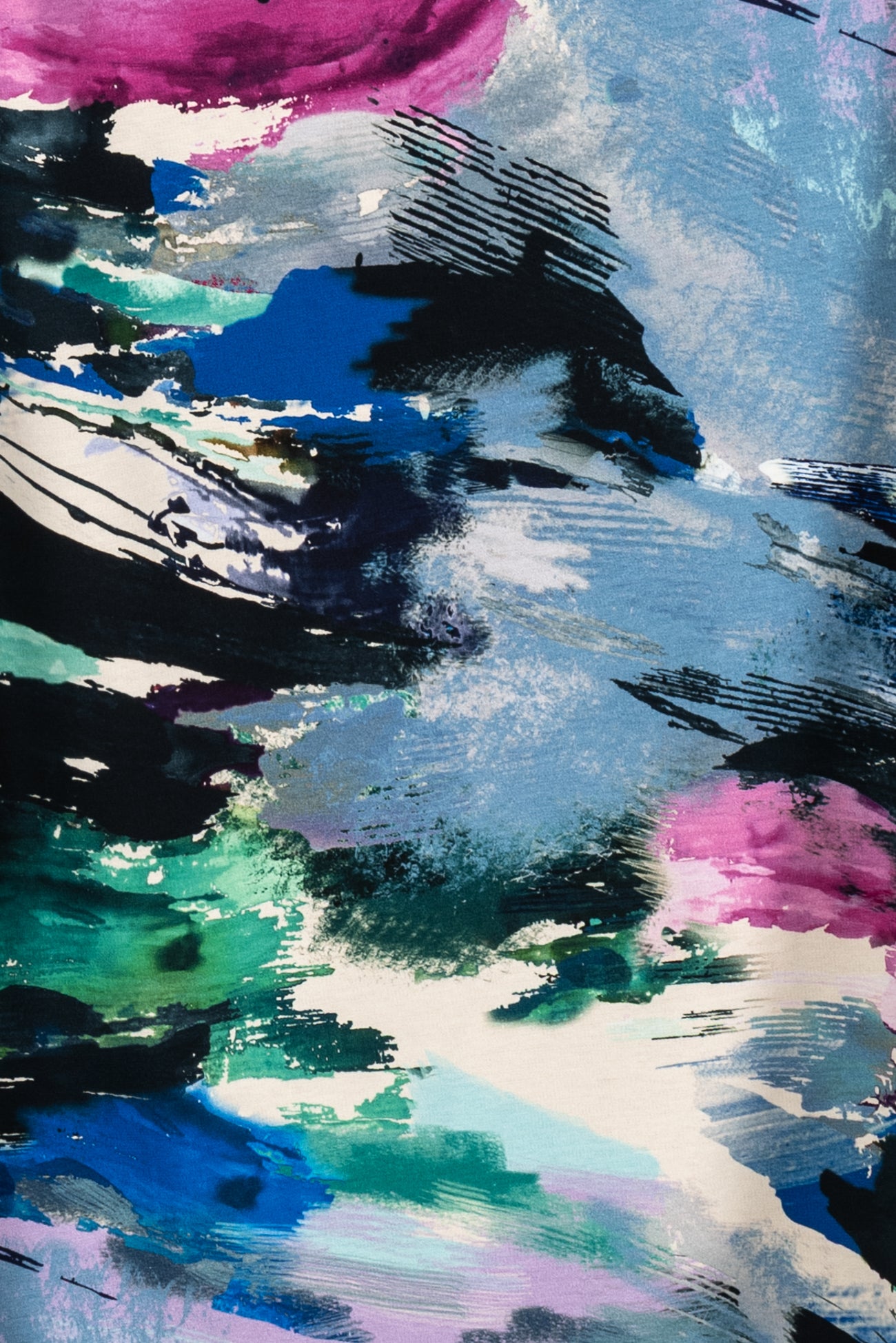 Stunning abstract digital print with vivid 'hand-painted' gestures in shades of blues and pinks accented with black, on an impeccable quality cream ponte double knit, deadstock from an Italian mill. Printed ponte is rare and this one is outstanding! Mid/light weight, with a soft dry hand, fluid drape, 32¼" repeat and crosswise stretch. Stable, no rolling at the cut edge, easy to sew and will skim the body in a flattering way. Right for both tops and bottoms; dress, tunic, t-shirt, skirt, jacket, light coat, hoodie, pants, jumpsuit, kimono or caftan.