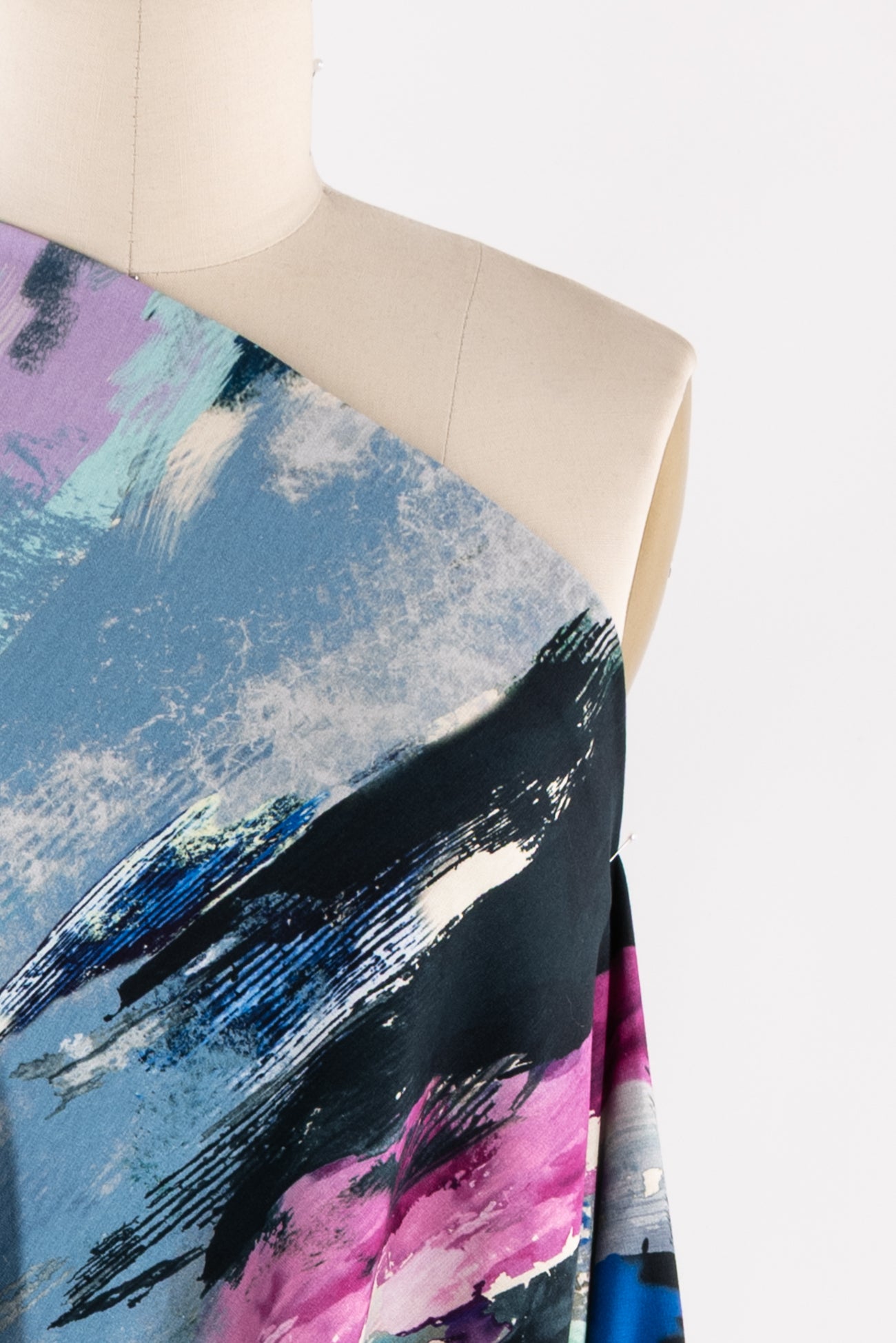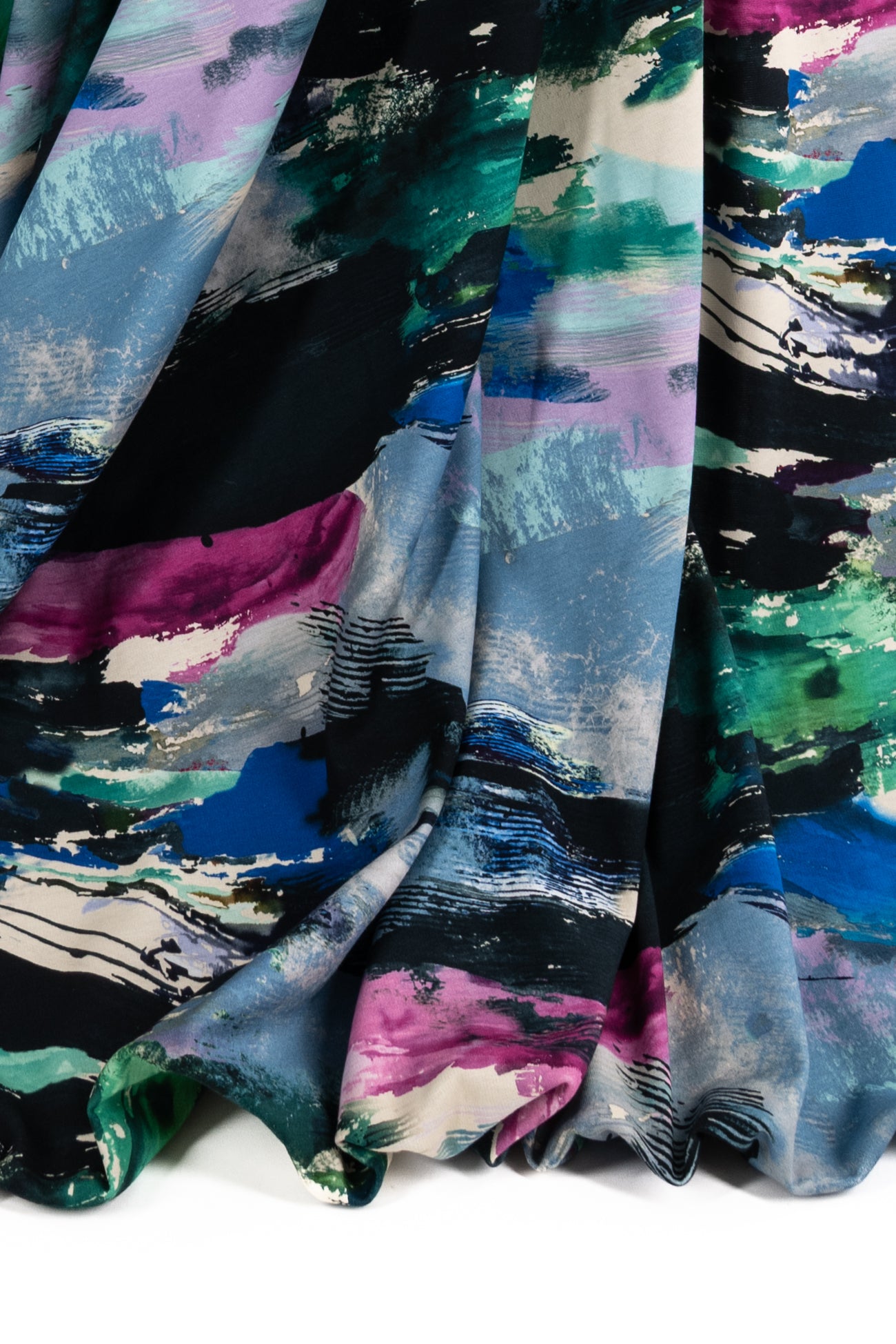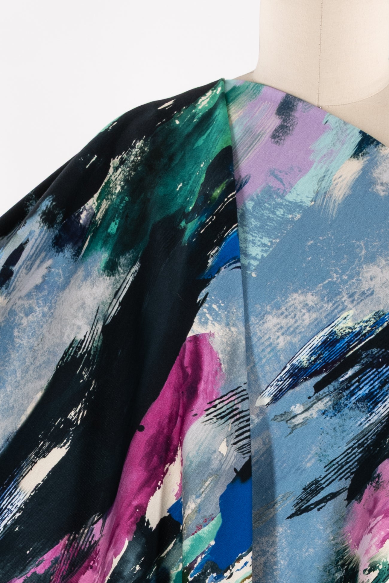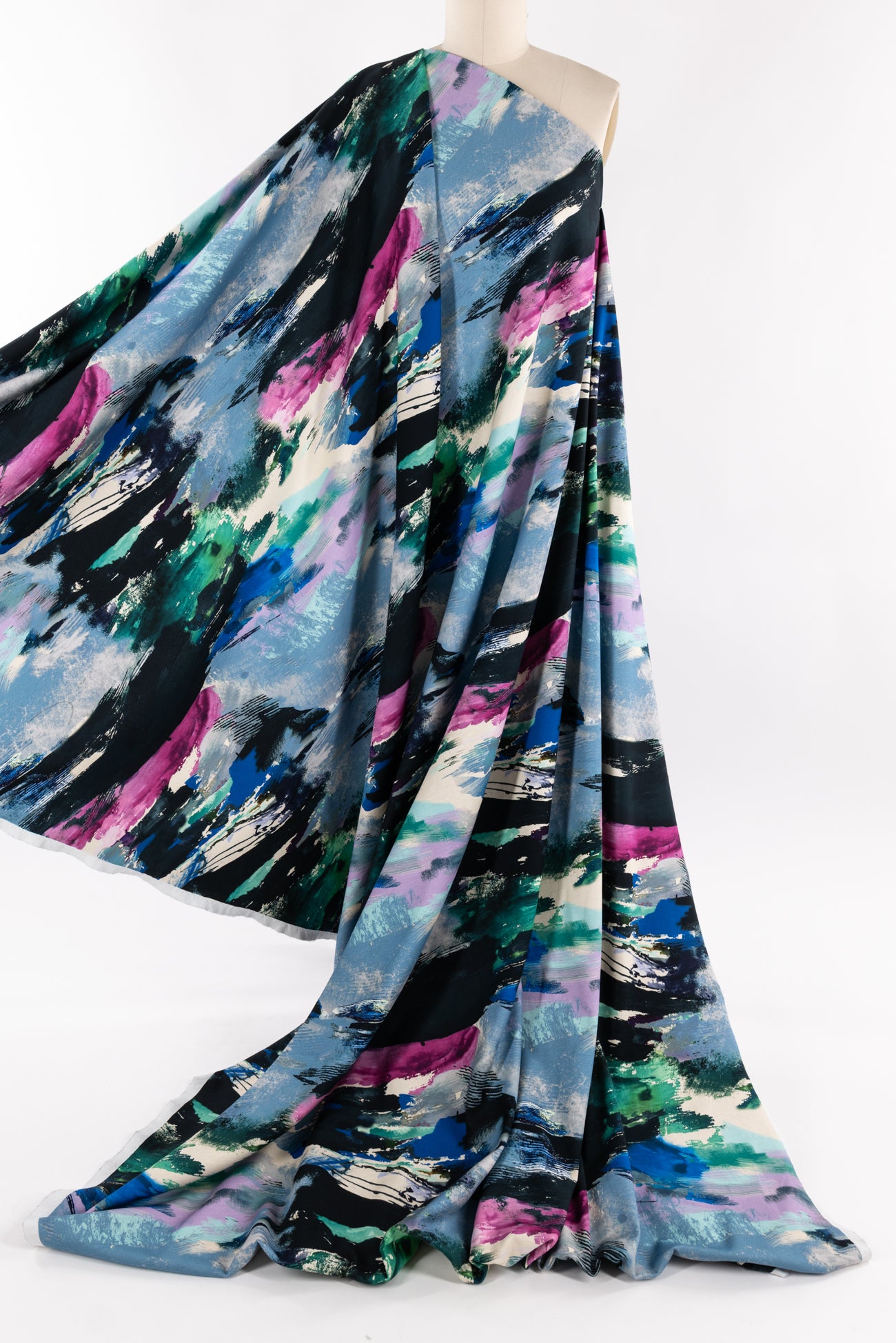 Stunning abstract digital print with vivid 'hand-painted' gestures in shades of blues and pinks accented with black, on an impeccable quality cream ponte double knit, deadstock from an Italian mill. Printed ponte is rare and this one is outstanding! Mid/light weight, with a soft dry hand, fluid drape, 32¼" repeat and crosswise stretch. Stable, no rolling at the cut edge, easy to sew and will skim the body in a flattering way. Right for both tops and bottoms; dress, tunic, t-shirt, skirt, jacket, light coat, hoodie, pants, jumpsuit, kimono or caftan.