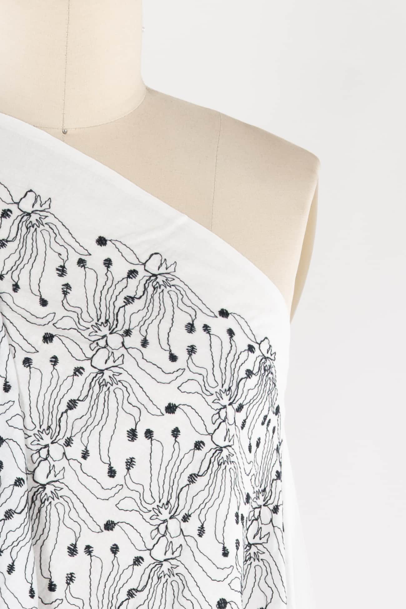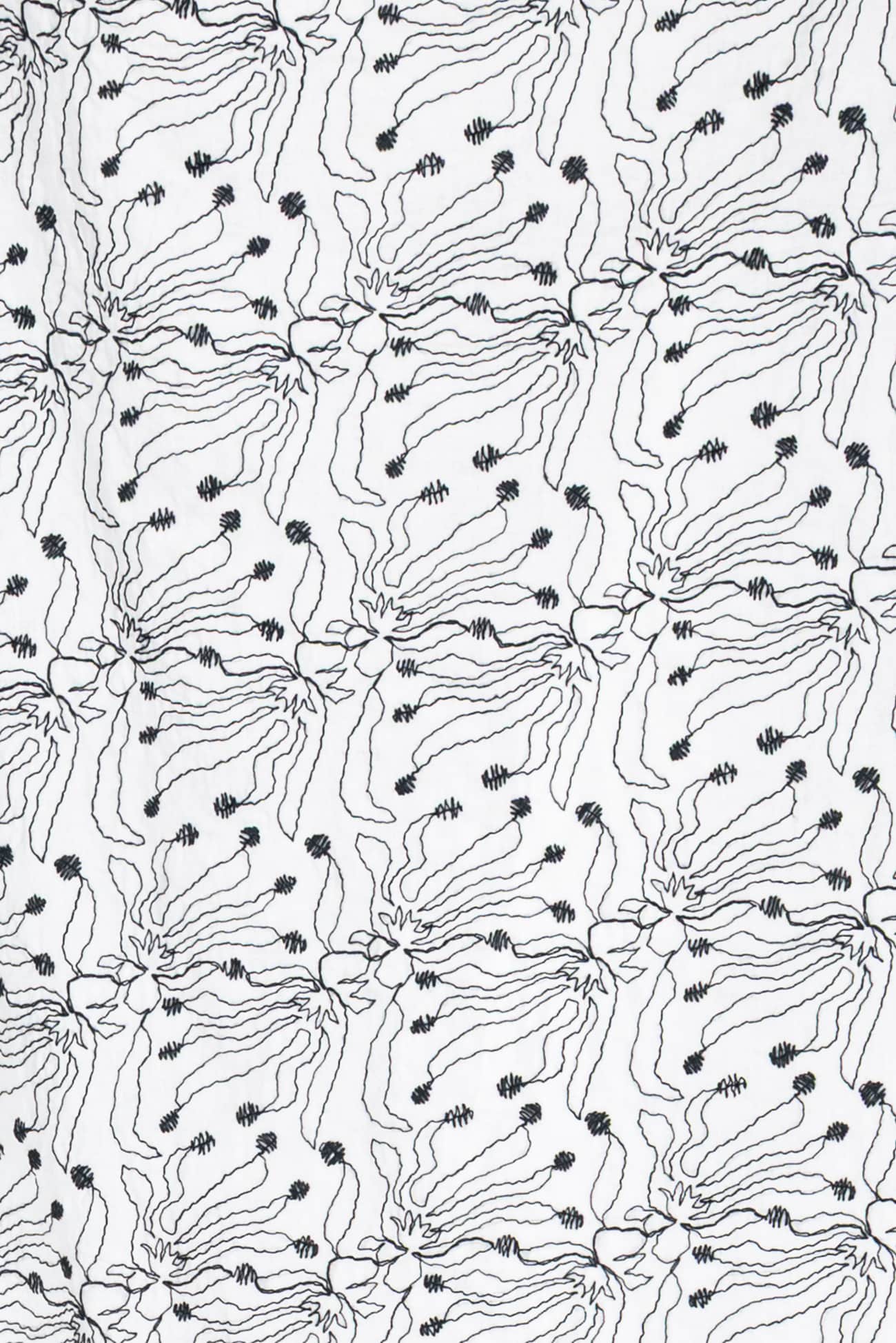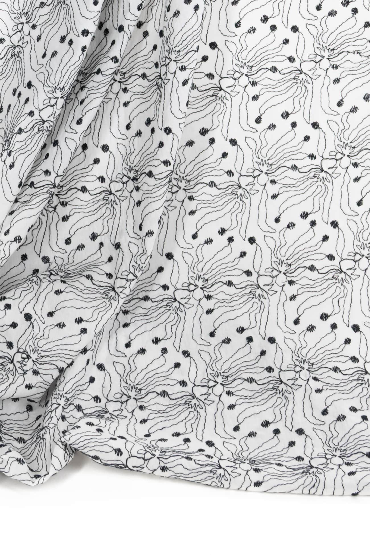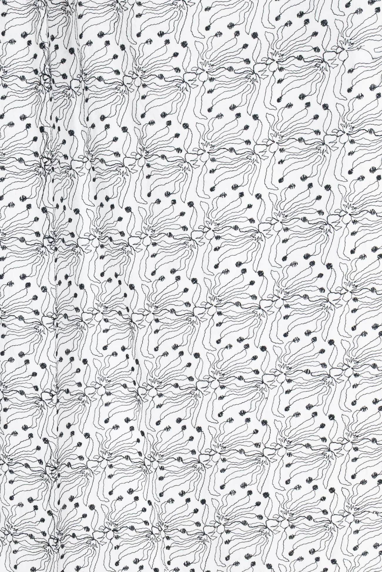 Navy machine stitching on lightly crinkled white cotton gauze in an abstract flora/fauna design, produced in India where textile traditions continue. Produced by hand in short lengths. Light weight, opaque, with a lightly textured soft hand and drape. Right for a dress, shirt, tunic, skirt, skirt, kimono, caftan, children's clothes. One way design, 4" repeat.
