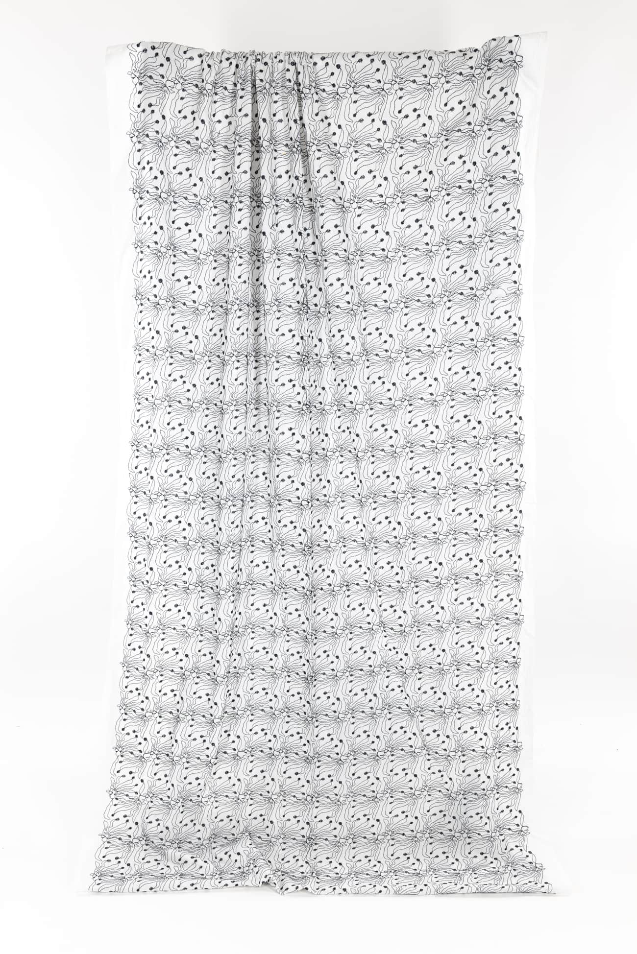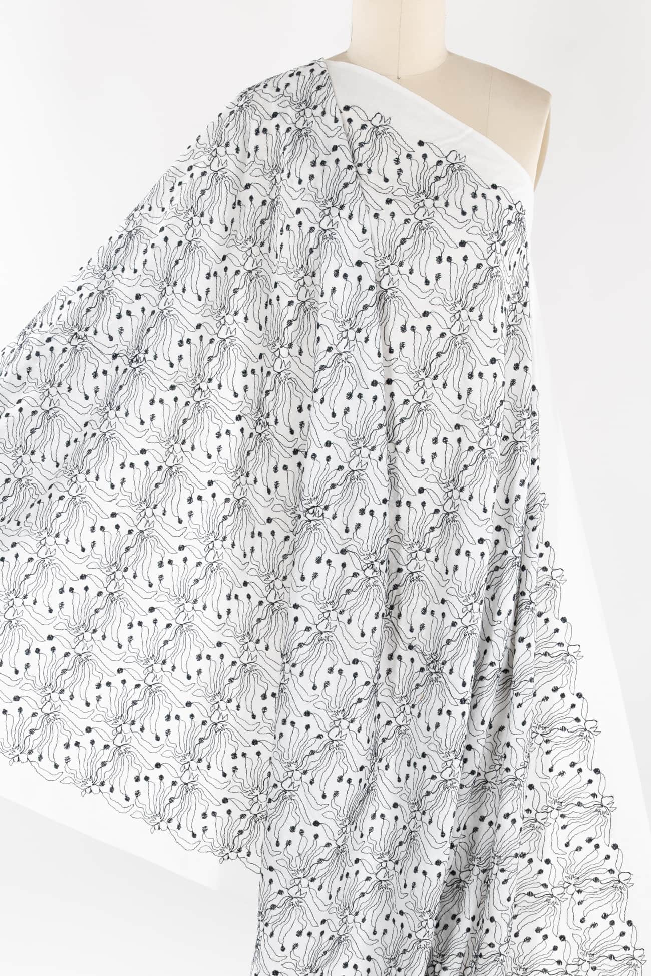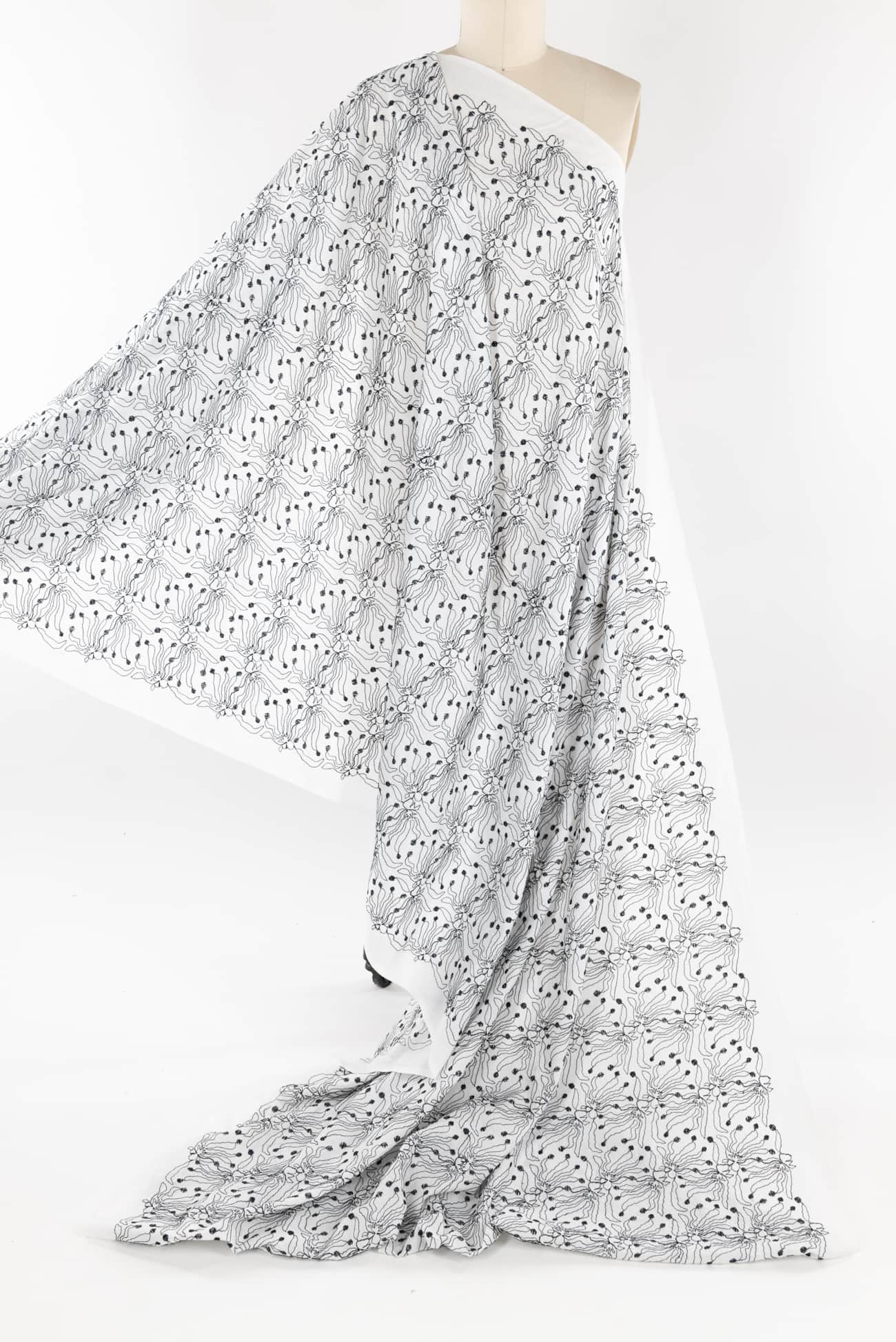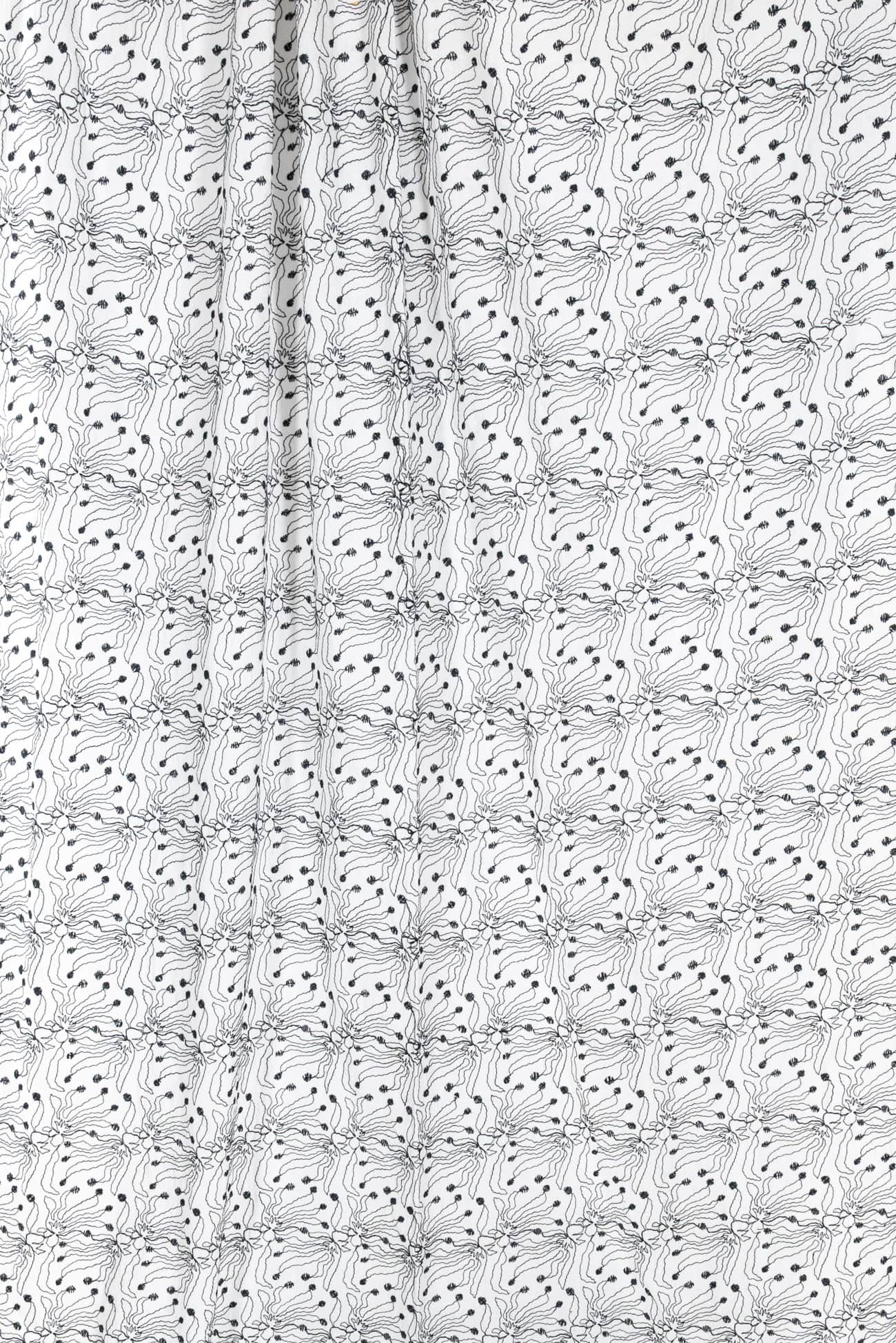 Navy machine stitching on lightly crinkled white cotton gauze in an abstract flora/fauna design, produced in India where textile traditions continue. Produced by hand in short lengths. Light weight, opaque, with a lightly textured soft hand and drape. Right for a dress, shirt, tunic, skirt, skirt, kimono, caftan, children's clothes. One way design, 4" repeat.