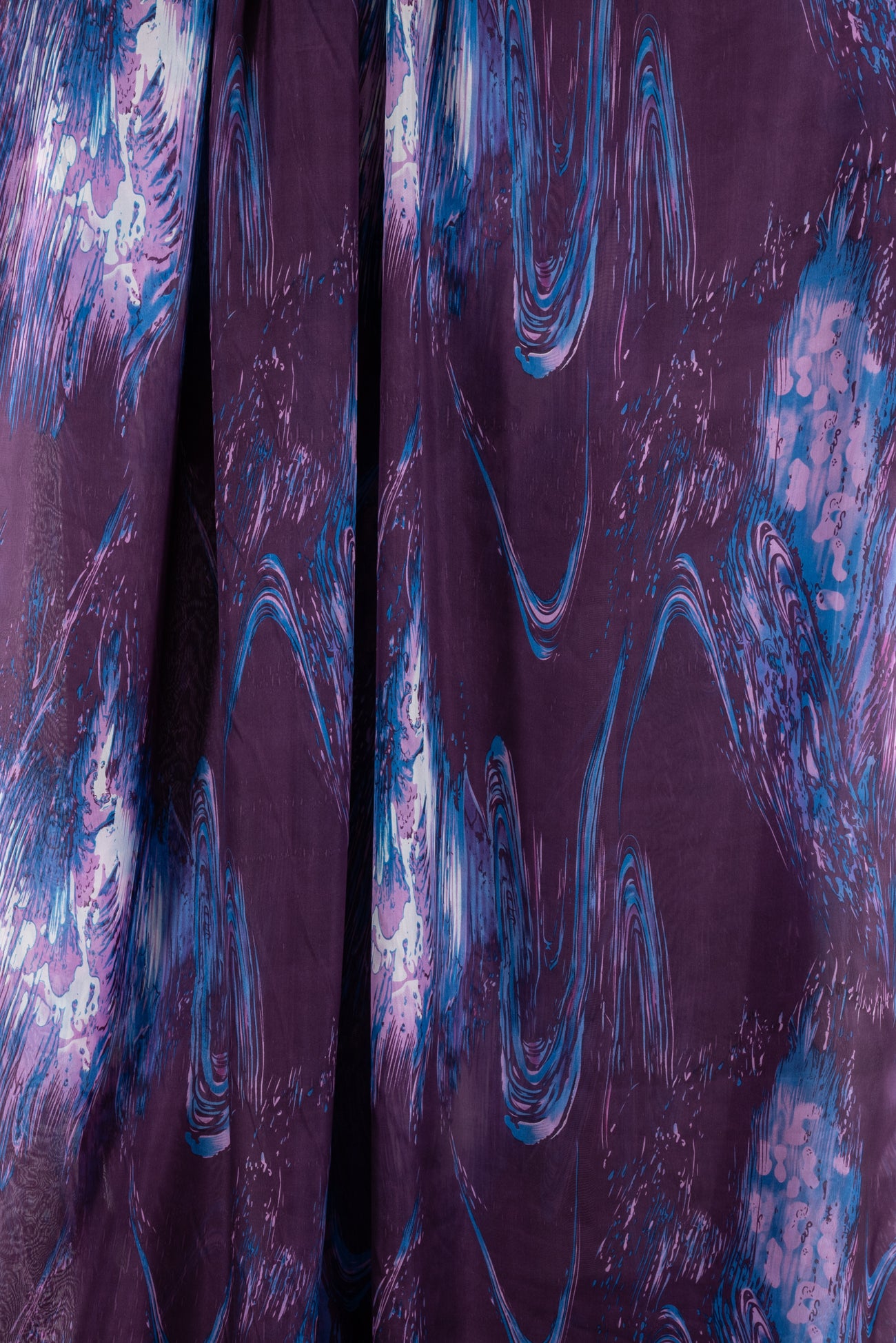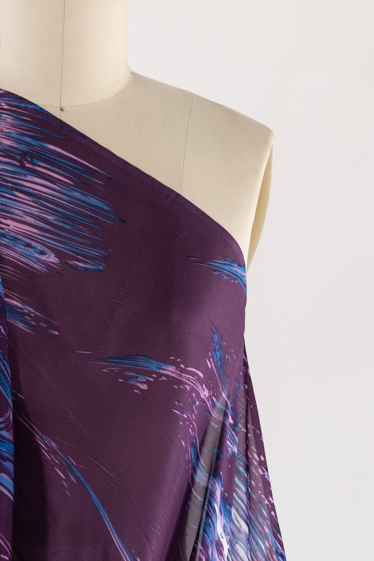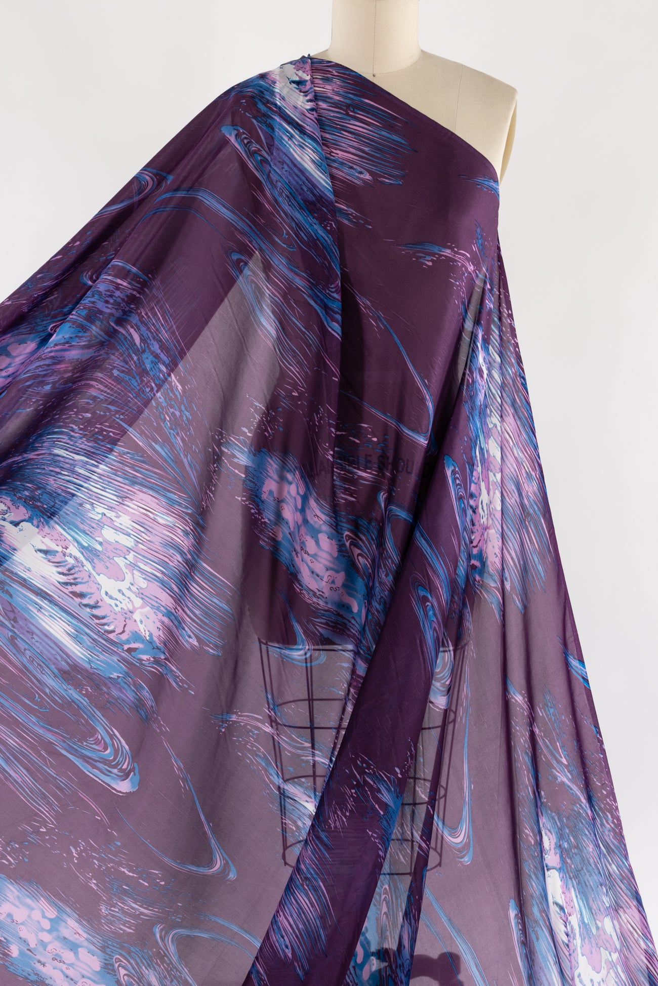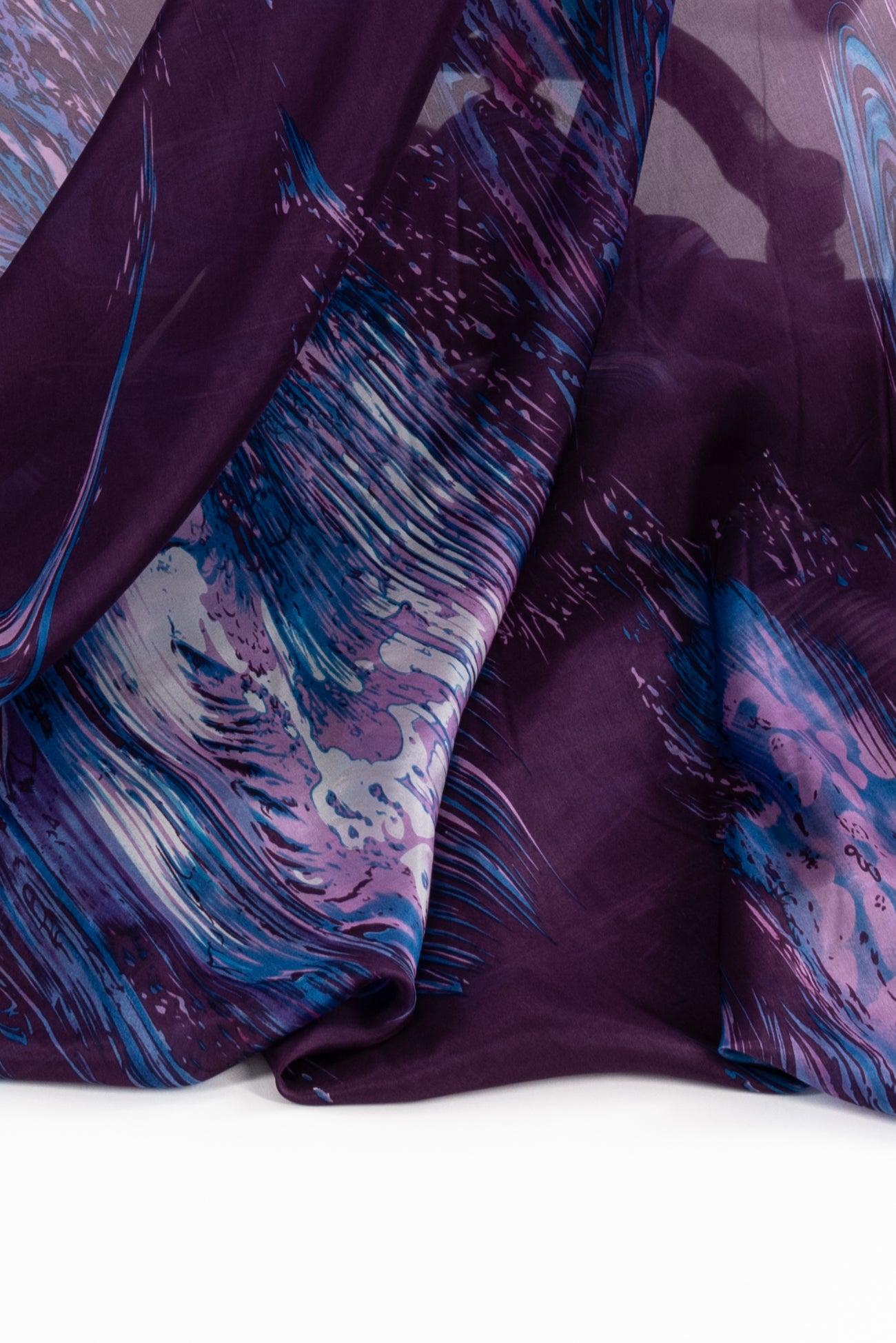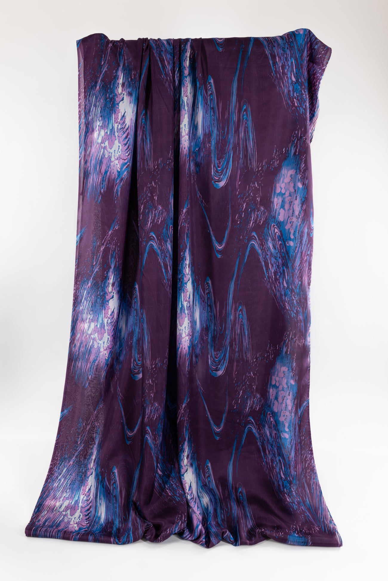 Aubergine purple accented with swirls in dawn pink and sky blue, digitally printed on China silk deadstock from a NYC designer. Lightweight, opaque, with a smooth silky hand and fluid airy drape. One way design, 26" repeat. Right for a dress, shirt, skirt, soft pant, kimono, caftan or loungewear, and would make a luxe lining