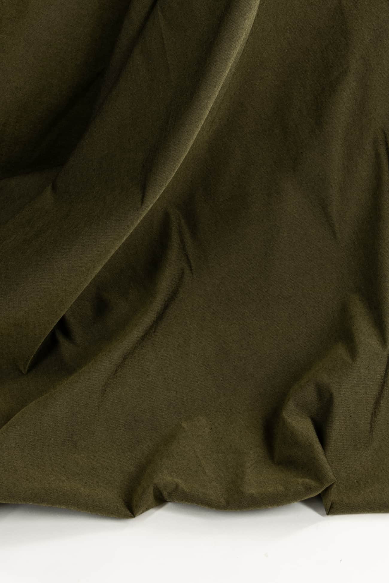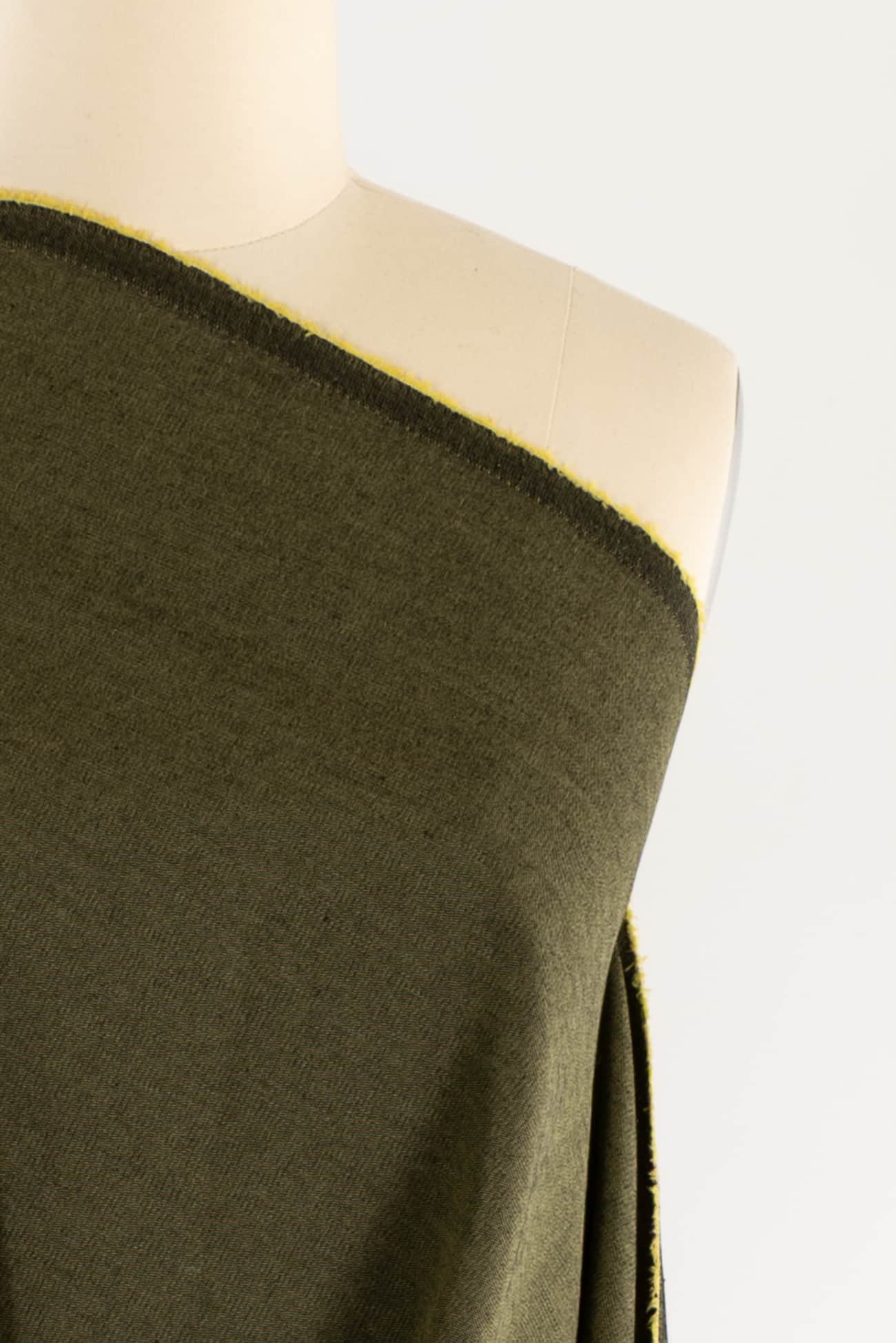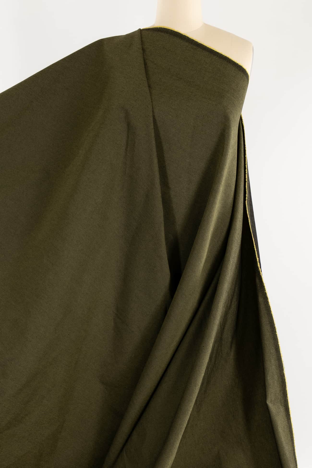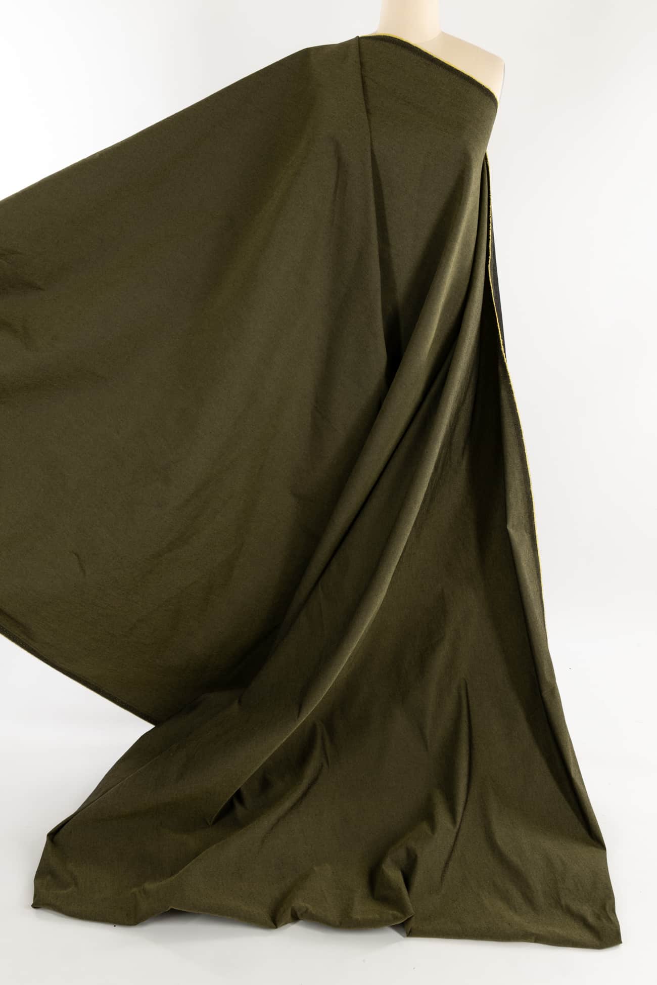 Quiet elegance, green/black crossweave stretch cotton denim, (a mix of yellow-green and black threads), deadstock from an Italian mill. Mid/light weight with a cool dry hand, lightly crisp drape and crosswise stretch. Reverses to marled black, so use either or both sides. Right for both tops and bottoms: jacket, vest, coat, structured dress or skirt, jeans, pants, jumpsuit and menswear.