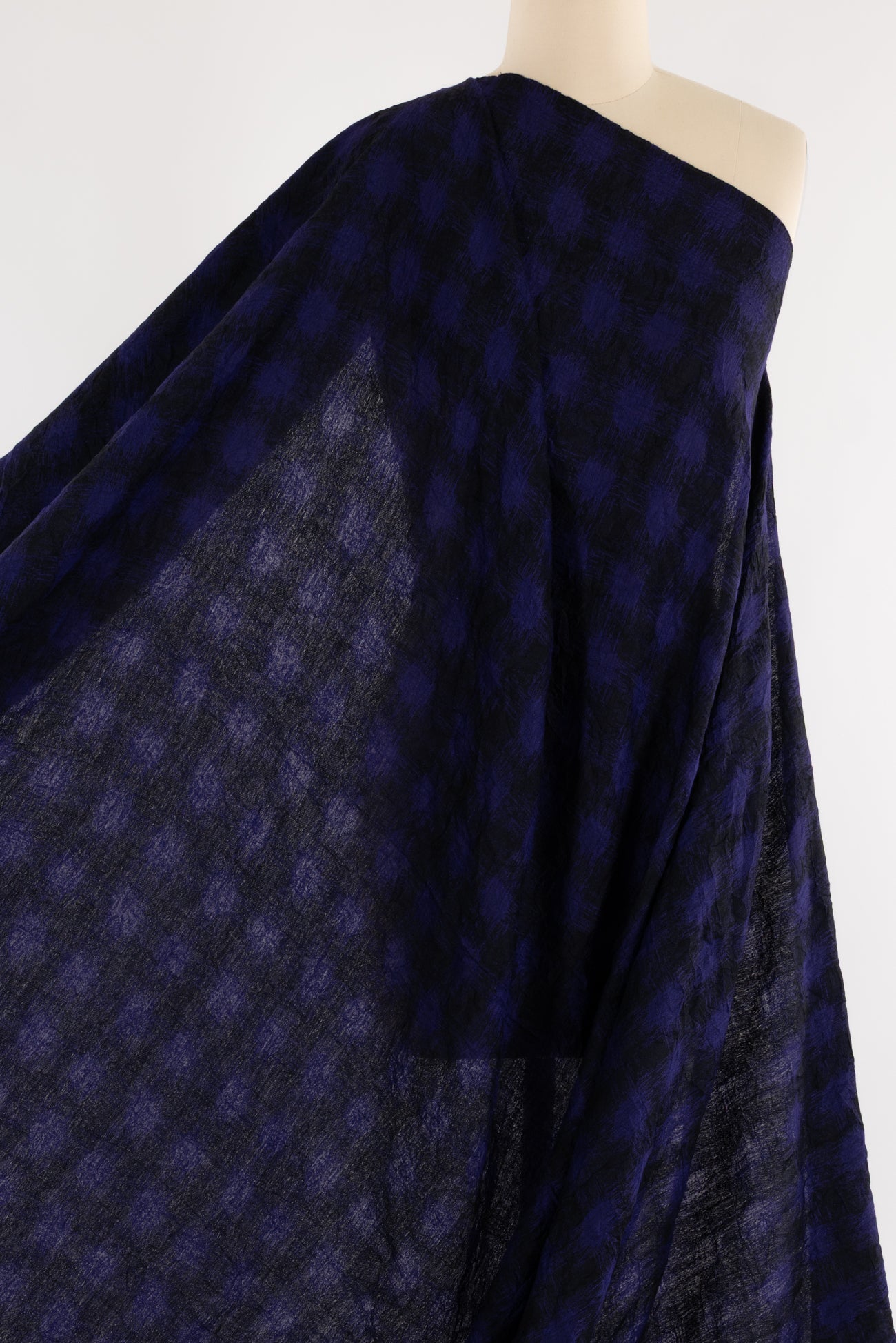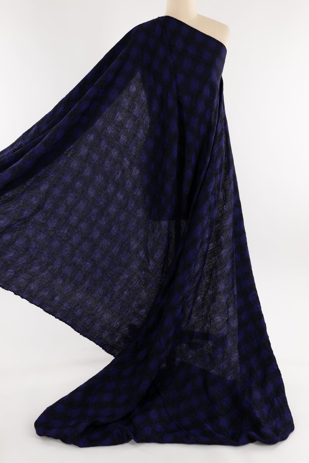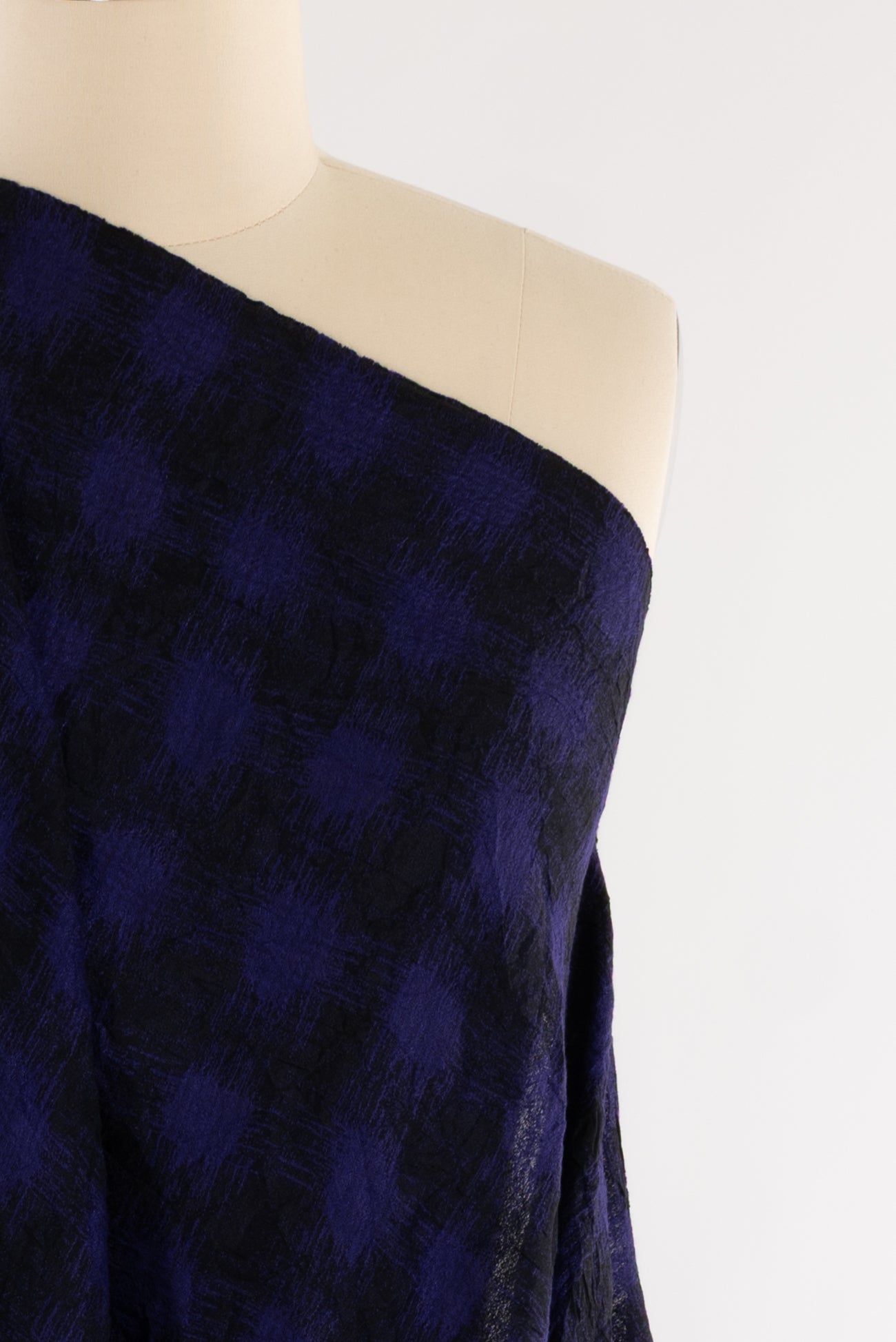 Deep purple and black textured jacquard double weave has woven in allover black 1" dots, deadstock from Chalet et Ceci. Lightweight, opaque, with a textured hand, smooth on the back side, lightly airy crisp drape. Right for a jacket, vest, dress, skirt, tunic, kimono, caftan. Very cool and unusual. Limited quantity.