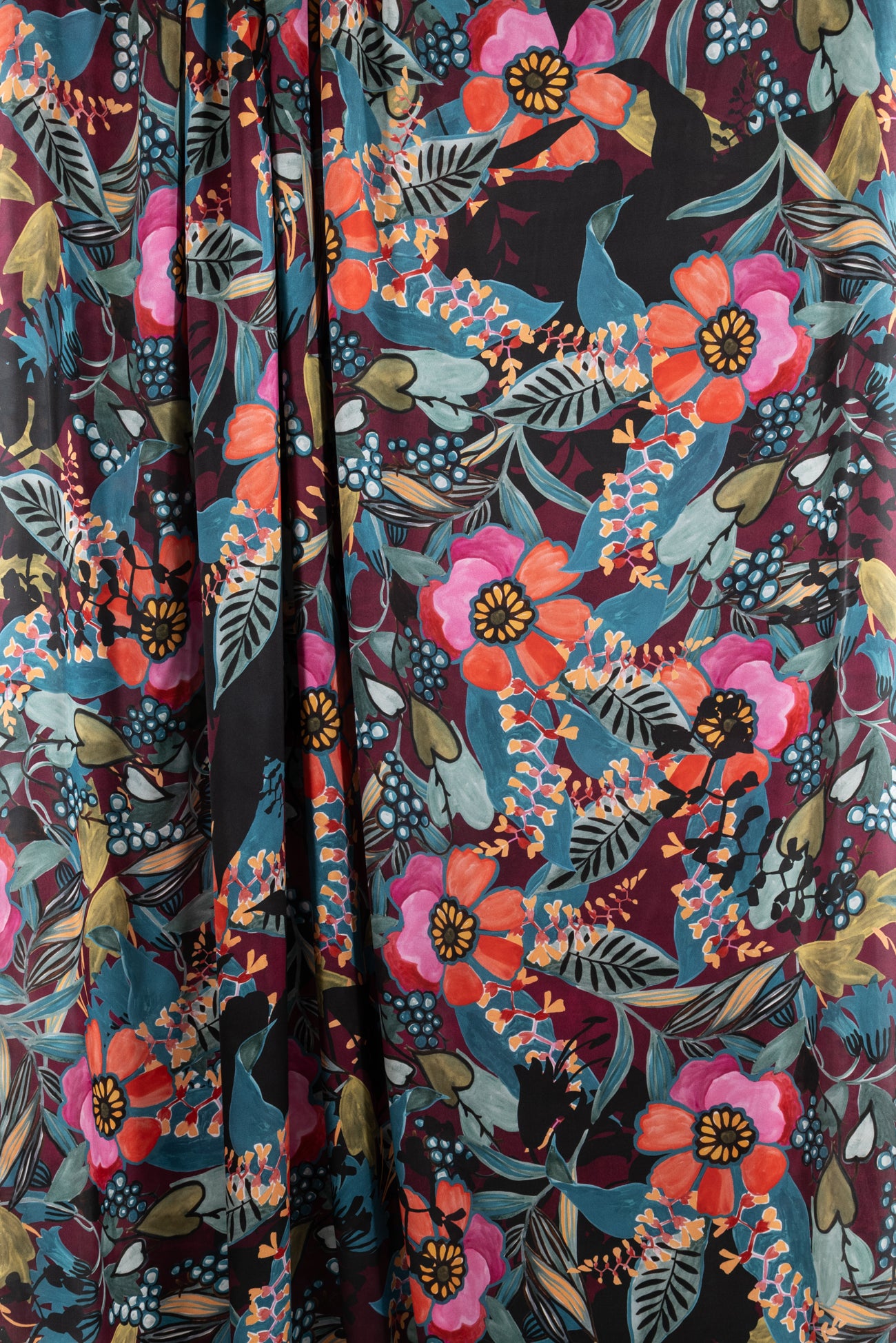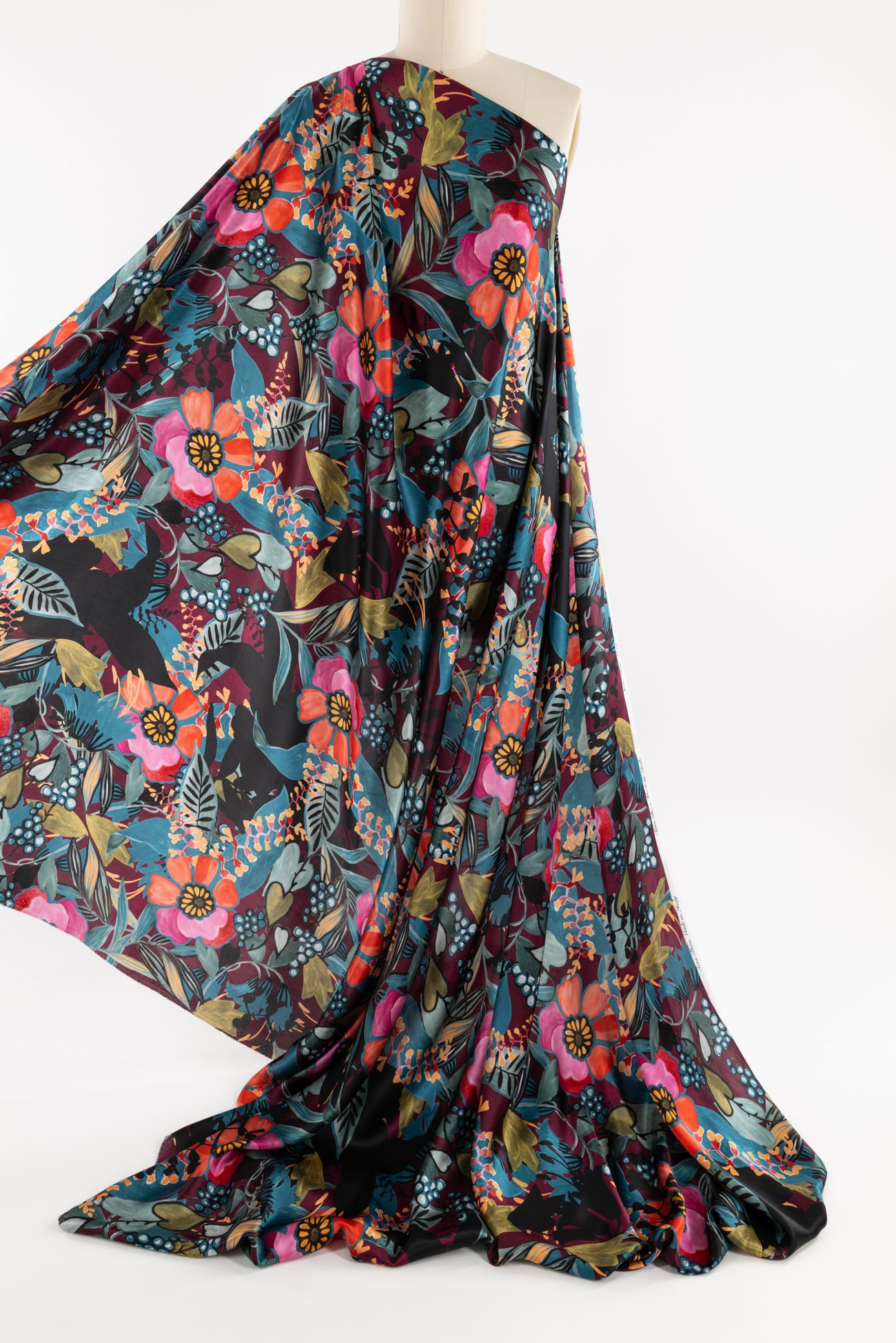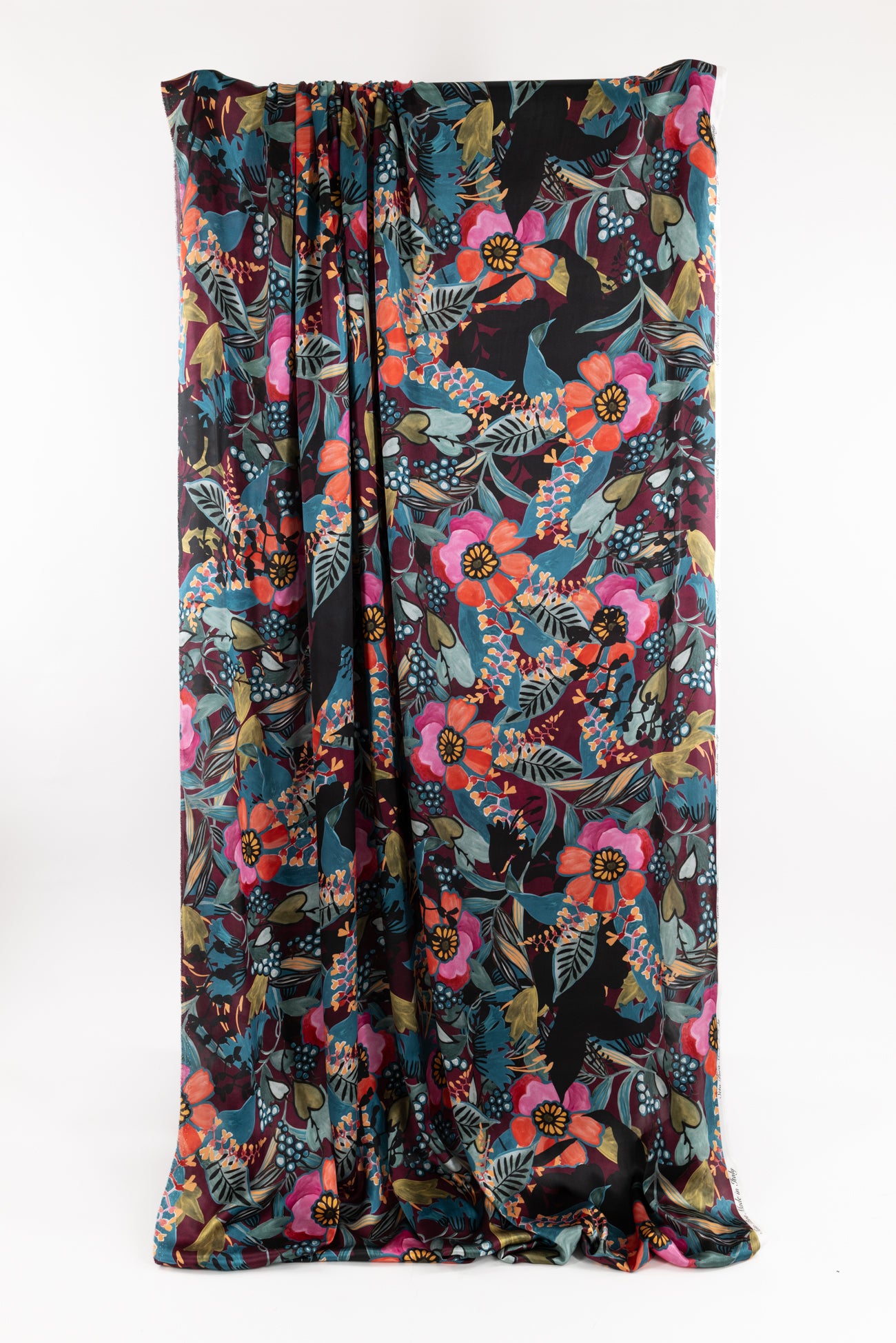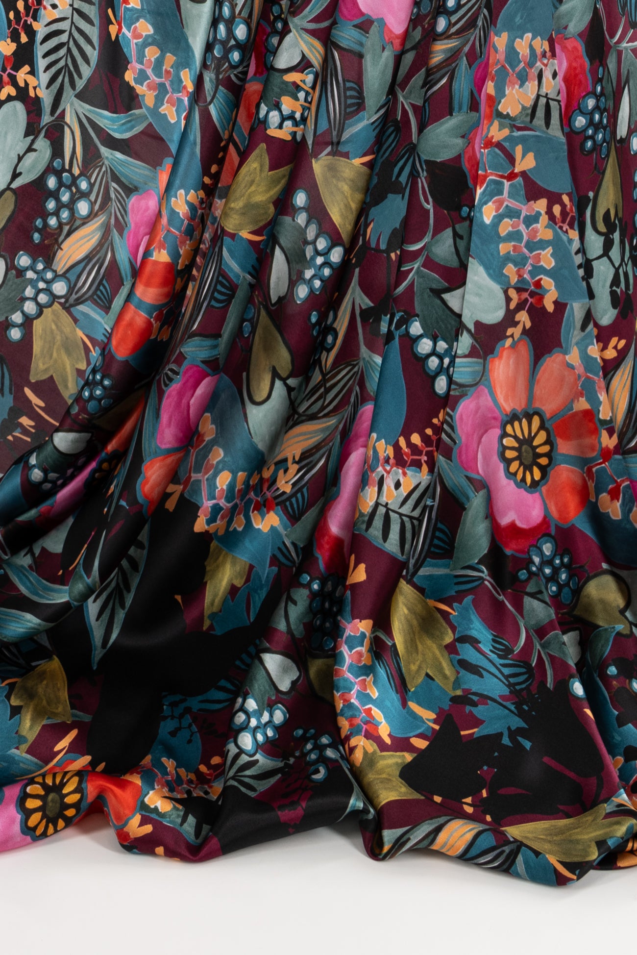Spectacular and stunning hand-painted floral in shades of pink and blue with touches of aubergine, green, ochre, and black, digitally printed on exquisite silk charmeuse, deadstock from an Italian mill. Elegant, moody, and fabulous! Lightweight, opaque, with a subtle sateen face, matte back, and liquid fluid drape. Right for a dress, skirt, tunic, shirt, soft pant, caftan, or kimono. One-way design, 50" repeat.