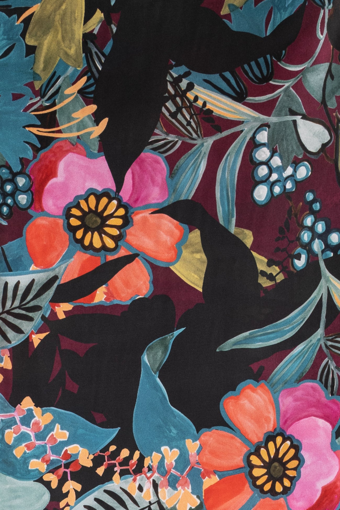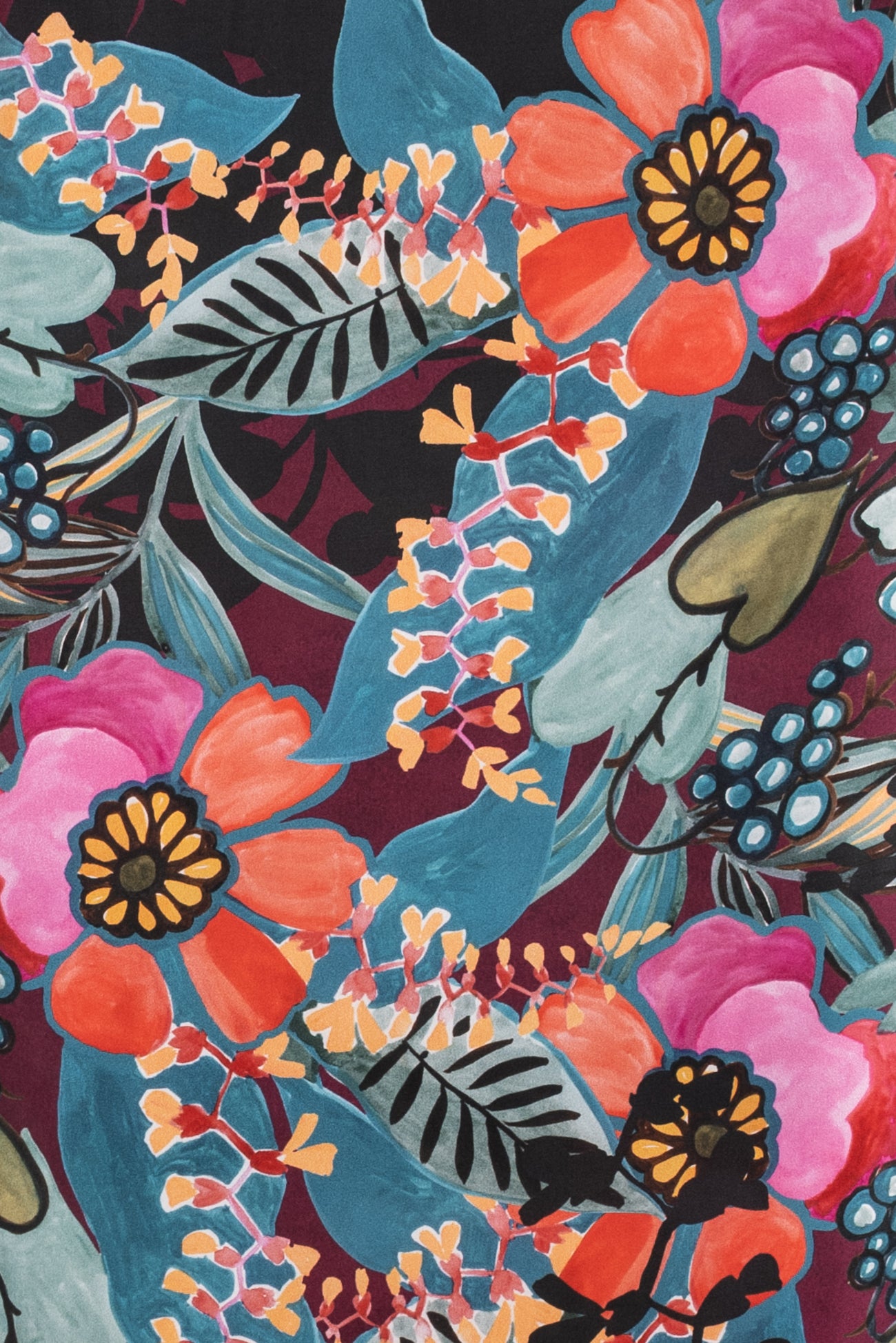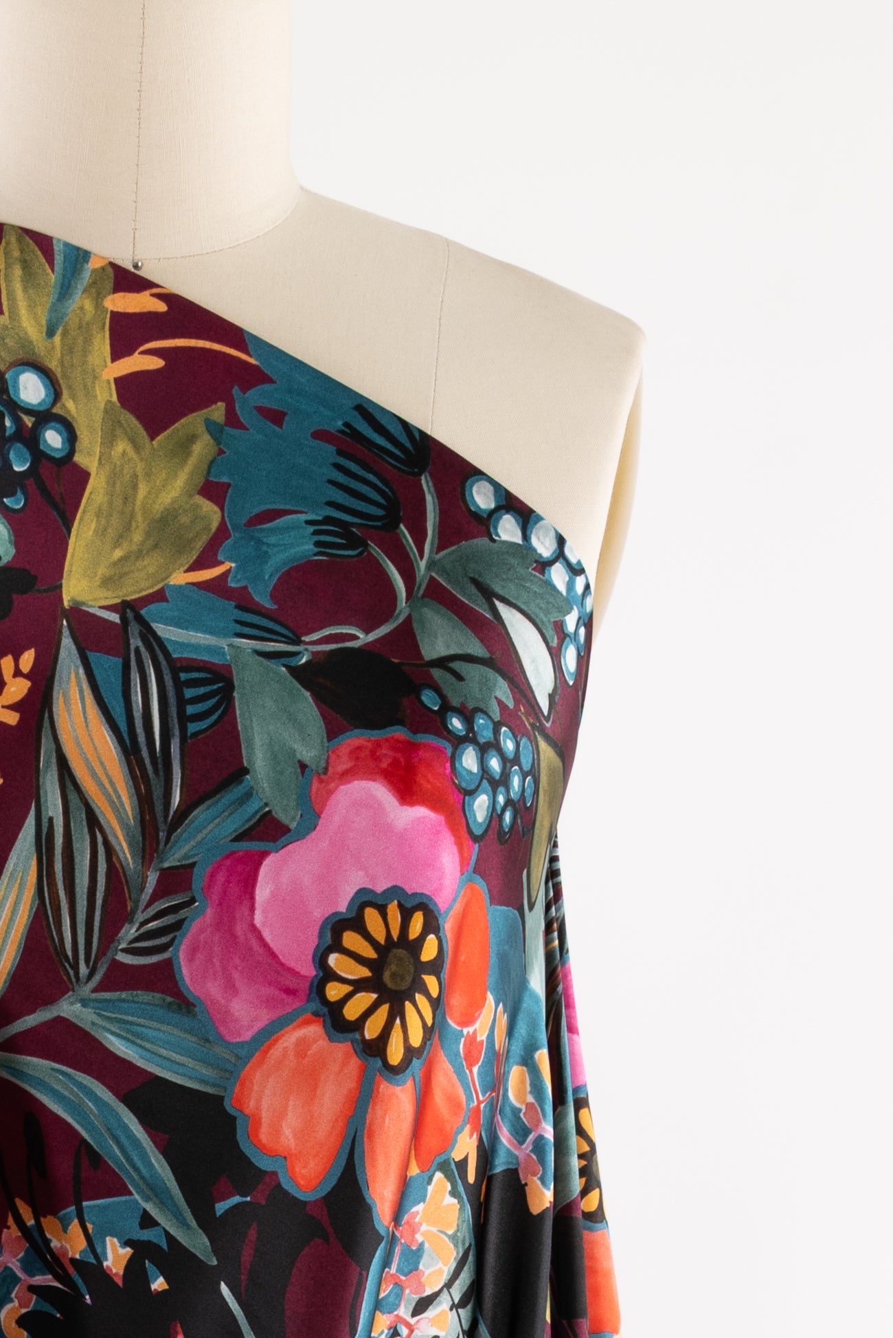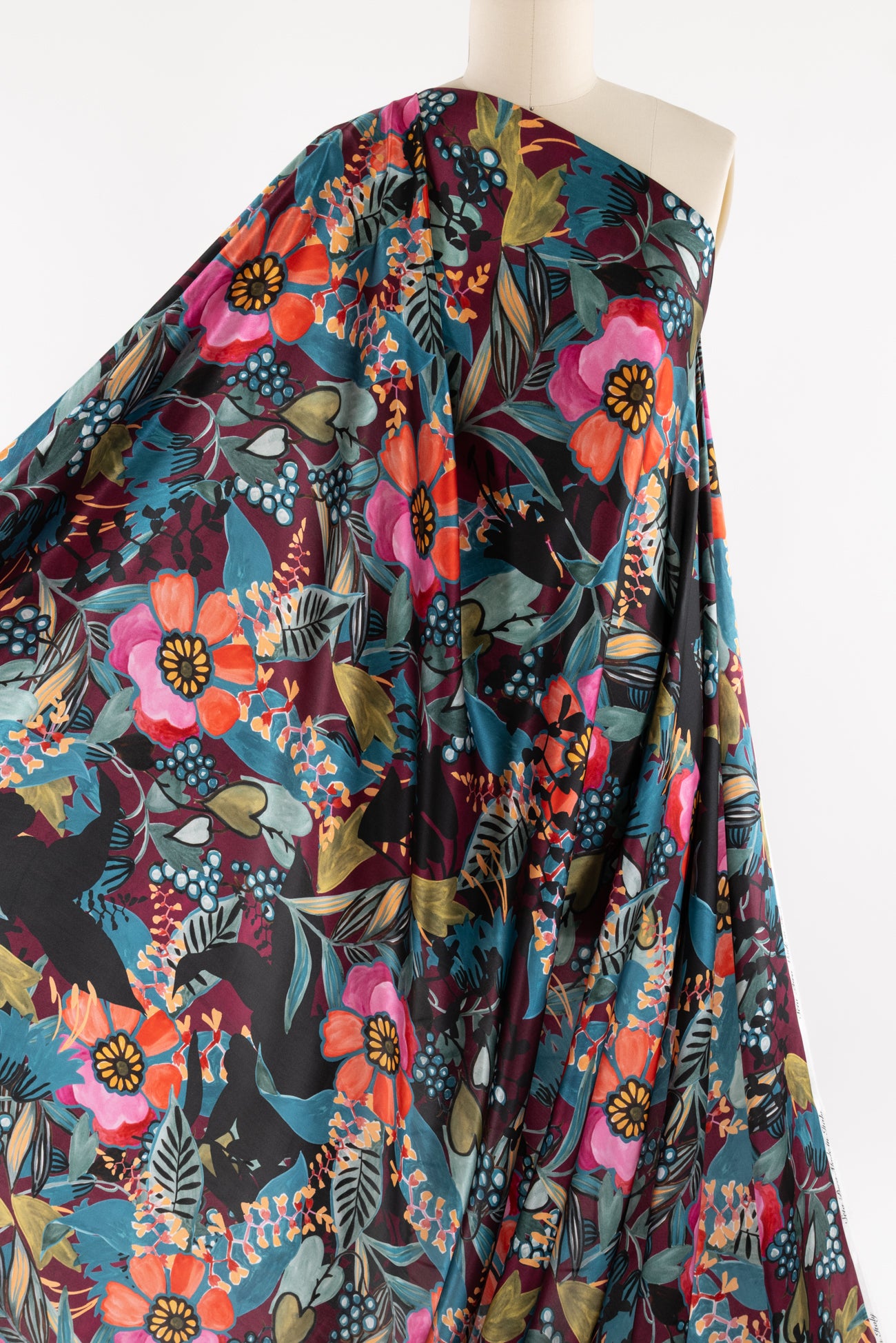 Spectacular and stunning hand-painted floral in shades of pink and blue with touches of aubergine, green, ochre, and black, digitally printed on exquisite silk charmeuse, deadstock from an Italian mill. Elegant, moody, and fabulous! Lightweight, opaque, with a subtle sateen face, matte back, and liquid fluid drape. Right for a dress, skirt, tunic, shirt, soft pant, caftan, or kimono. One-way design, 50" repeat.