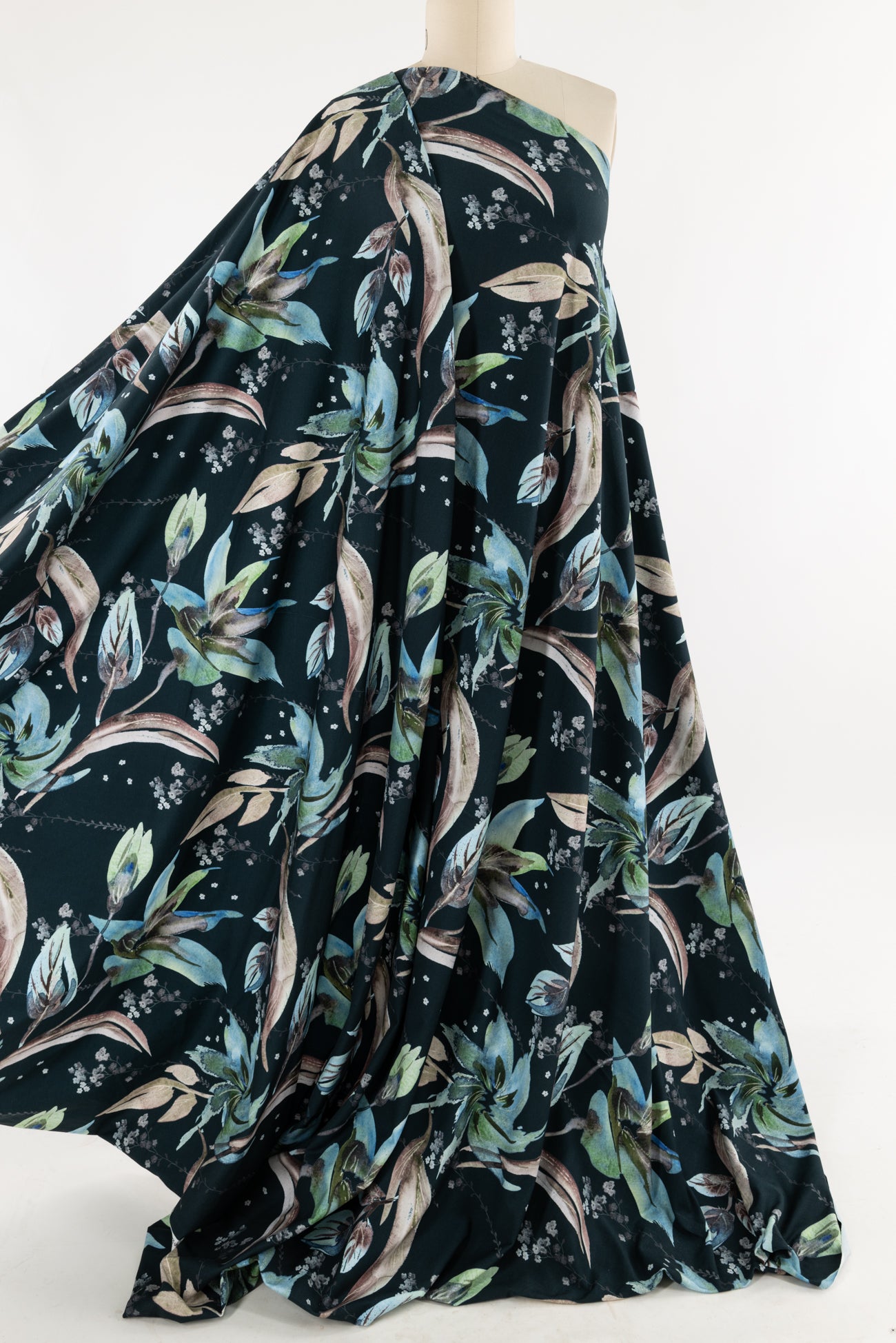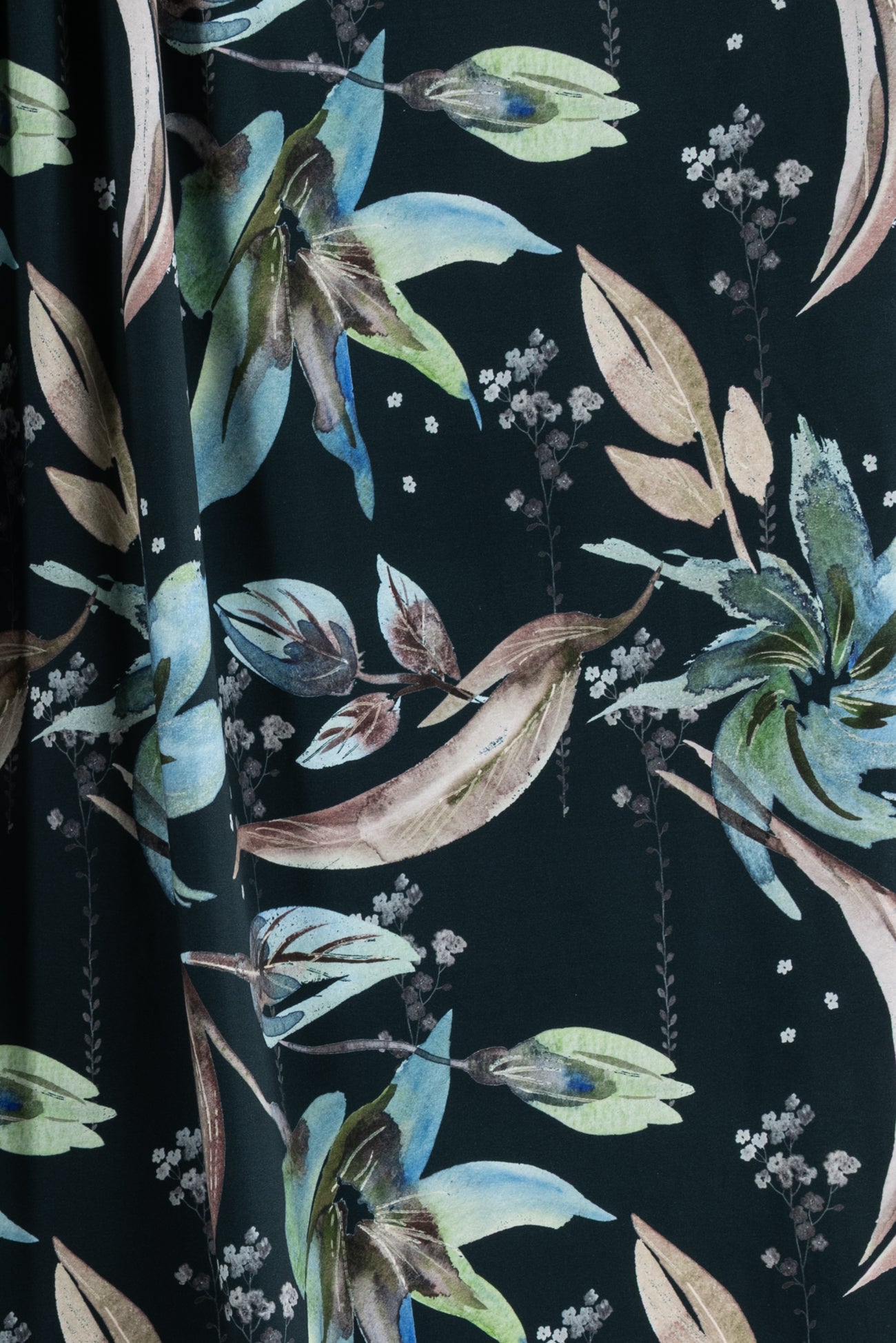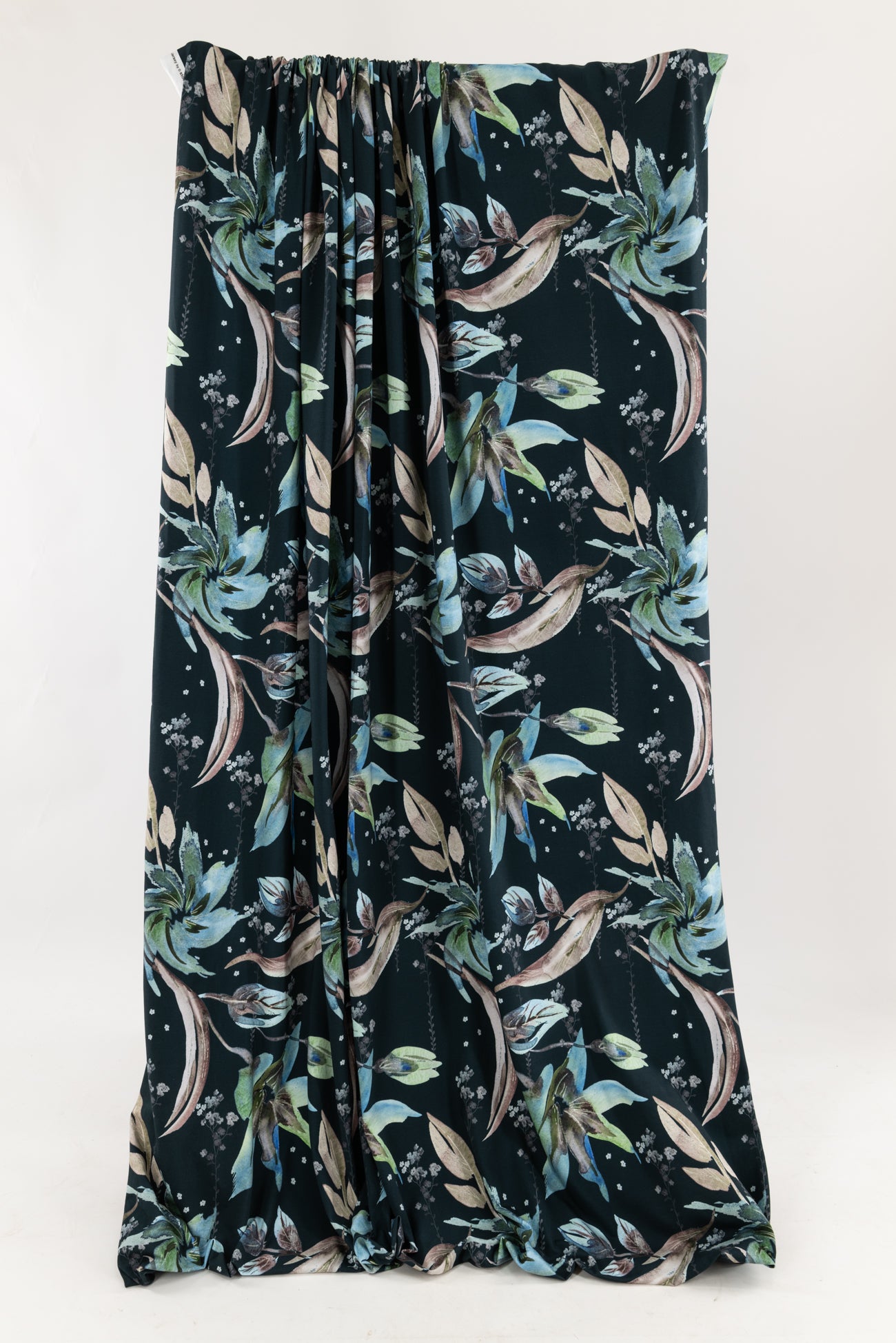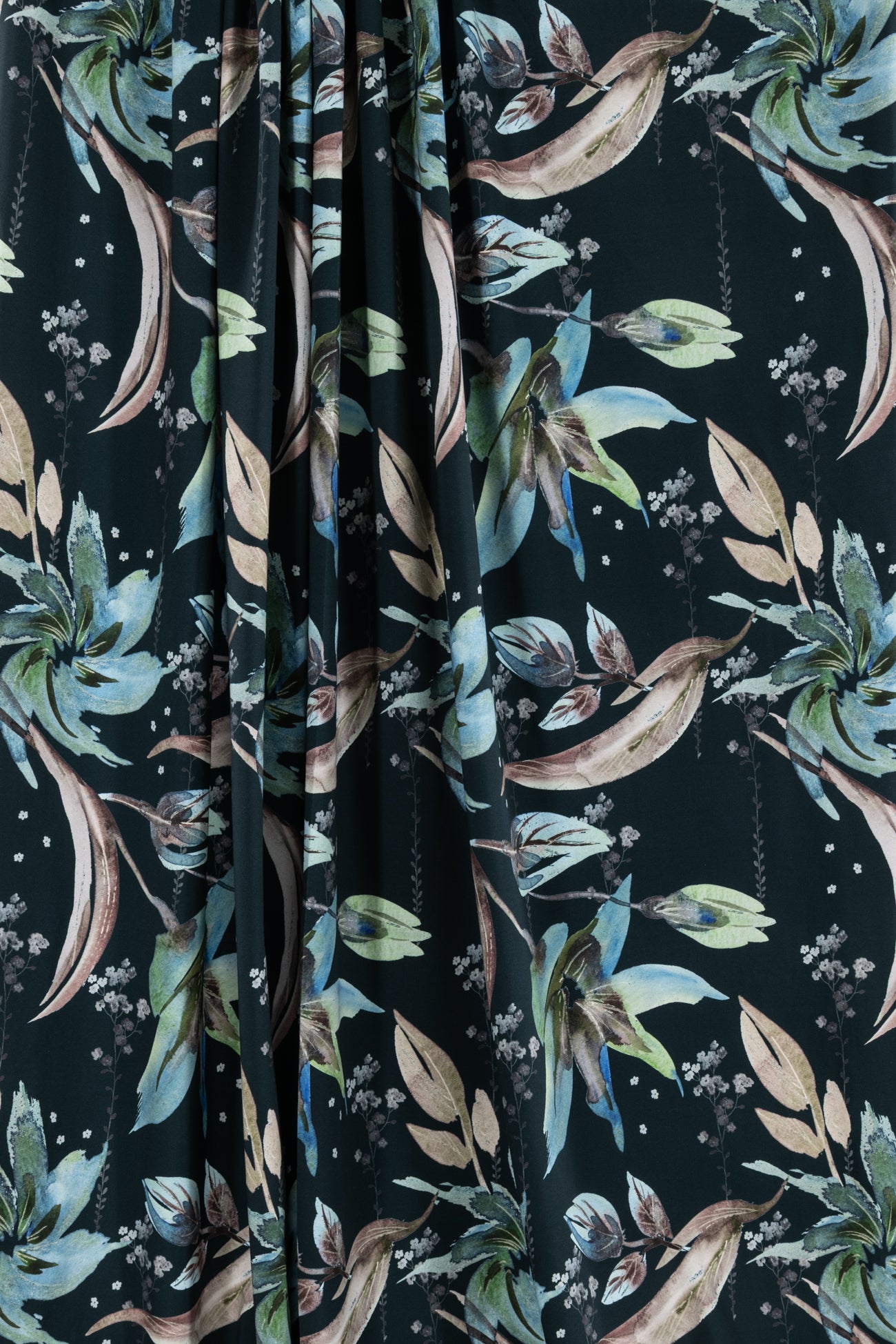 Stunning floral in shades of blue with green on deepest teal, in a digital print on an impeccable European quality cotton/spandex jersey knit, produced in Denmark. Light/mid-weight, opaque, and will skim the body in a flattering way. It has a soft smooth hand, fluid drape, 4-way stretch, and some rolling at the cut edge. Right for a variety of garments; t-shirt, tunic, dress, soft pants, leggings, cardigan, skirt or loungewear, as well as children's and men's clothing. Oeko-Tex® certified. One-way design, 18½ inch repeat.