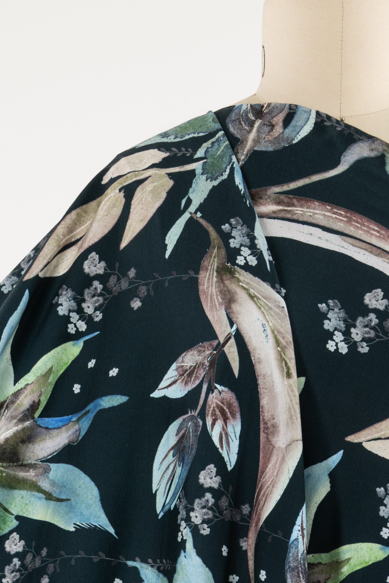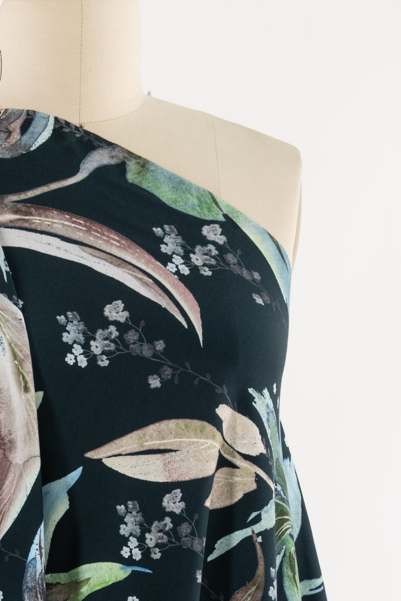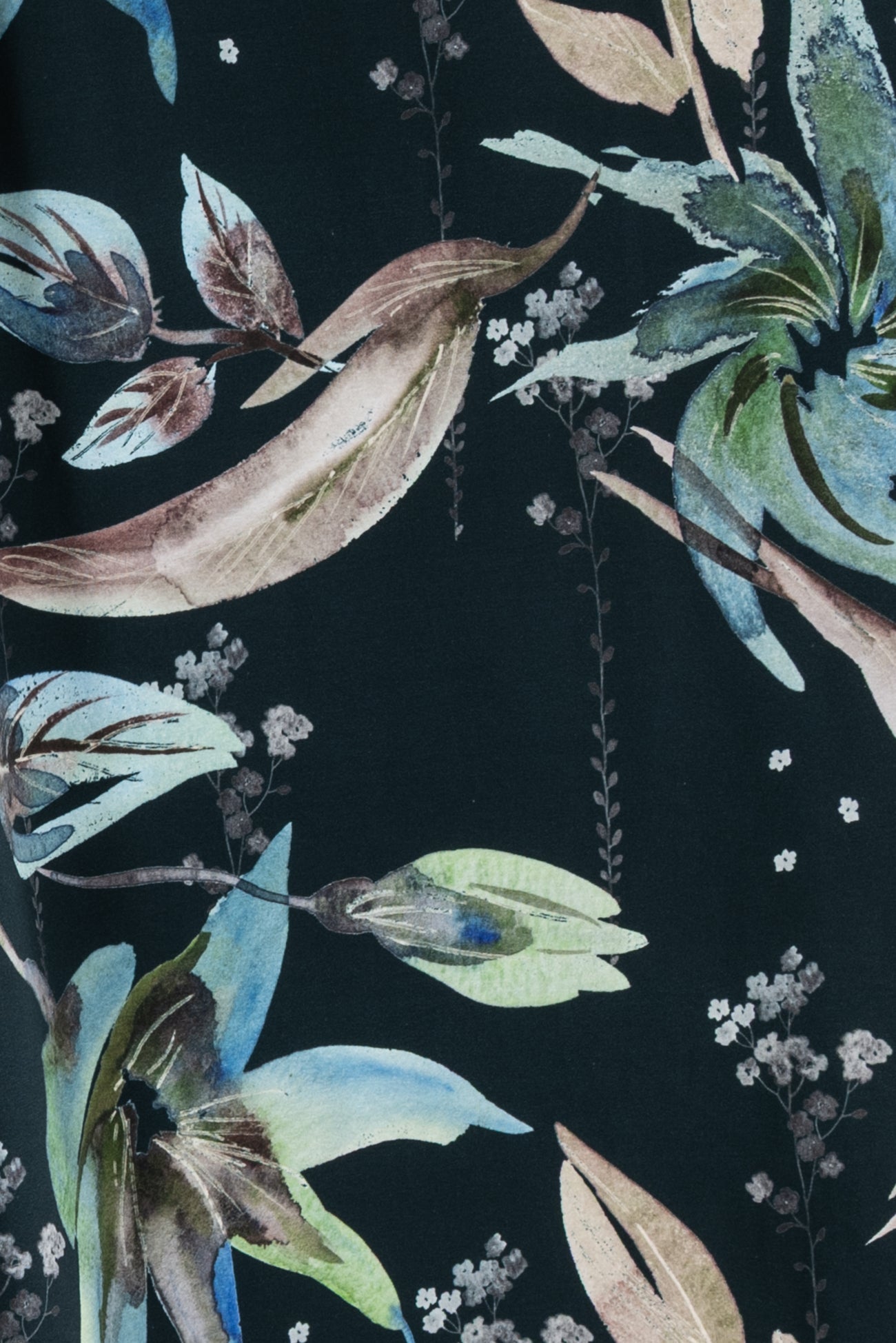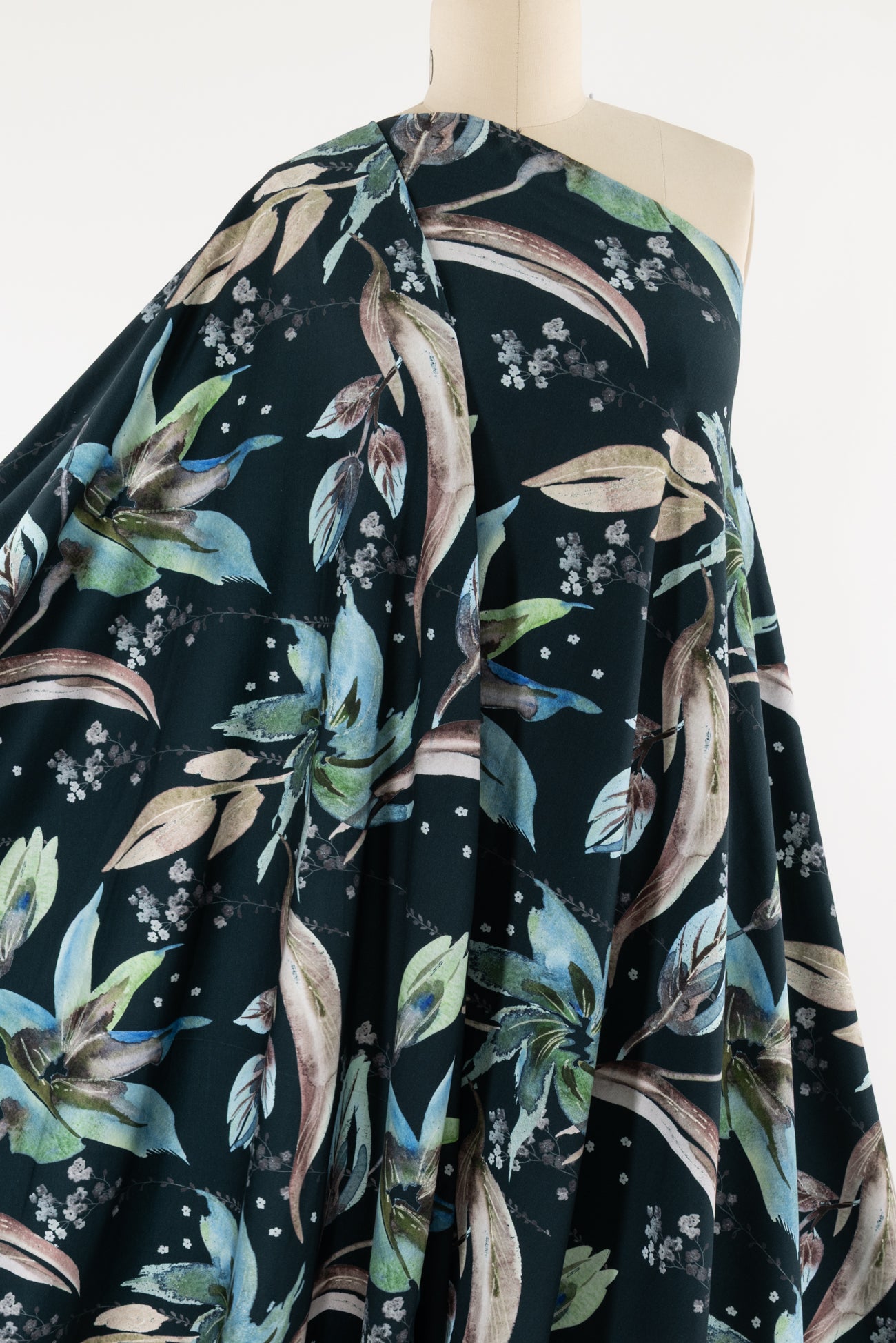 Stunning floral in shades of blue with green on deepest teal, in a digital print on an impeccable European quality cotton/spandex jersey knit, produced in Denmark. Light/mid-weight, opaque, and will skim the body in a flattering way. It has a soft smooth hand, fluid drape, 4-way stretch, and some rolling at the cut edge. Right for a variety of garments; t-shirt, tunic, dress, soft pants, leggings, cardigan, skirt or loungewear, as well as children's and men's clothing. Oeko-Tex® certified. One-way design, 18½ inch repeat.