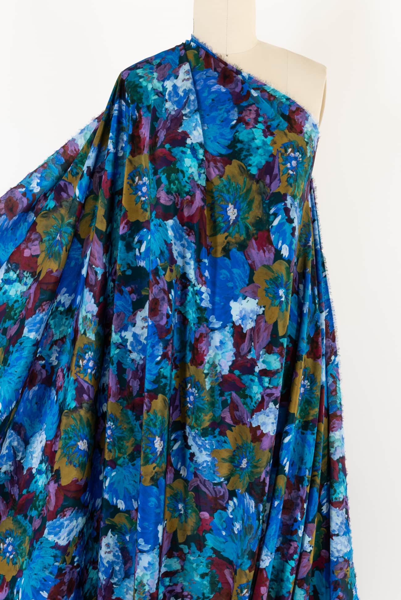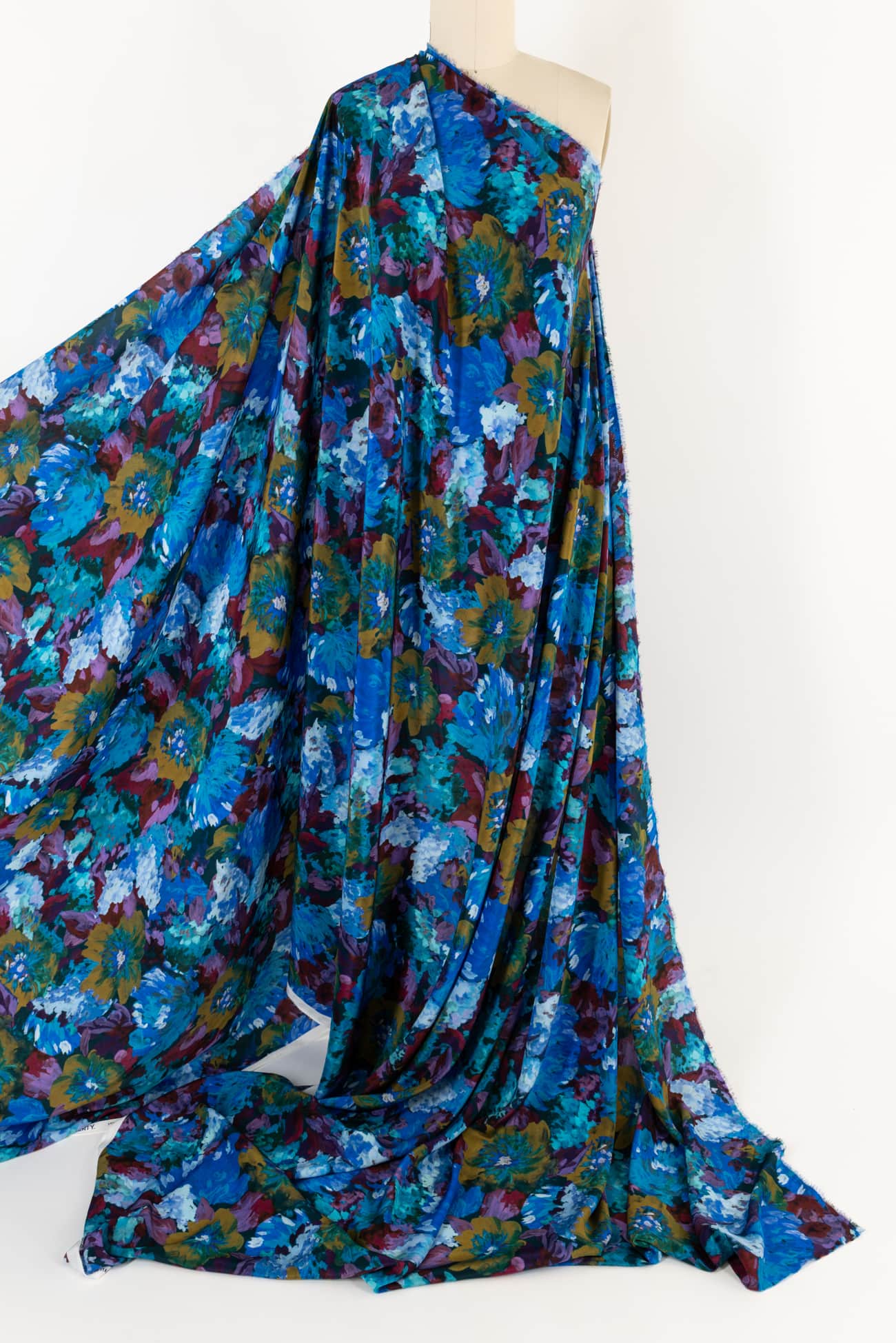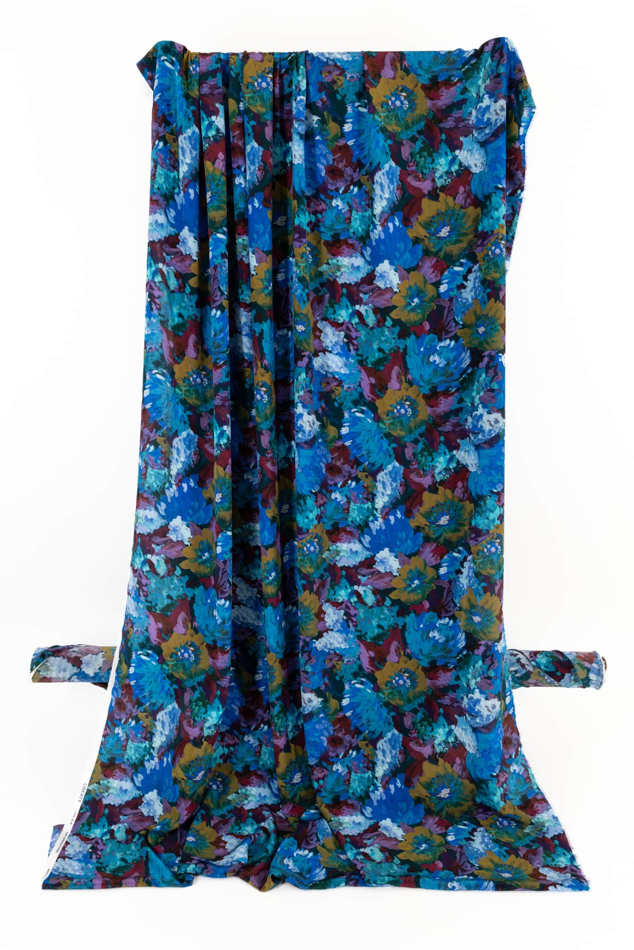 Dramatic painterly abstract celebrating florals and envisioning flowers as a work of art. The original artist's design was drawn in soft colored pencils in rich color saturated jewel tones punched with black, digitally printed in Italy. Lightweight, opaque, with a cool, dry crepe hand and fluid liquid drape. Right for a dress, tunic, shirt, floaty jacket, soft pants, kimono, caftan. One way design, 24" repeat.