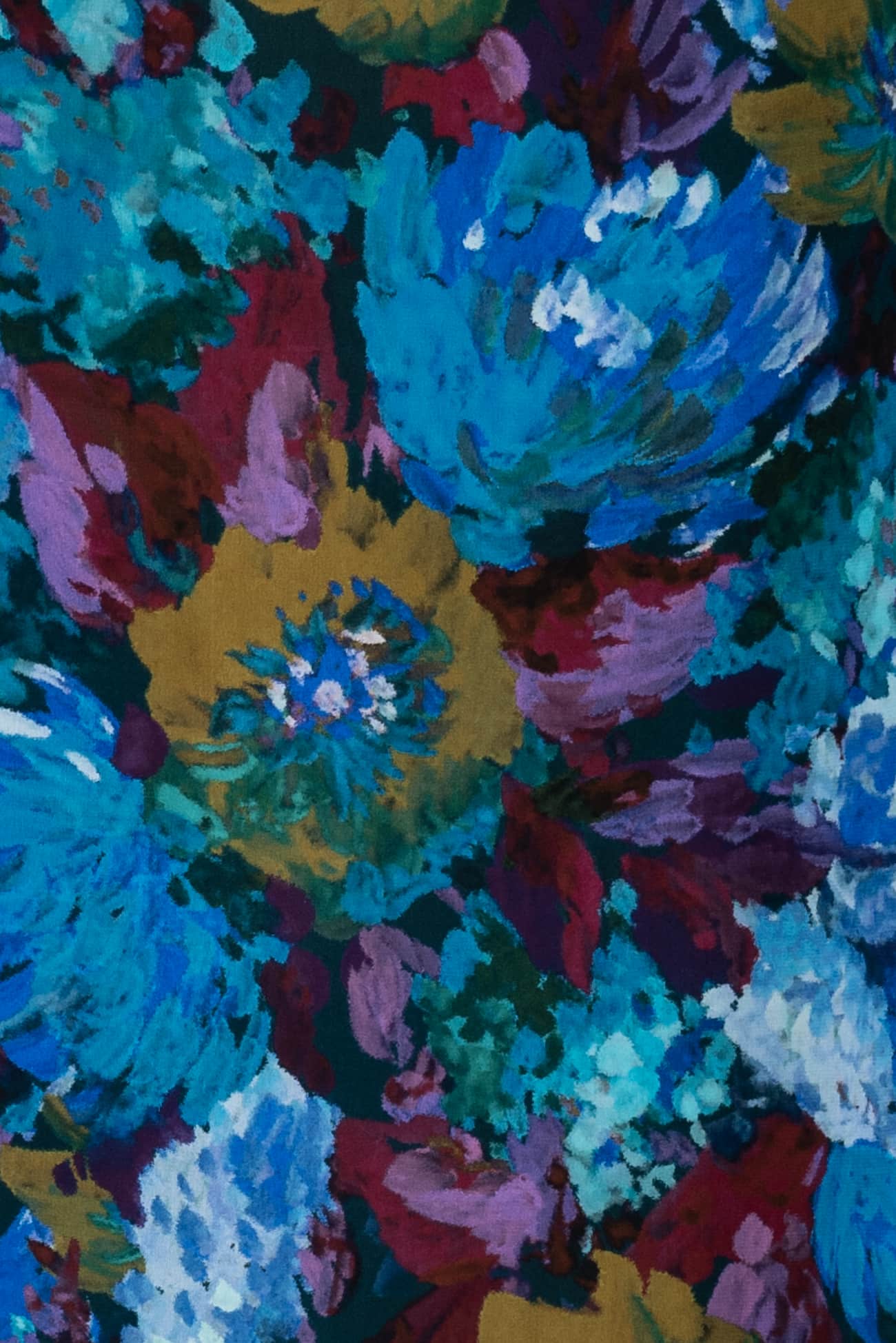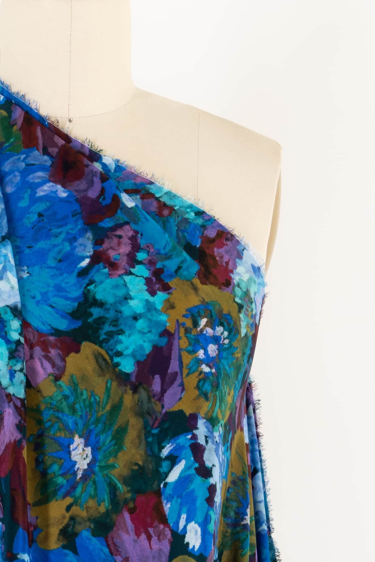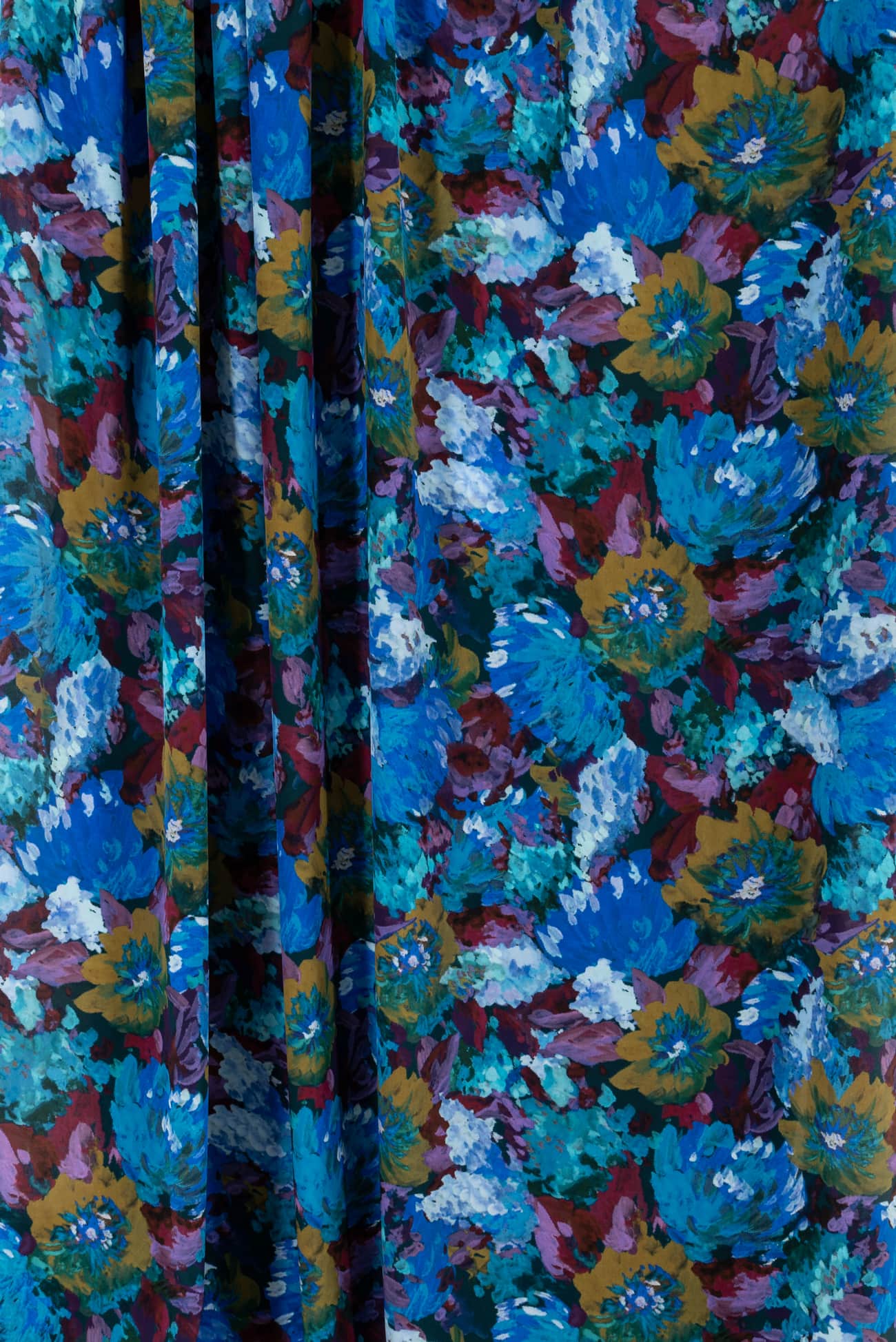Dramatic painterly abstract celebrating florals and envisioning flowers as a work of art. The original artist's design was drawn in soft colored pencils in rich color saturated jewel tones punched with black, digitally printed in Italy. Lightweight, opaque, with a cool, dry crepe hand and fluid liquid drape. Right for a dress, tunic, shirt, floaty jacket, soft pants, kimono, caftan. One way design, 24" repeat.