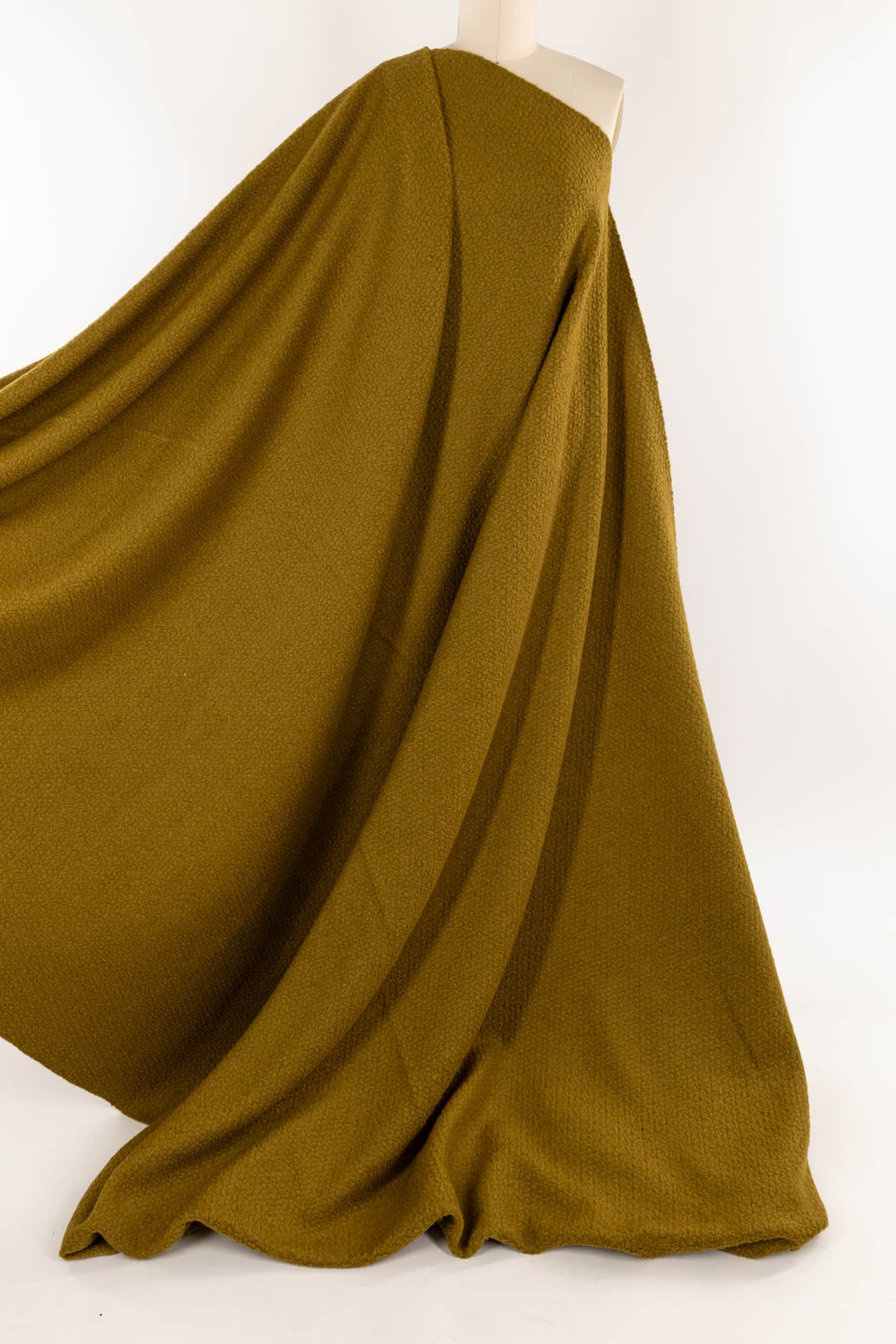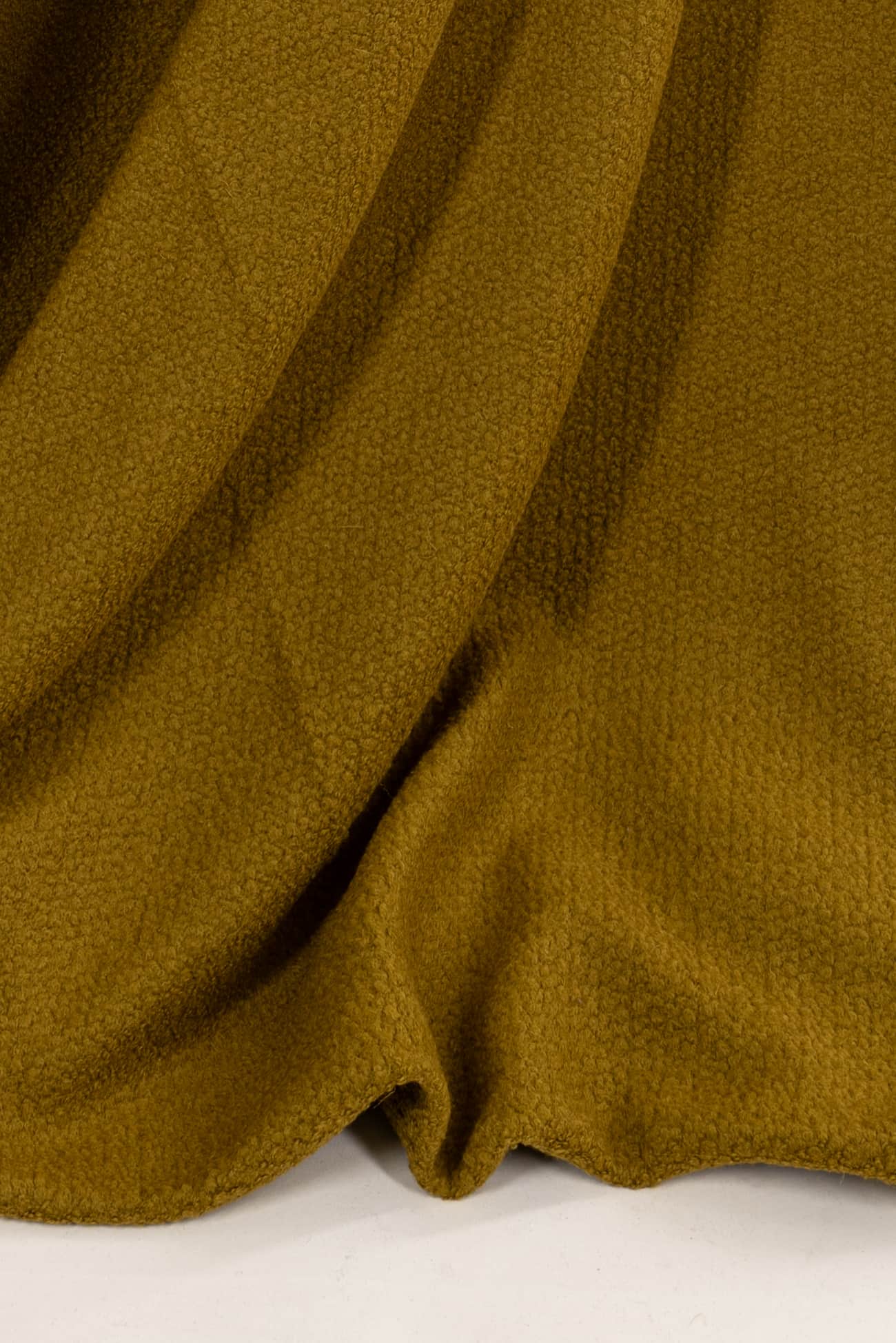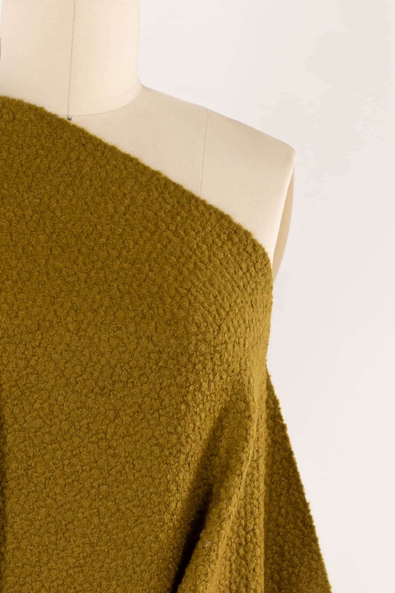 Color saturated rich acid green boucle knit, deadstock produced in South Korea for an upscale LA designer. Heavy/mid weight with a bit of loft, an appealing cozy textured boucle surface, smooth on the back side and light crosswise stretch. No rolling at the cut edge, no raveling, so no need for a seam finish (lining optional), - will be easy to sew and a pleasure to wear. Beautiful quality! Right for a coat, jacket, vest, sweater, poncho.