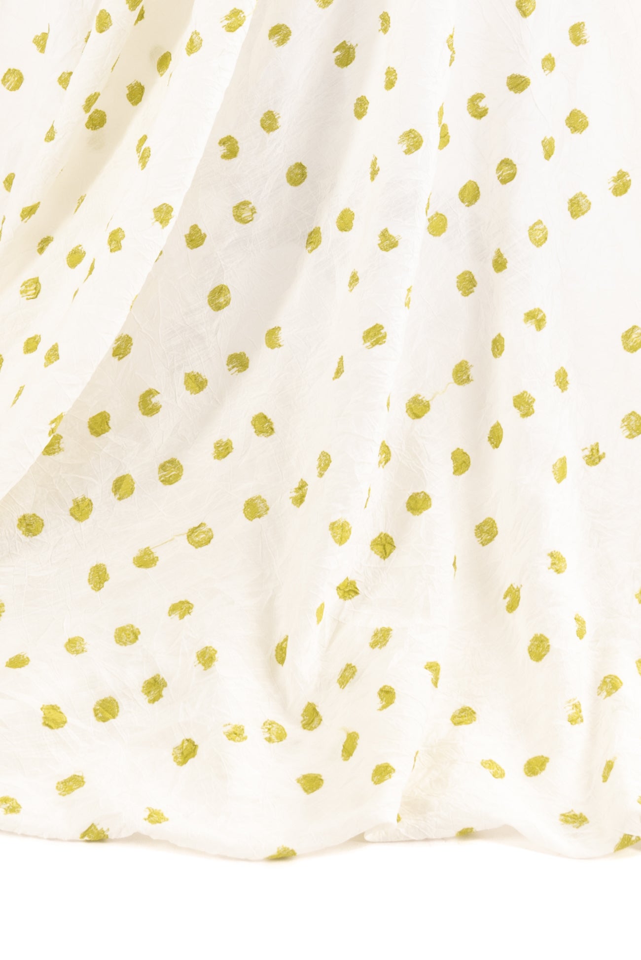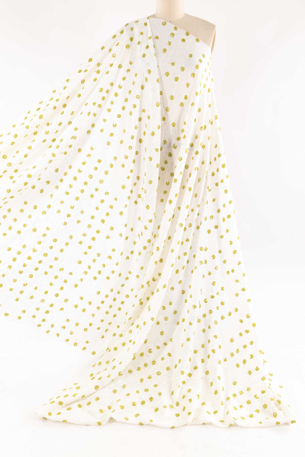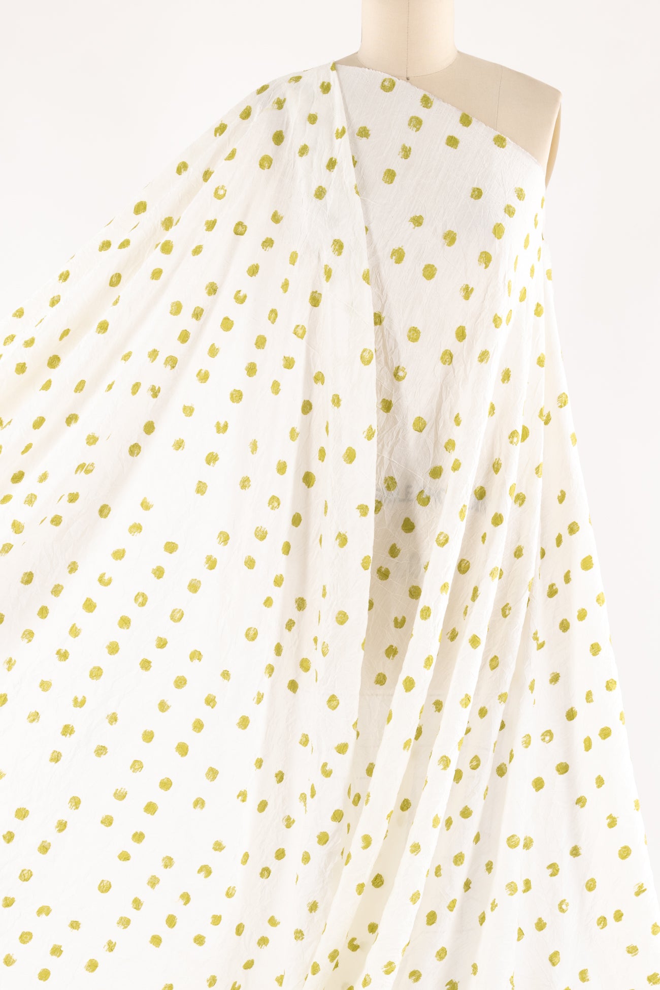 Hand stamped effect lime/acid green 1/2" dots are printed overall on an airy, lightly textured, softly crinkled rayon, deadstock from LA cult couturier Jane Mohr for Dress to Kill. Lightweight, semi-opaque, with a smooth, cool, dry lightly textured hand and airy fluid drape. Right for a dress, shirt, skirt, tunic, soft pants, caftan, menswear.