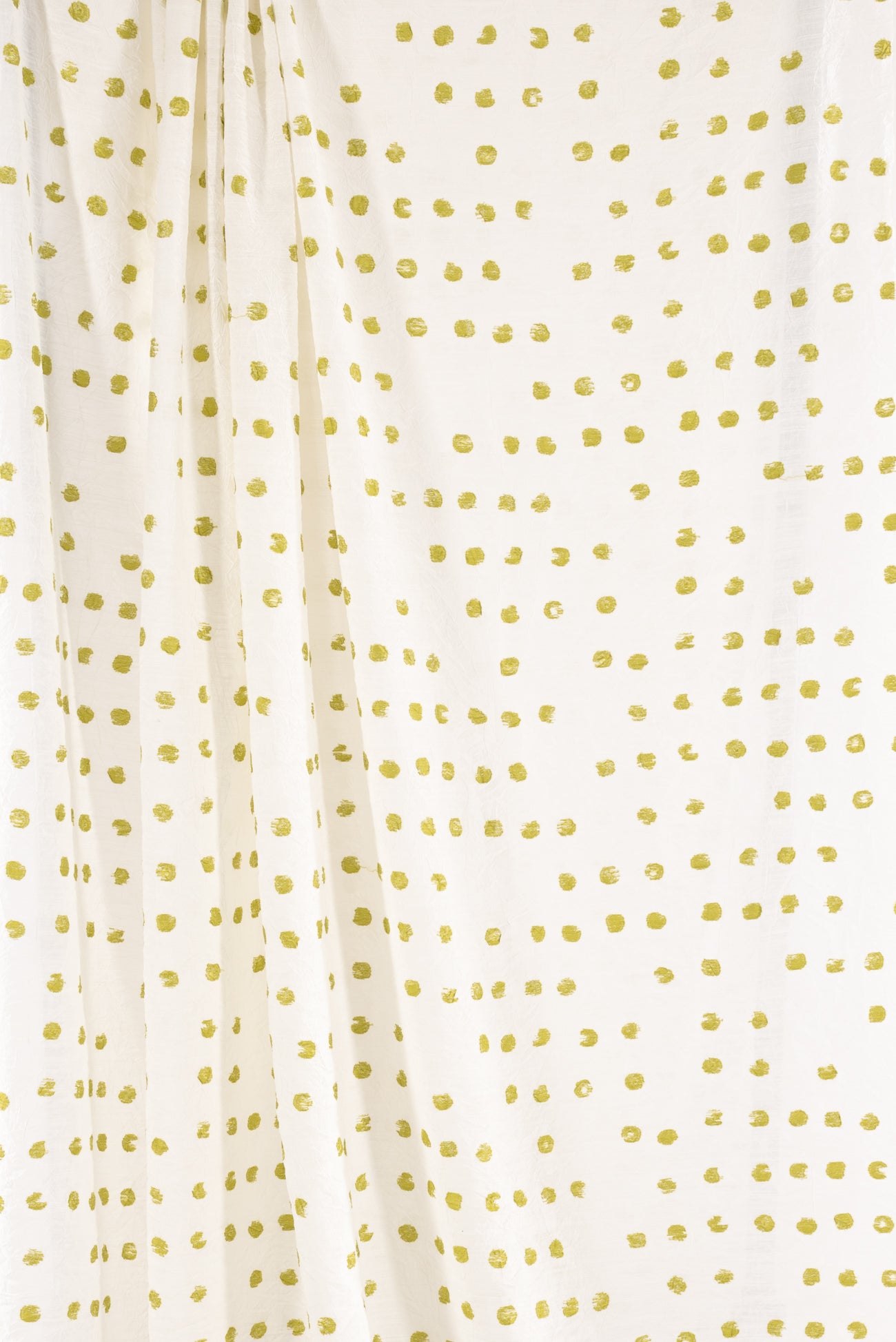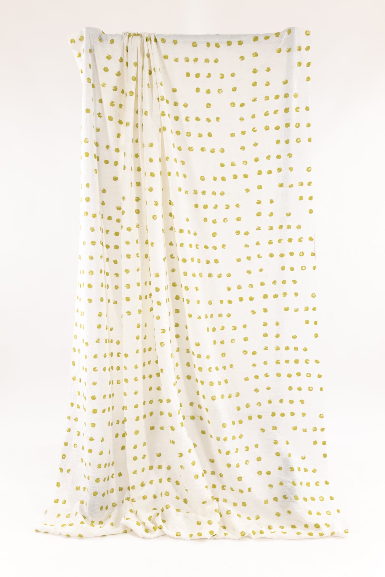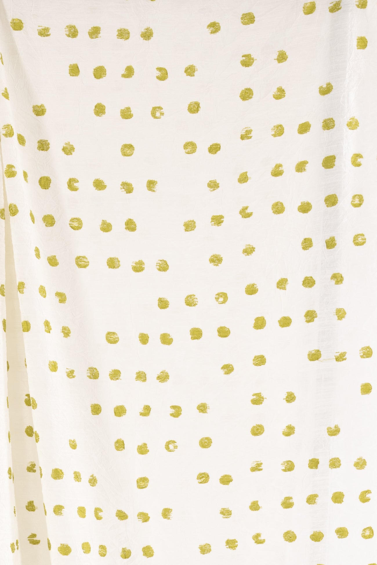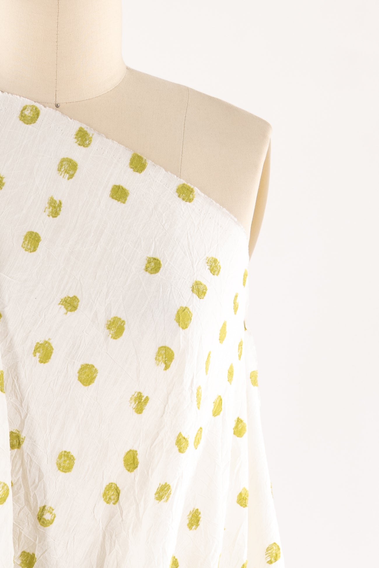 Hand stamped effect lime/acid green 1/2" dots are printed overall on an airy, lightly textured, softly crinkled rayon, deadstock from LA cult couturier Jane Mohr for Dress to Kill. Lightweight, semi-opaque, with a smooth, cool, dry lightly textured hand and airy fluid drape. Right for a dress, shirt, skirt, tunic, soft pants, caftan, menswear.