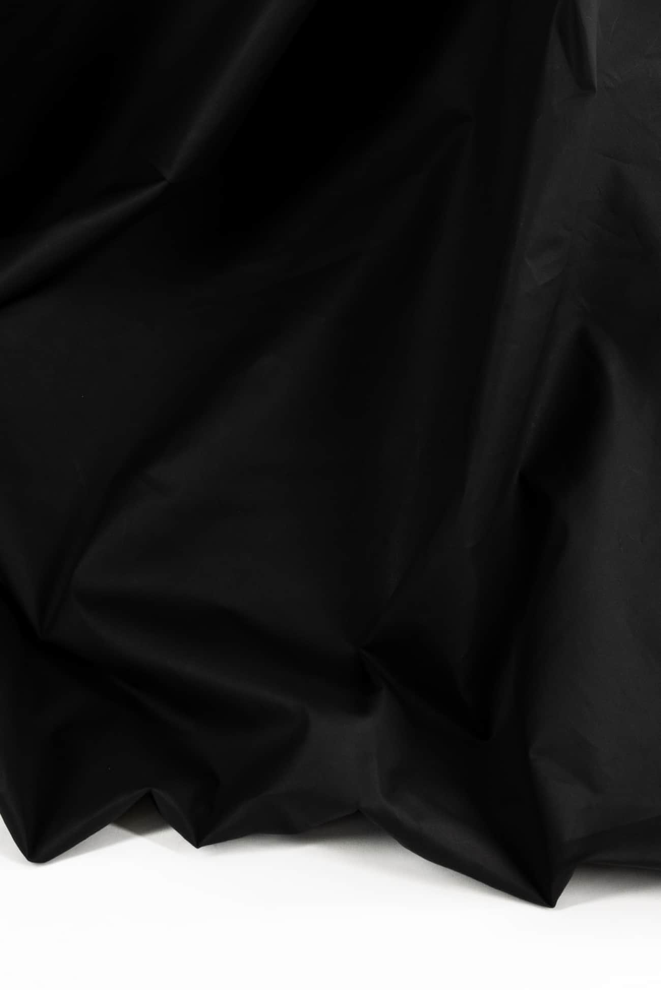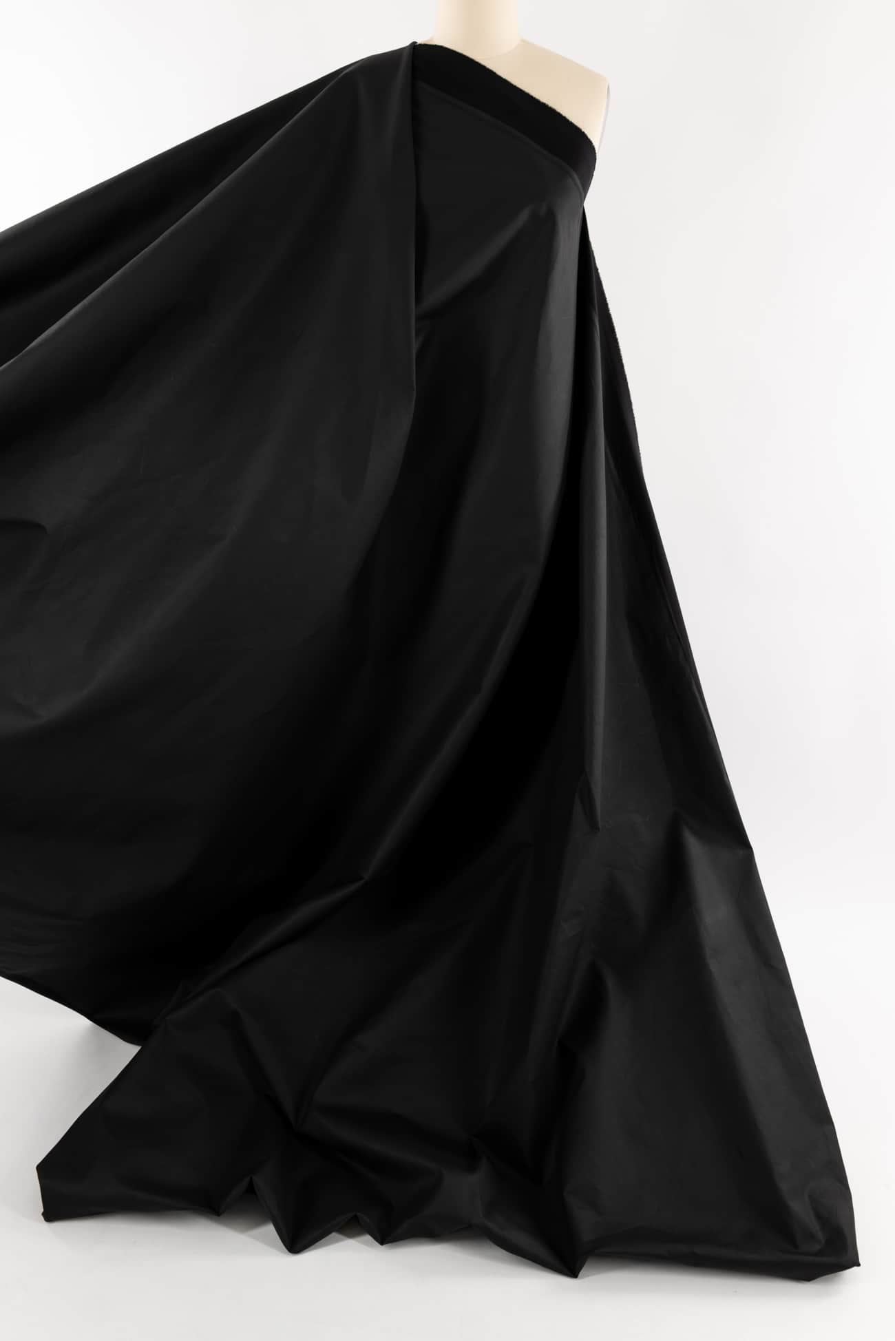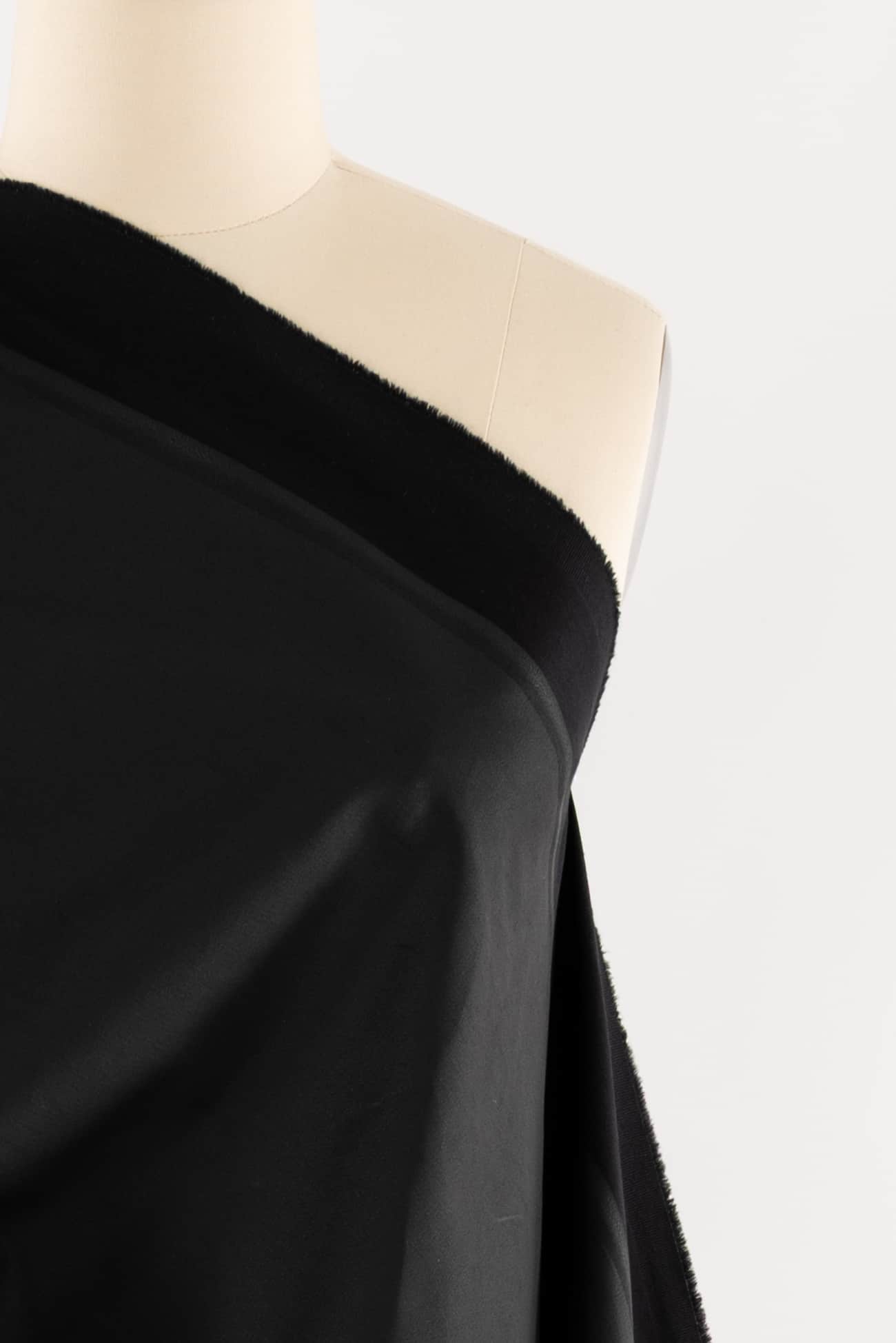 Deep black stretch cotton denim is coated with a matte waterproof finish, fine double-sided deadstock from an LA designer. Beautiful and supple with a smooth dry hand, matte coated surface and lightly crisp drape. Light/mid-weight and right for a coat or jacket, cape or poncho.