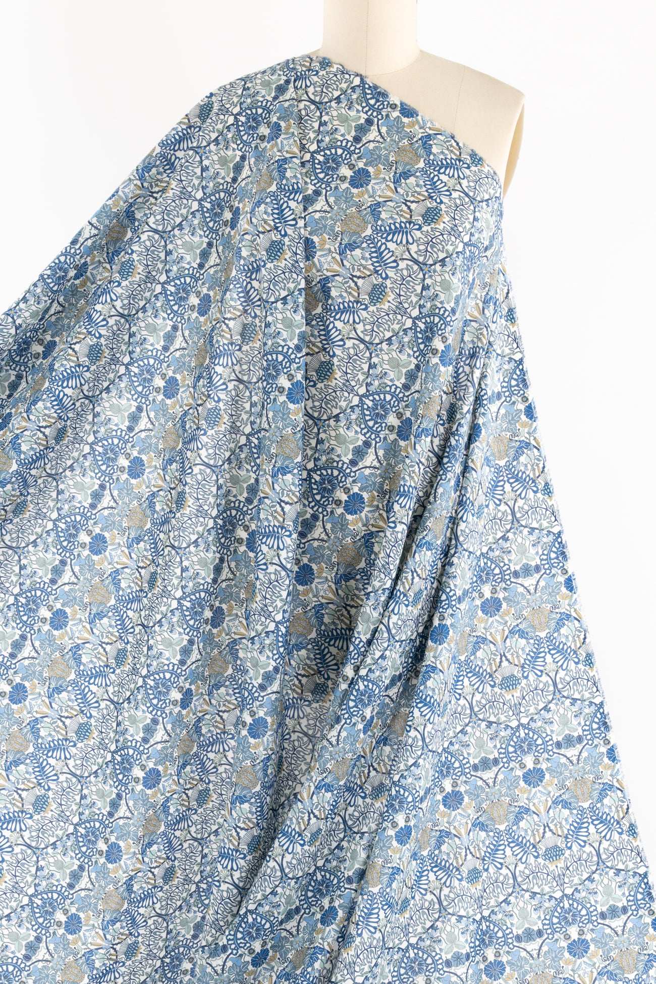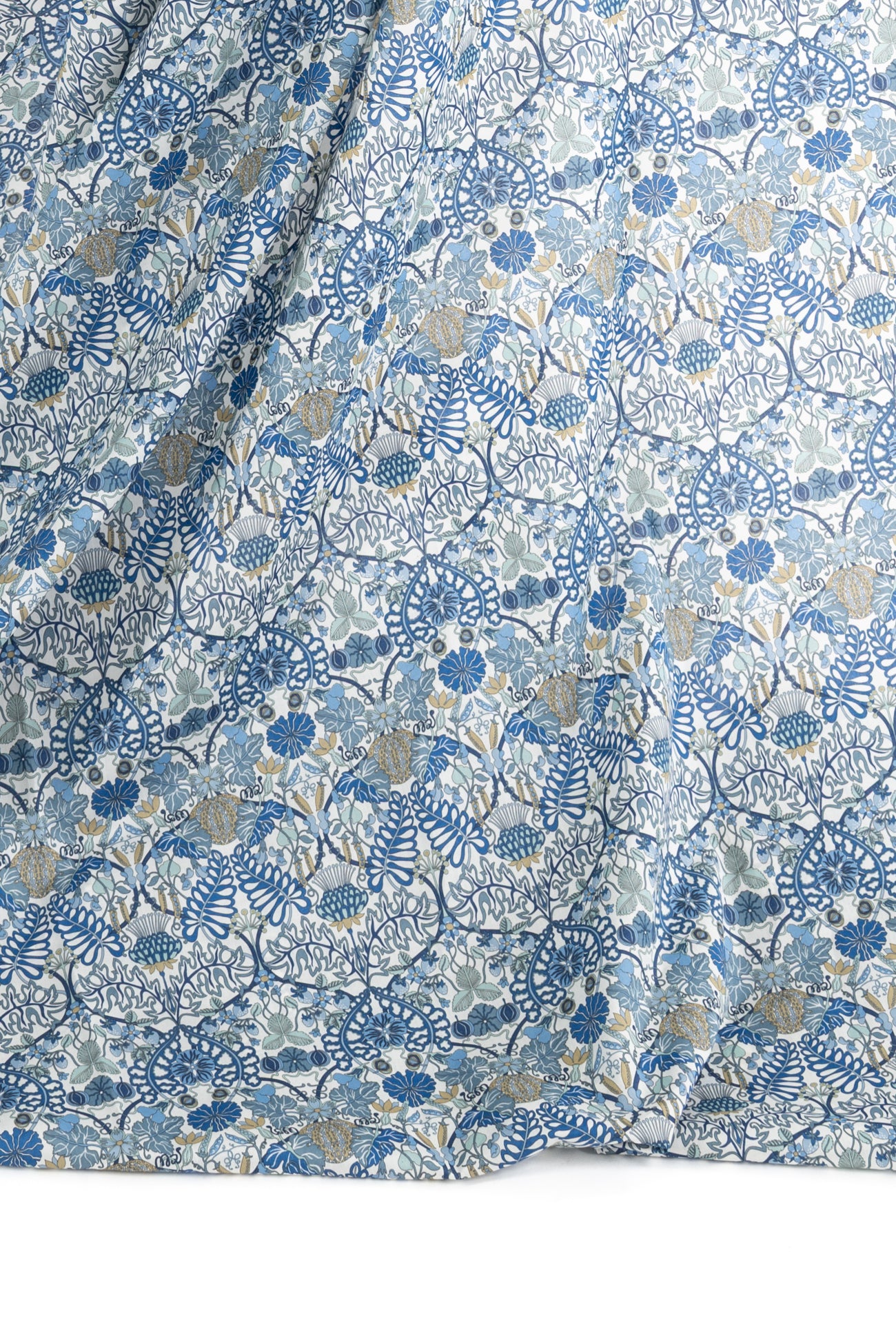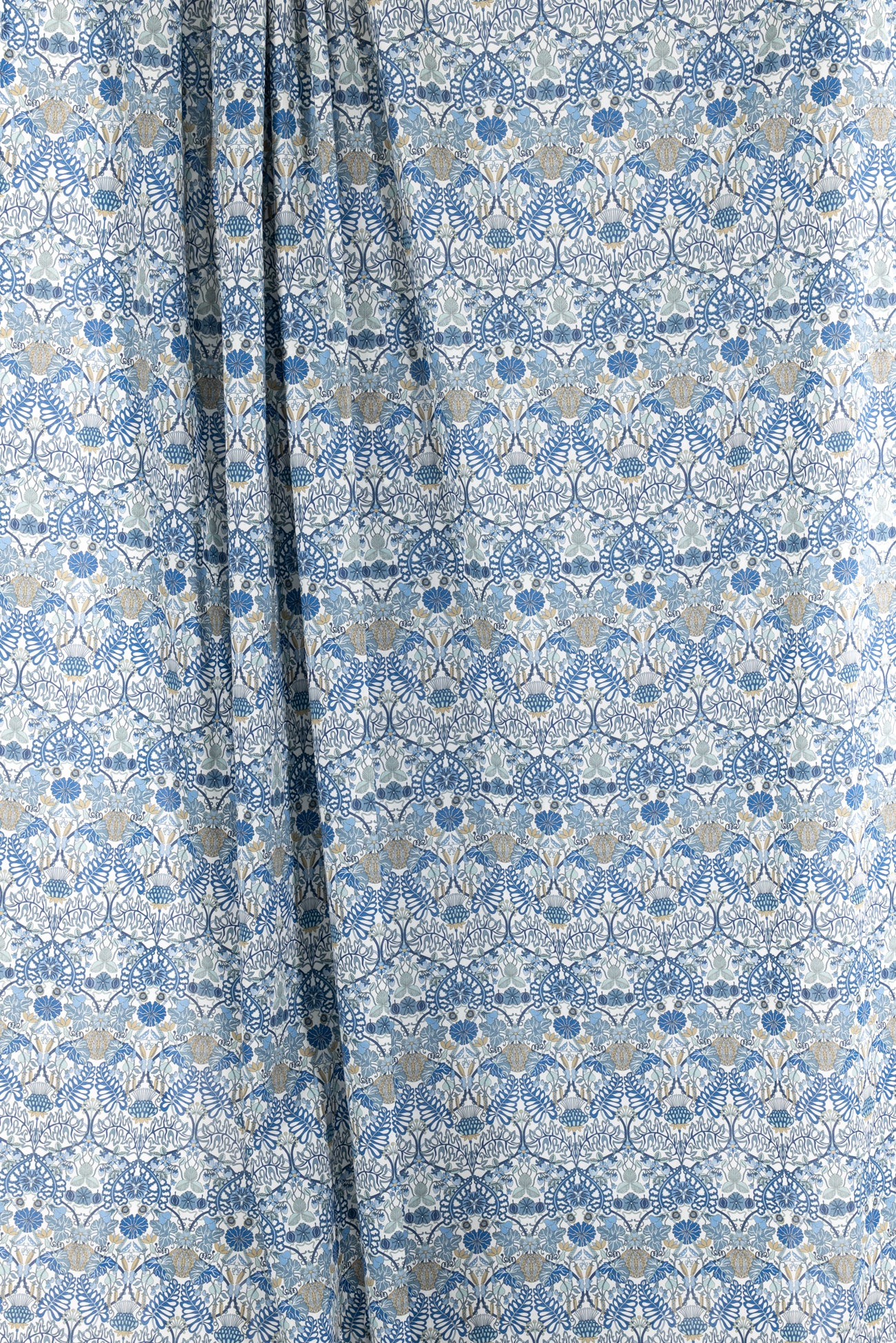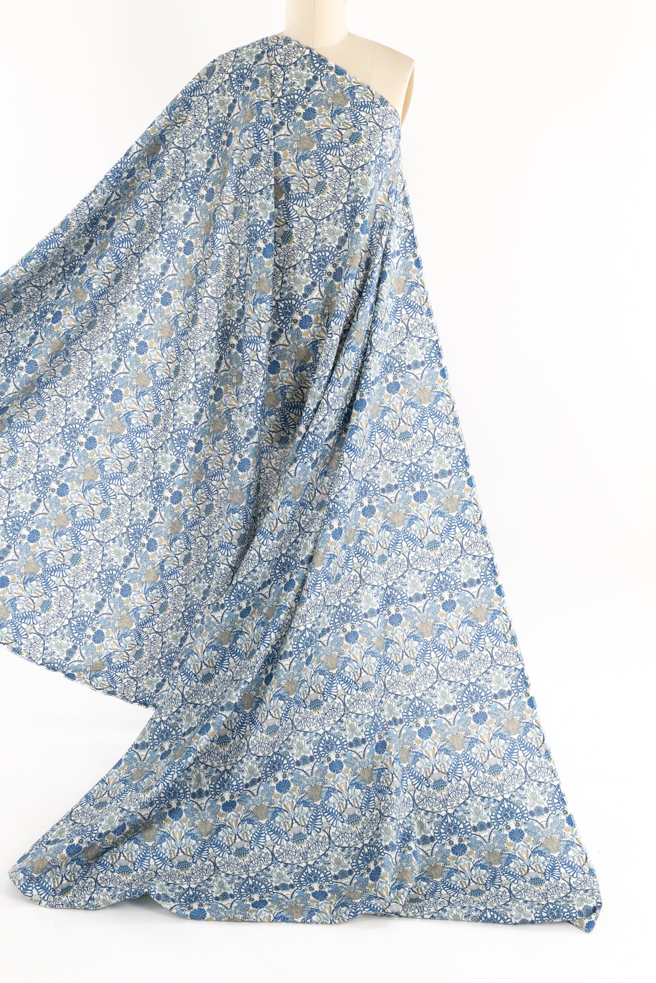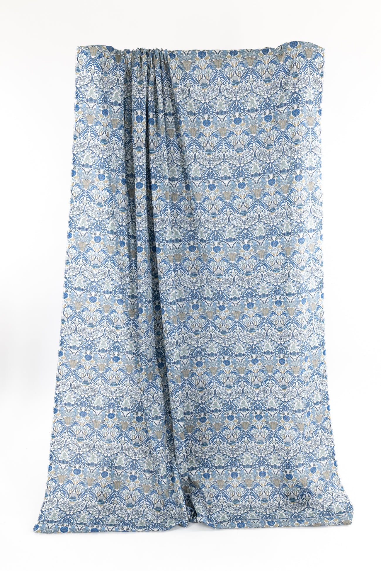 Classic Liberty geometric floral in shades of blue and pale green etched in black on an off-white background. Deadstock from a NYC designer, produced in Northern Italy for Liberty of London, printed on the renowned and exceptional Tana Lawn, the cotton that behaves and feels like silk. Fine-grained, with a cool, smooth, soft hand, fluid drape, depth of color, and one-way design with an 8" repeat. Perfect for a shirt, dress, skirt, tunic, soft pant, caftan, loungewear, children or men, accessories or home decor. Right to wear everyday or for statement pieces. OEKO-TEX® certified.