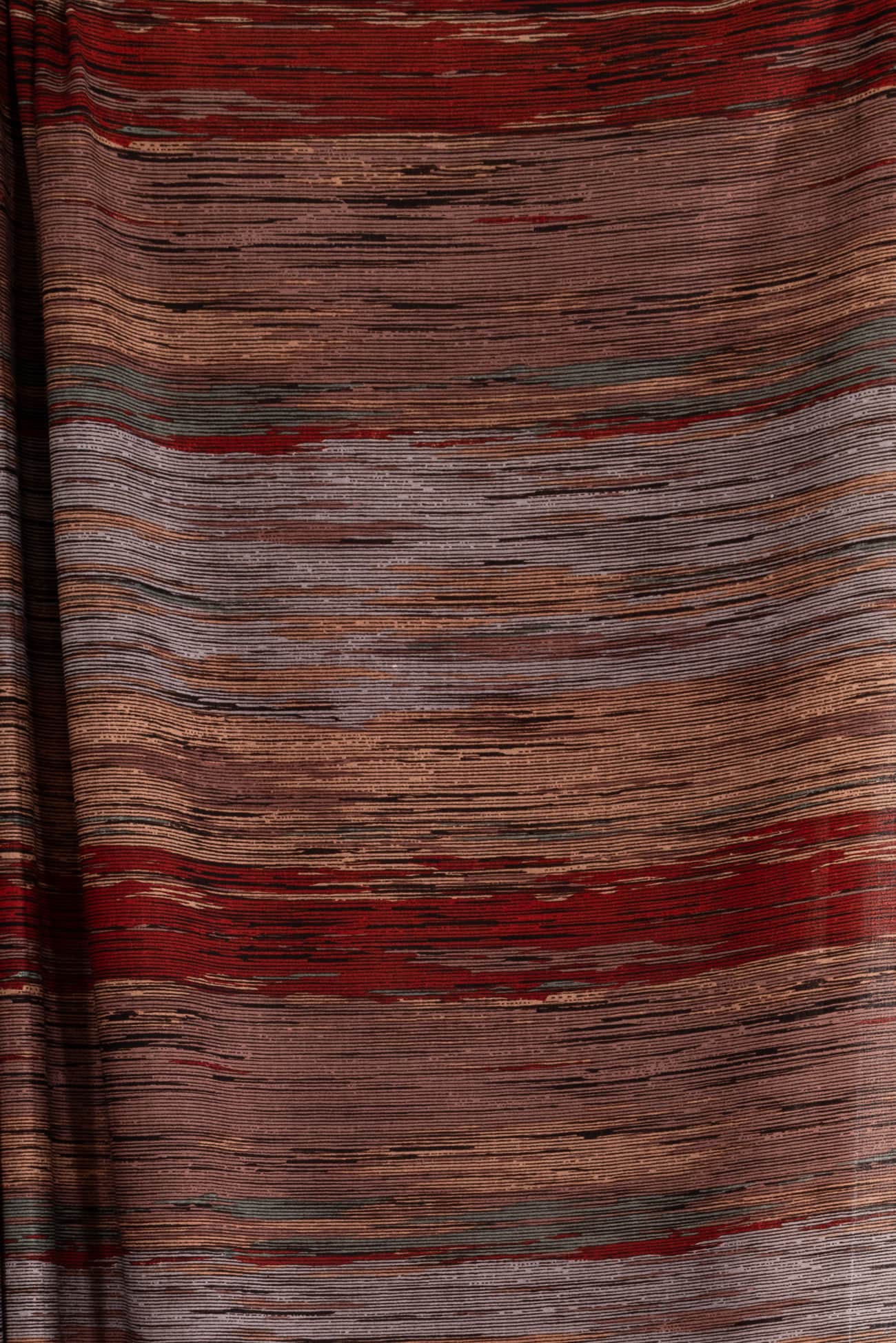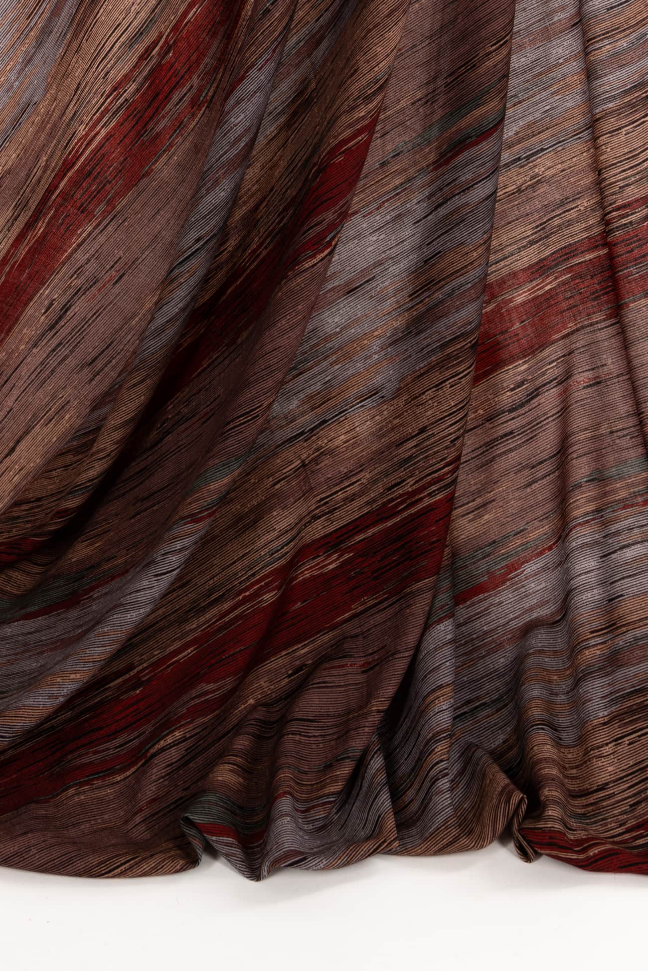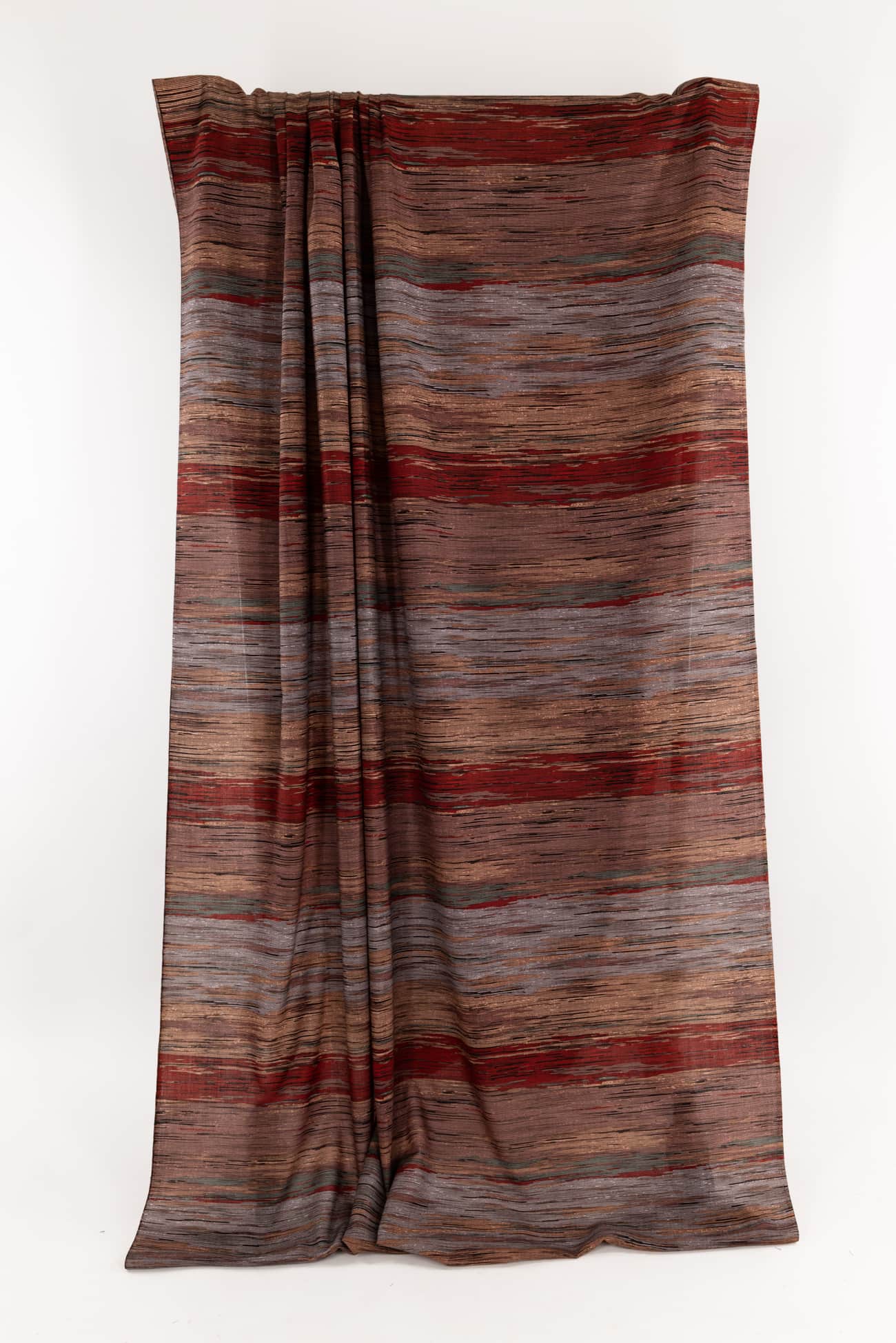 Sophisticated stripes in shades of rust, cocoa and black on a beautiful silk and wool woven. Fine quality digital print deadstock from an Italian mill. Lightweight, with a smooth matte hand, 19½" repeat, airy drape and could be used for both tops and bottoms. To line or not. Right for a shirt, dress, skirt, soft pant, light vest, cardi, kimono or caftan.