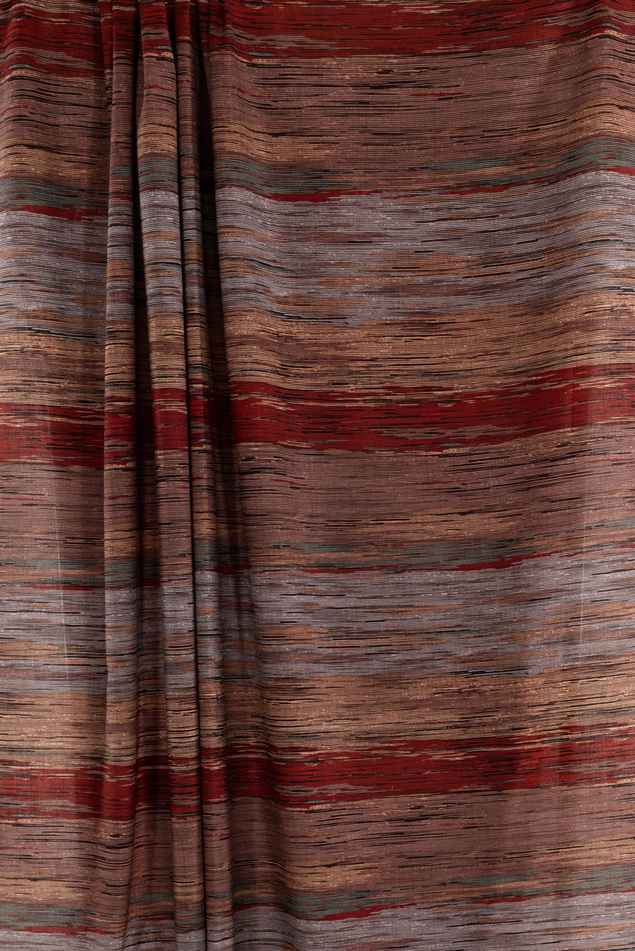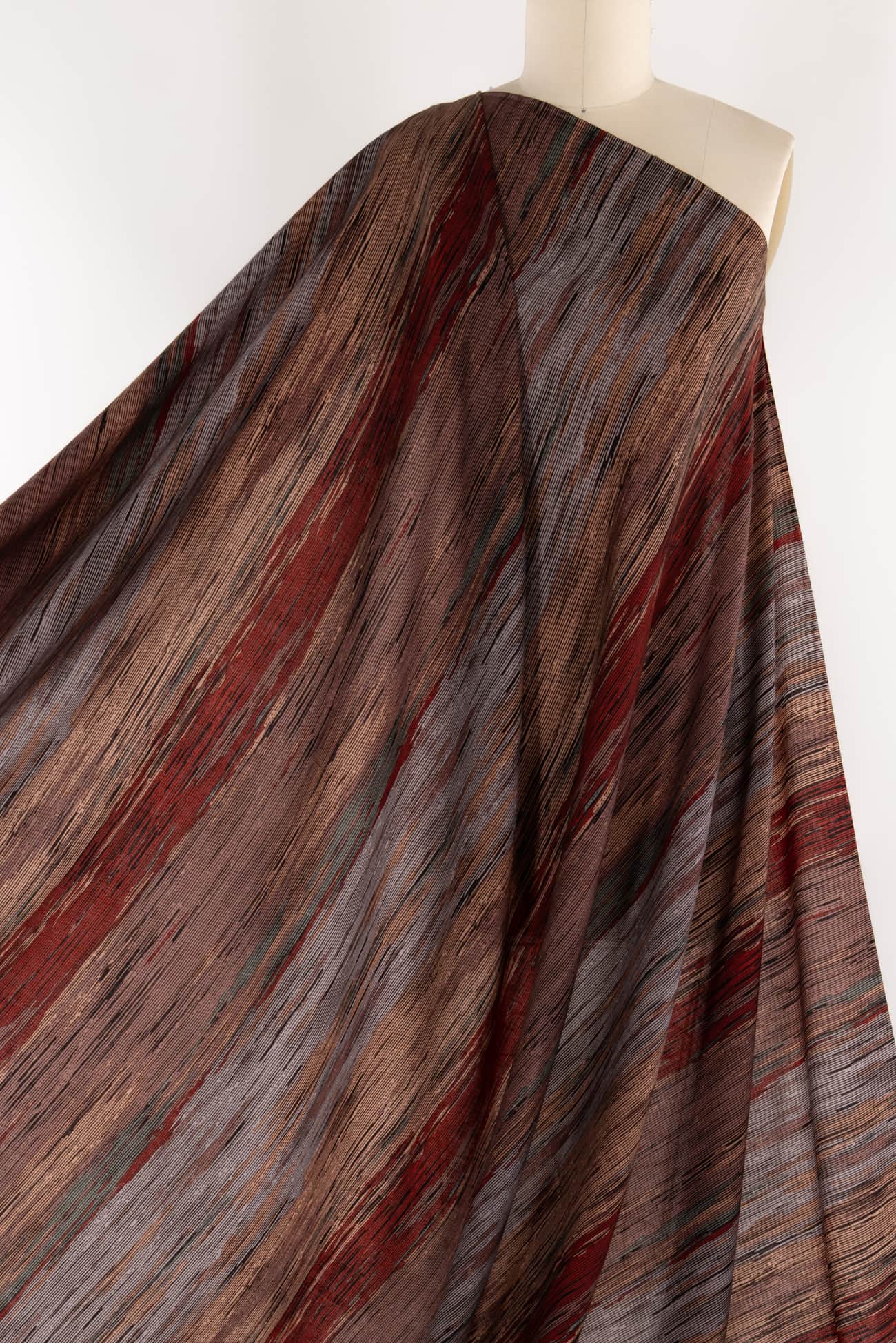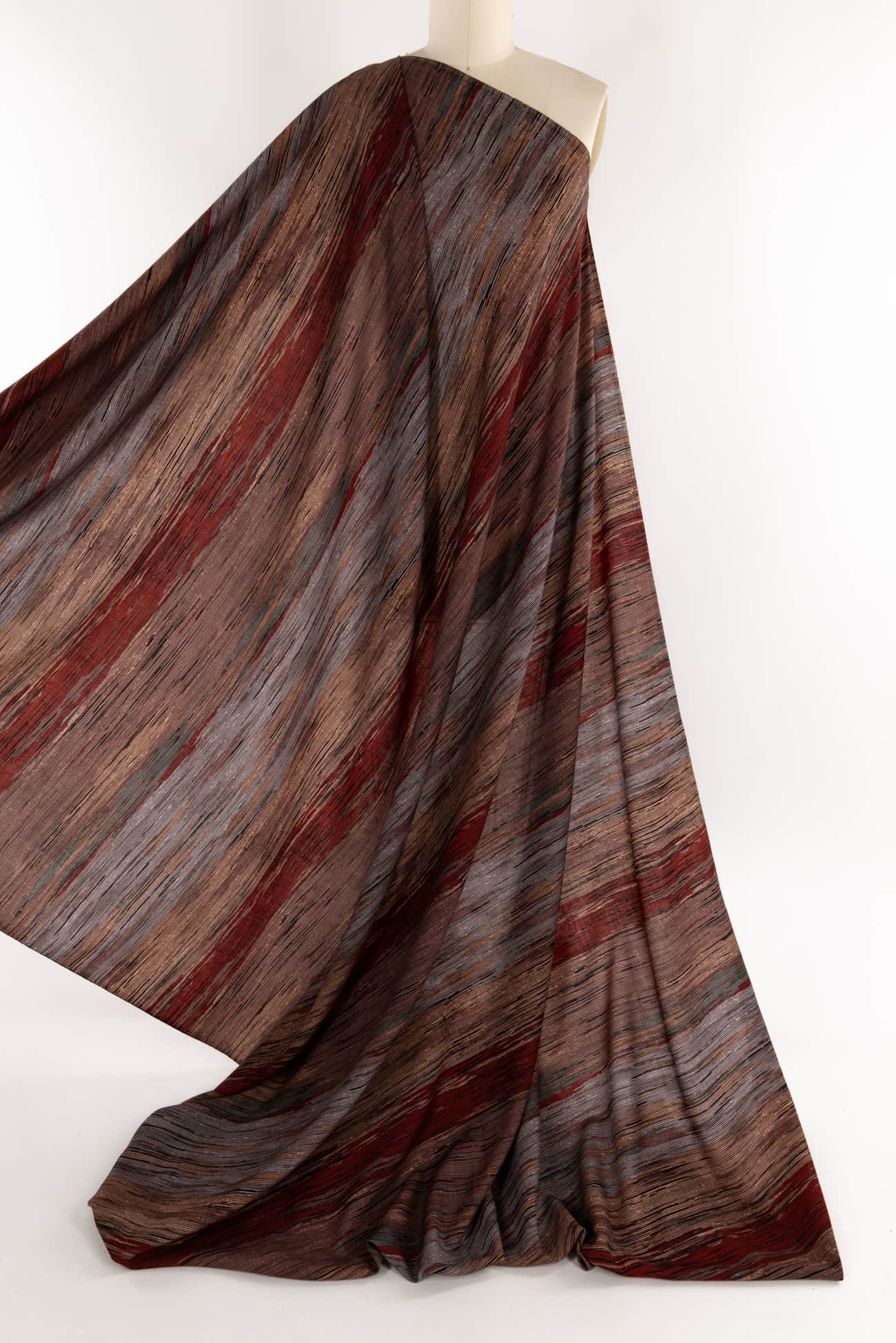 Sophisticated stripes in shades of rust, cocoa and black on a beautiful silk and wool woven. Fine quality digital print deadstock from an Italian mill. Lightweight, with a smooth matte hand, 19½" repeat, airy drape and could be used for both tops and bottoms. To line or not. Right for a shirt, dress, skirt, soft pant, light vest, cardi, kimono or caftan.