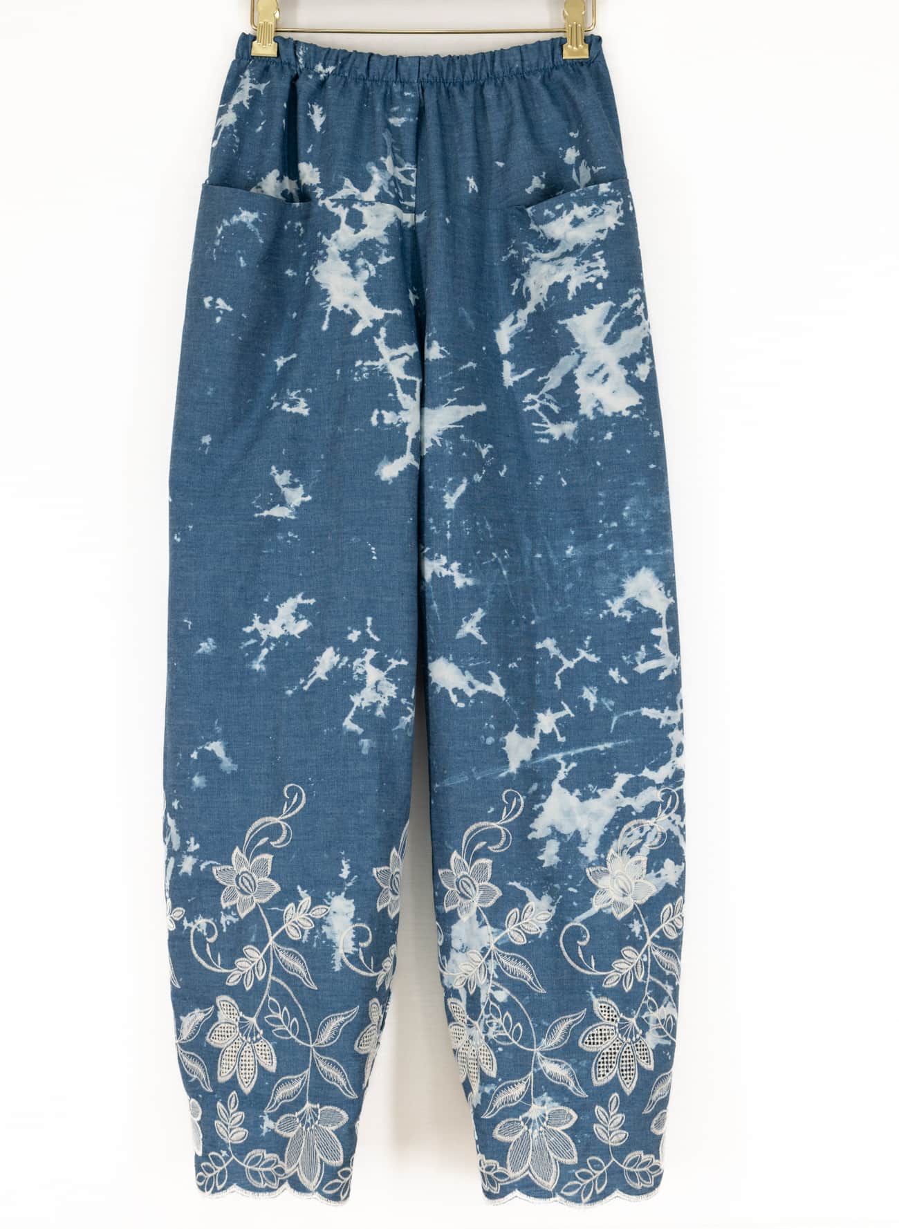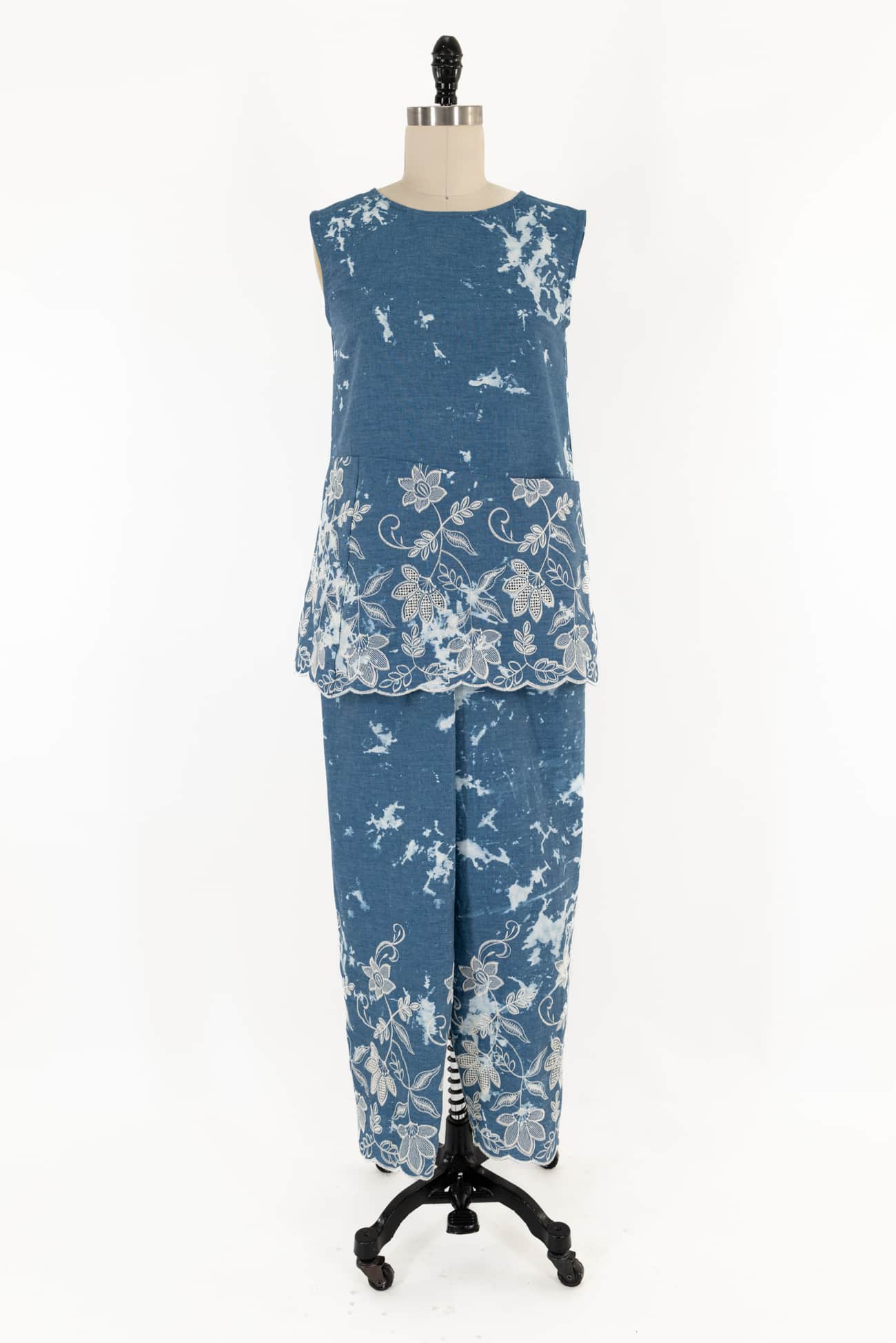 Classic chambray, (lightweight denim), is randomly dyed and enhanced with a graceful creamy white embroidered and scalloped 14" floral border on one side, deadstock from an LA designer. Mid shirting weight with a smooth dry hand, softly textured embroideries, soft drape and 11½" repeat. Perfect for a tunic, shirt, dress, soft pant, skirt, light jacket, flowery workwear or children's. Shown here in Marcy's V9193 top and pants.