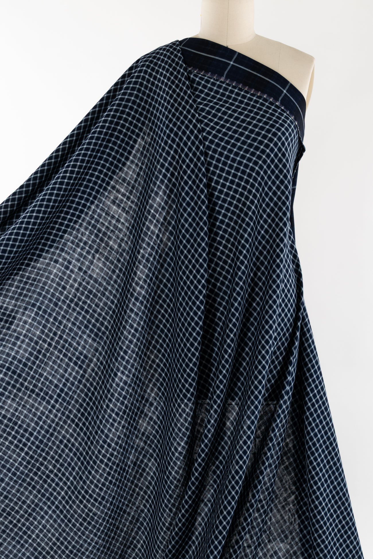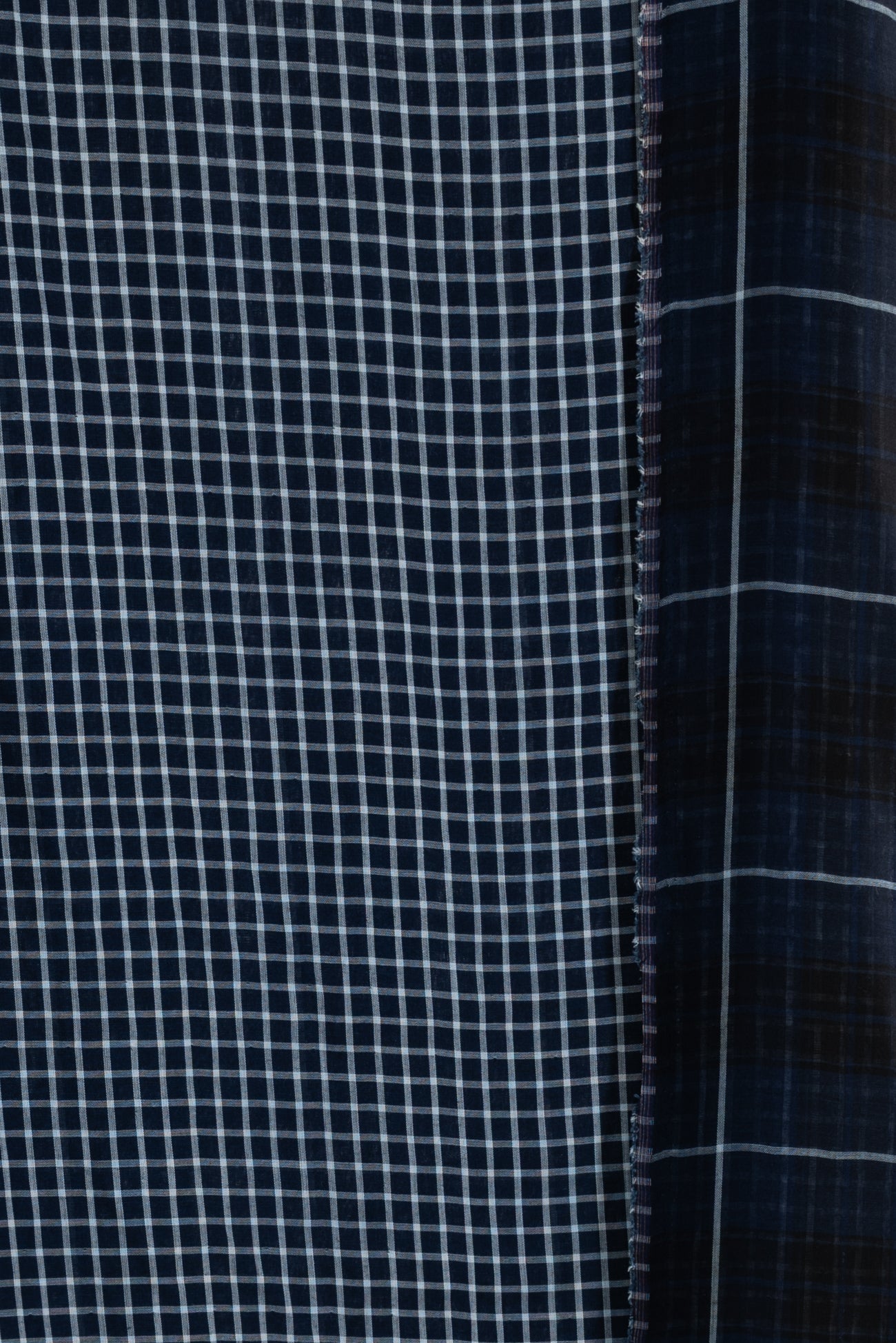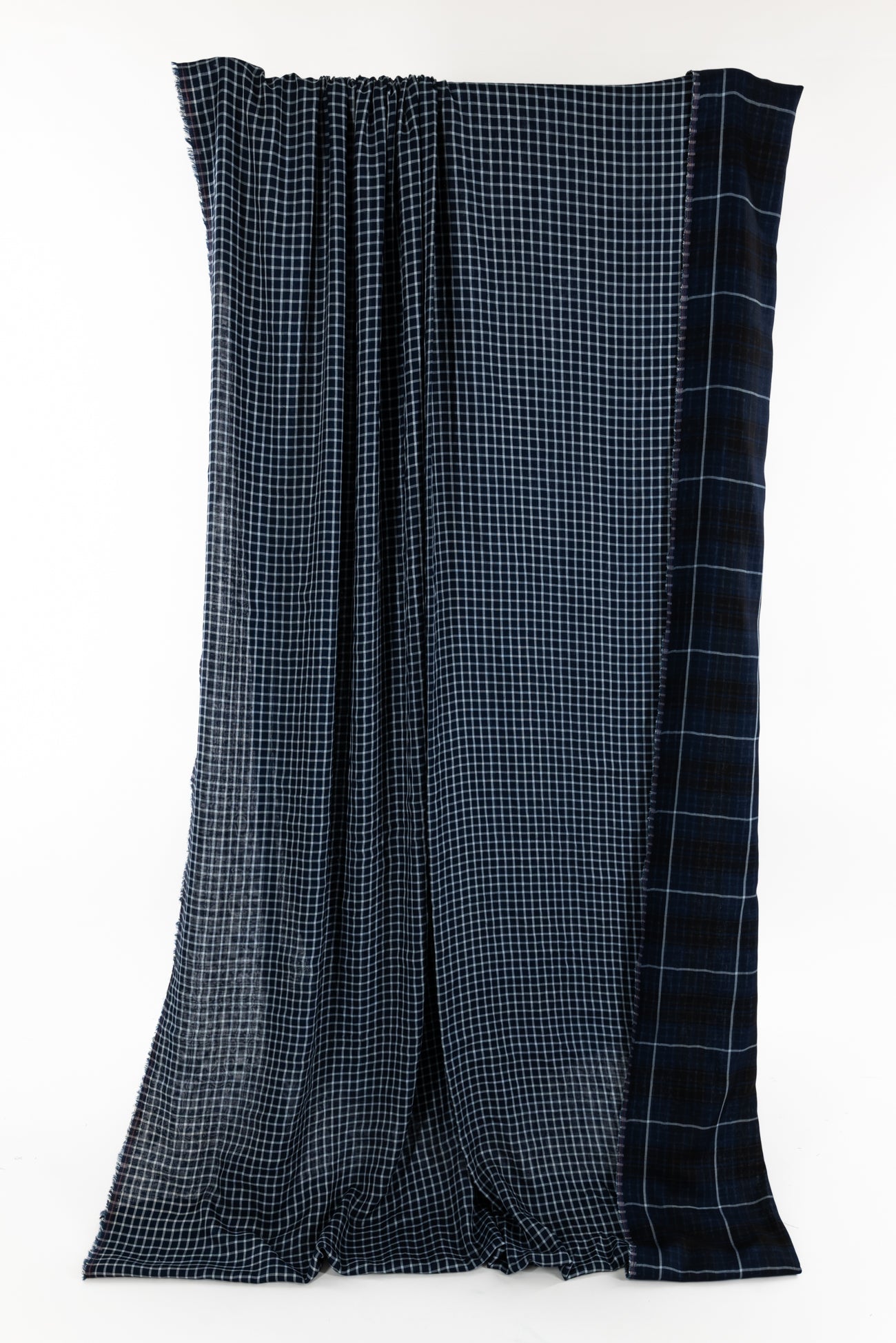 Classic navy and white windowpane check on one side, large-scale open plaid on the reverse, deadstock cotton double woven from an LA designer. Light shirting weight, opaque with a soft, smooth hand, 3" repeat, and light drape. Use either or both sides. Perfect for a shirt, tunic, skirt, dress, soft pants, men's, or children's wear.