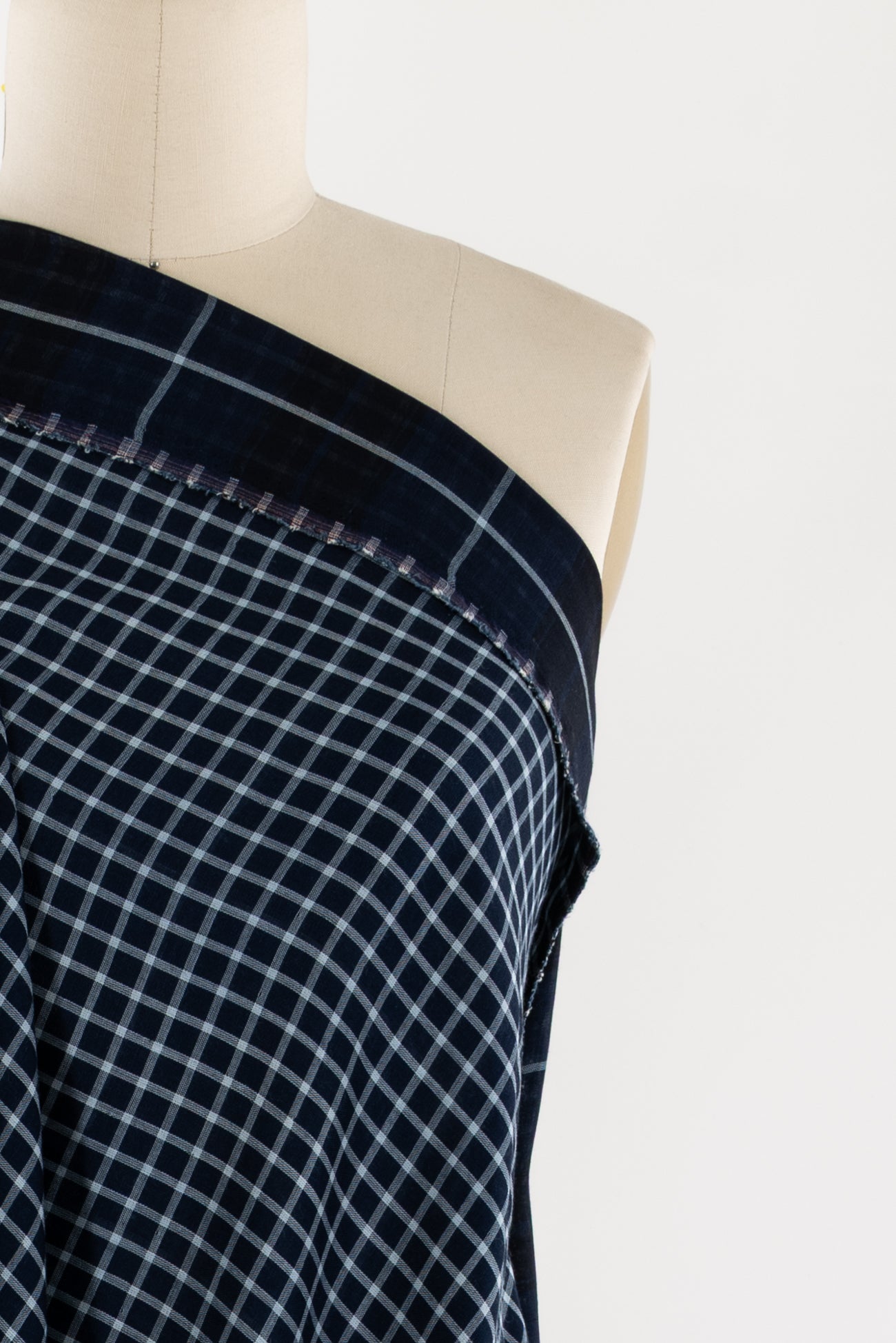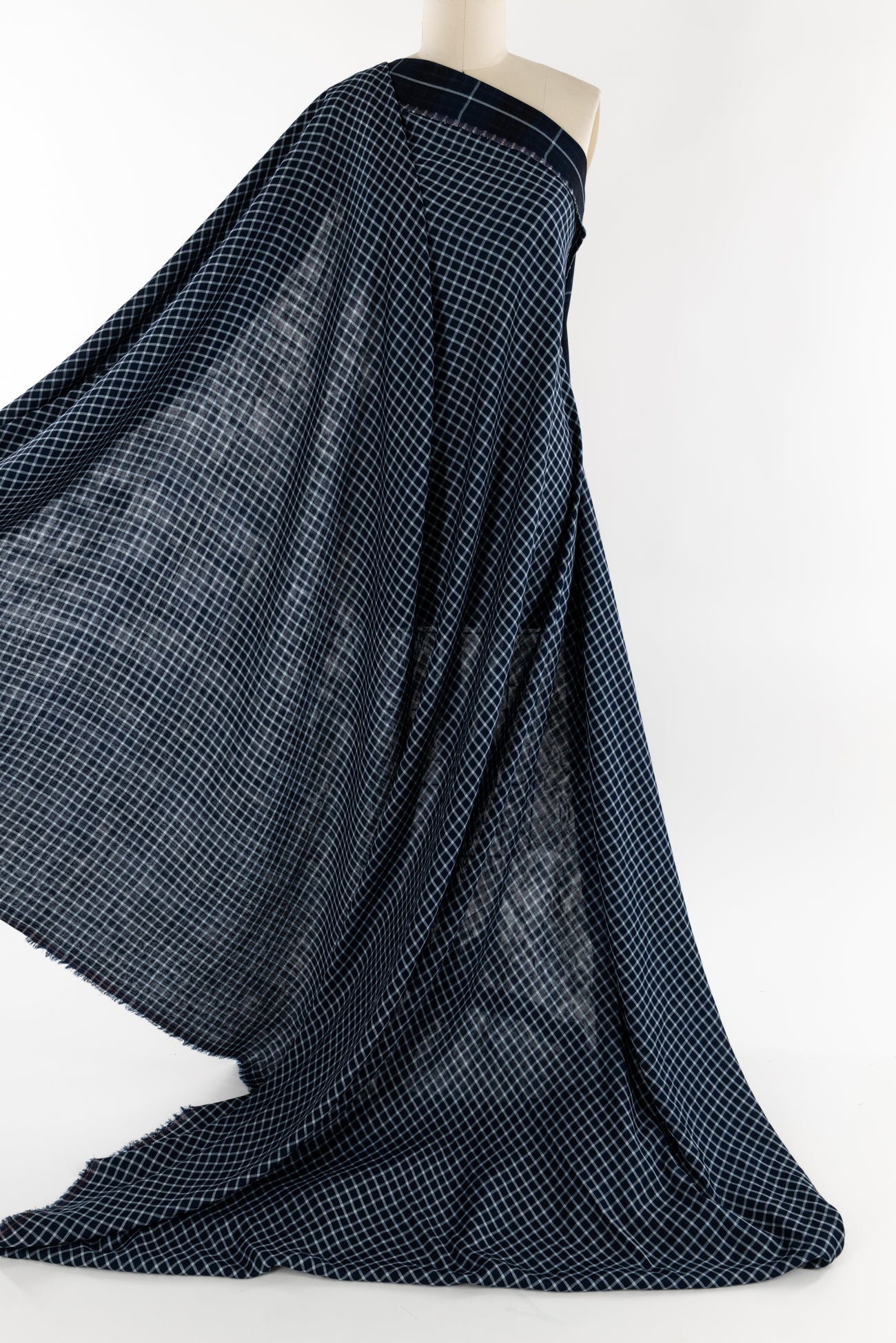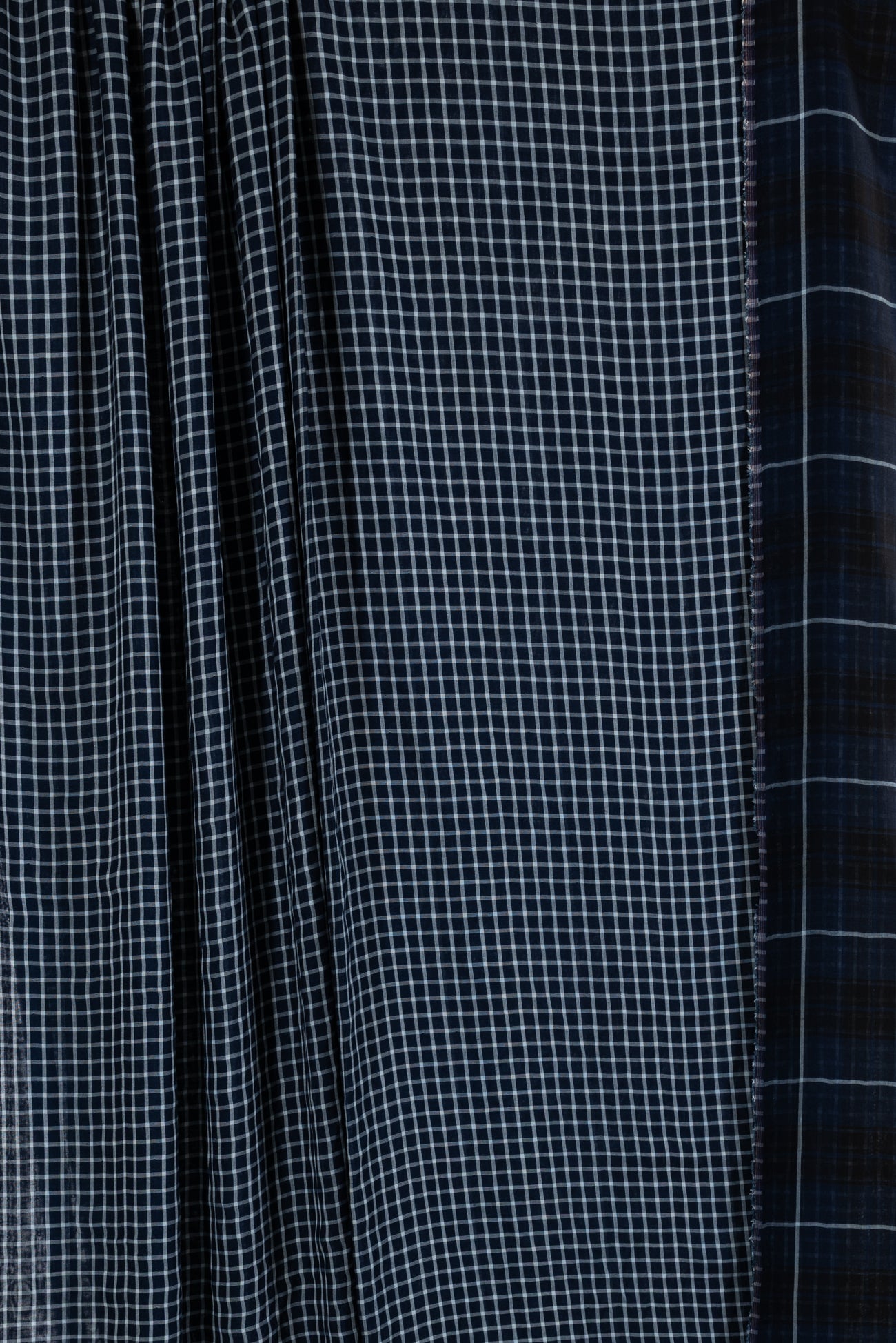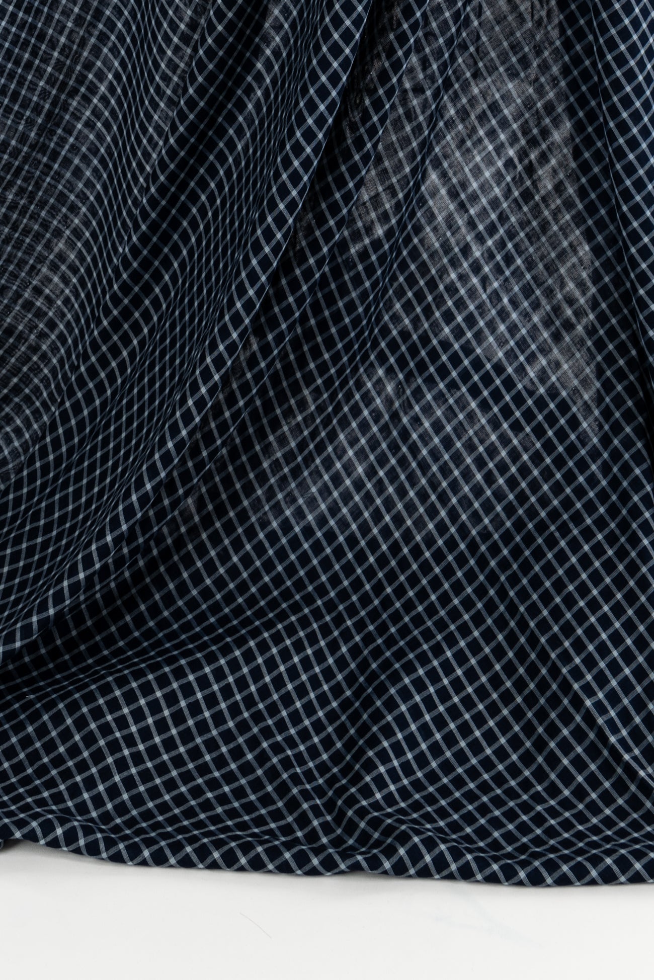 Classic navy and white windowpane check on one side, large-scale open plaid on the reverse, deadstock cotton double woven from an LA designer. Light shirting weight, opaque with a soft, smooth hand, 3" repeat, and light drape. Use either or both sides. Perfect for a shirt, tunic, skirt, dress, soft pants, men's, or children's wear.