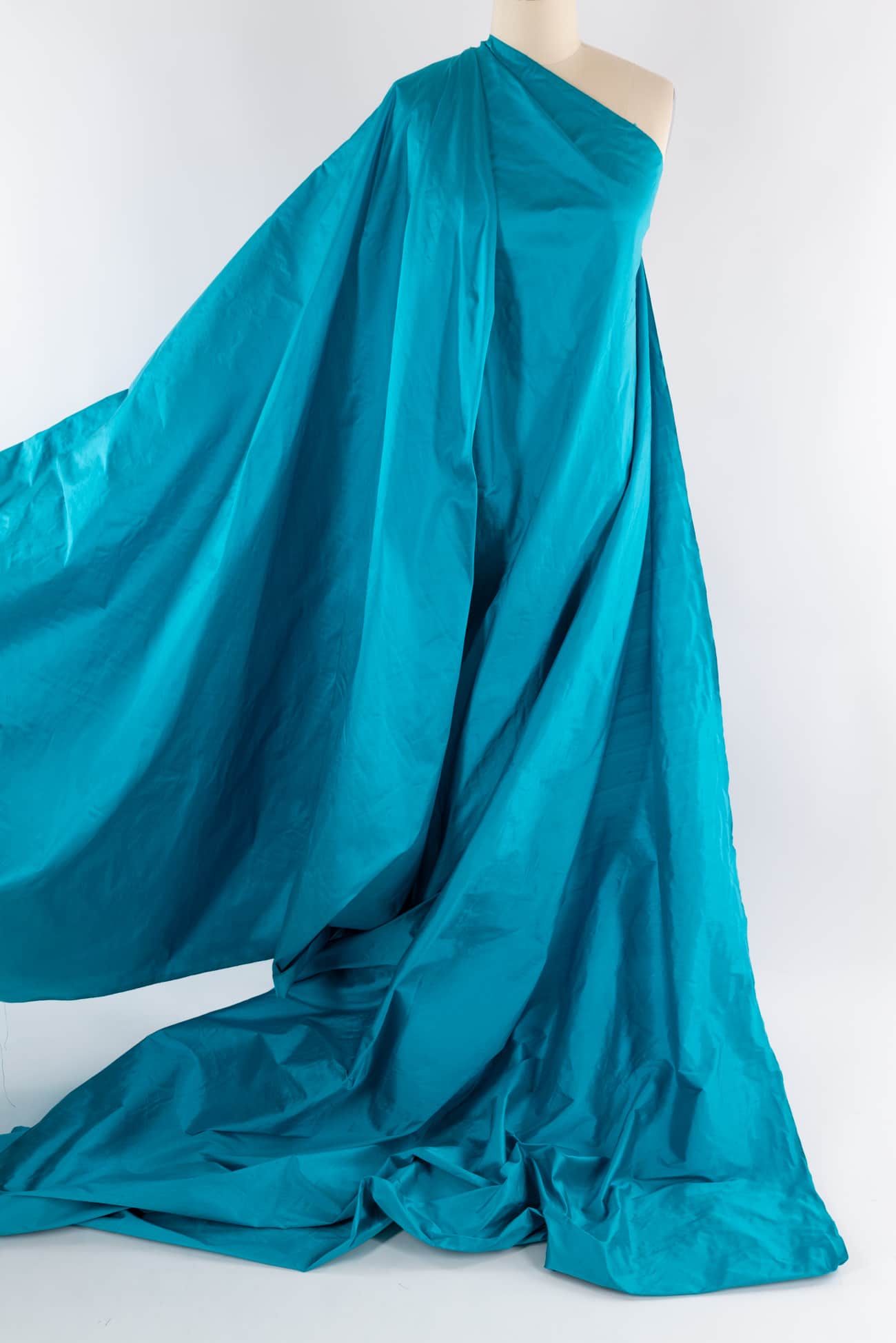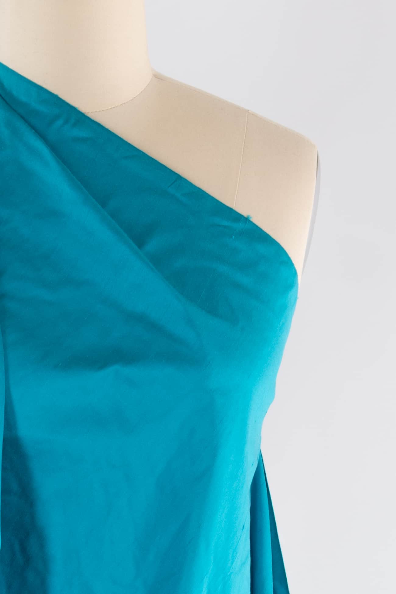 Classic silk dupioni* in jewel-toned turquoise, fine quality deadstock from an LA designer. Light/shirting weight, opaque, softly textured, with a soft hand and lightly crisp yet malleable drape. Dress it up or down, make a dress, shirt, skirt, vest, soft pant, light jacket, or duster coat. Makes a luxurious lining, works for accessories and home decor too. A silk jacket or vest is a basic in my wardrobe and makes a smooth layering piece to slide over/under other garments and travels well. Limited quantity.