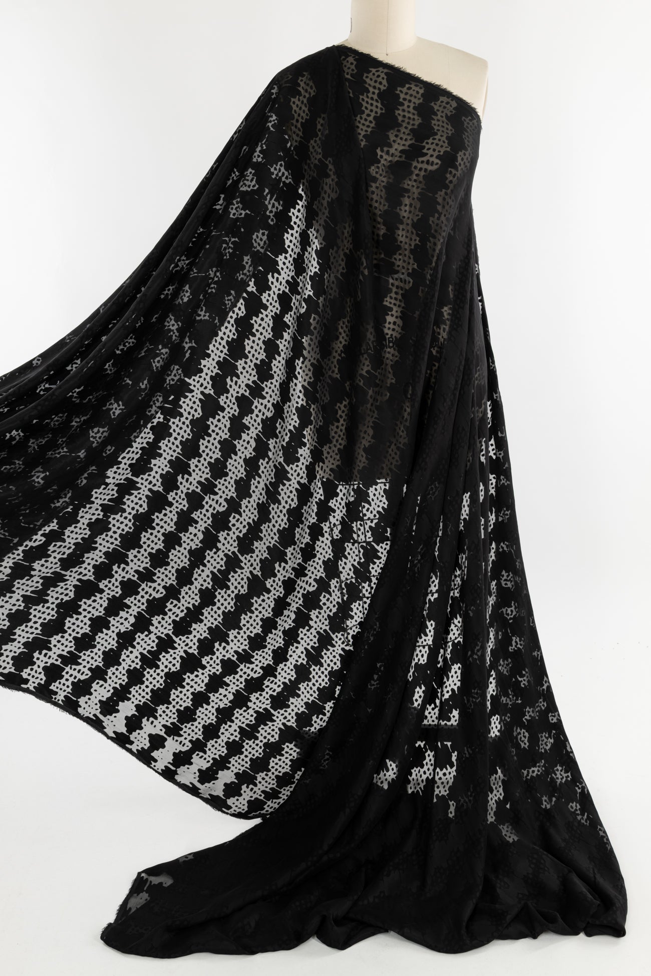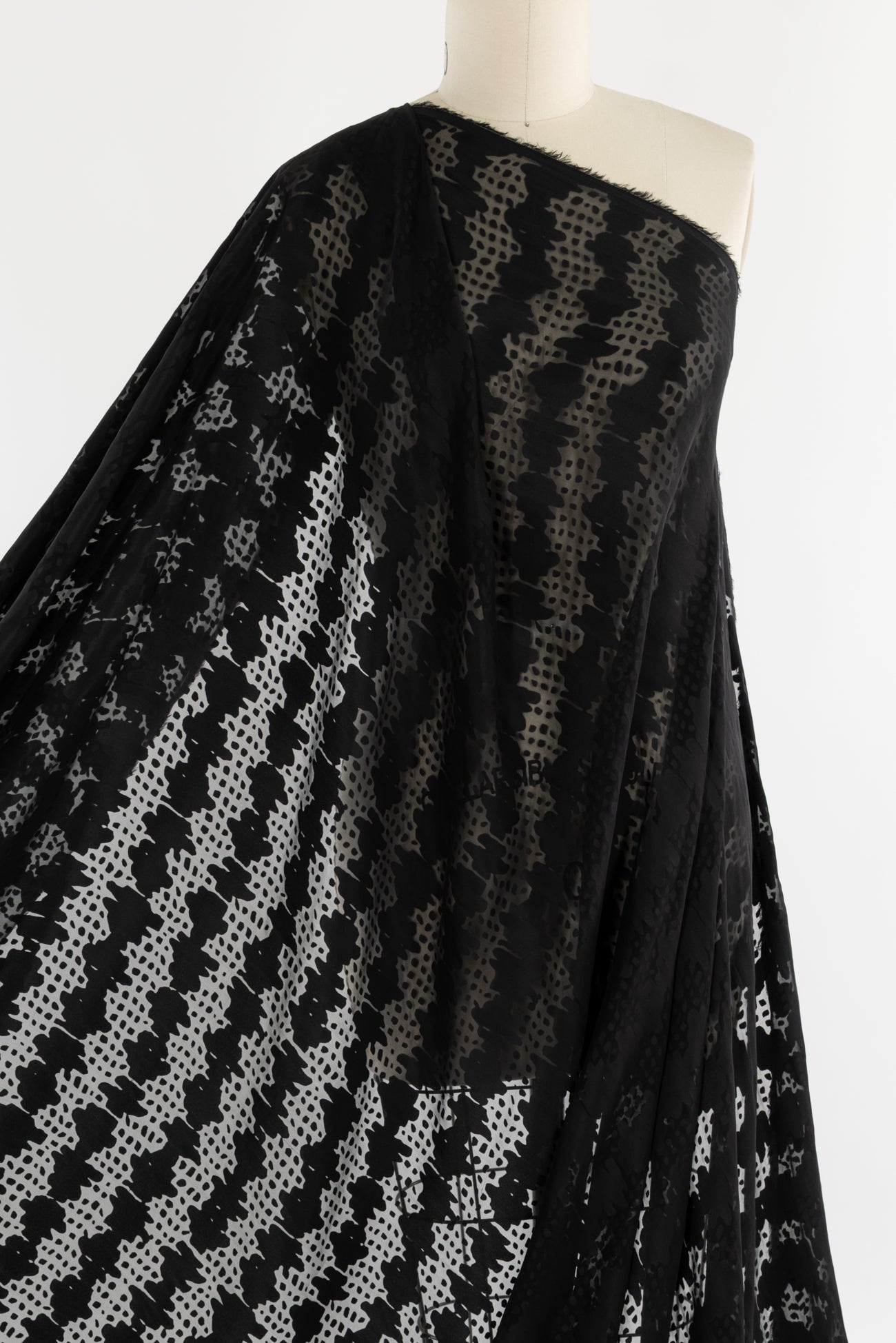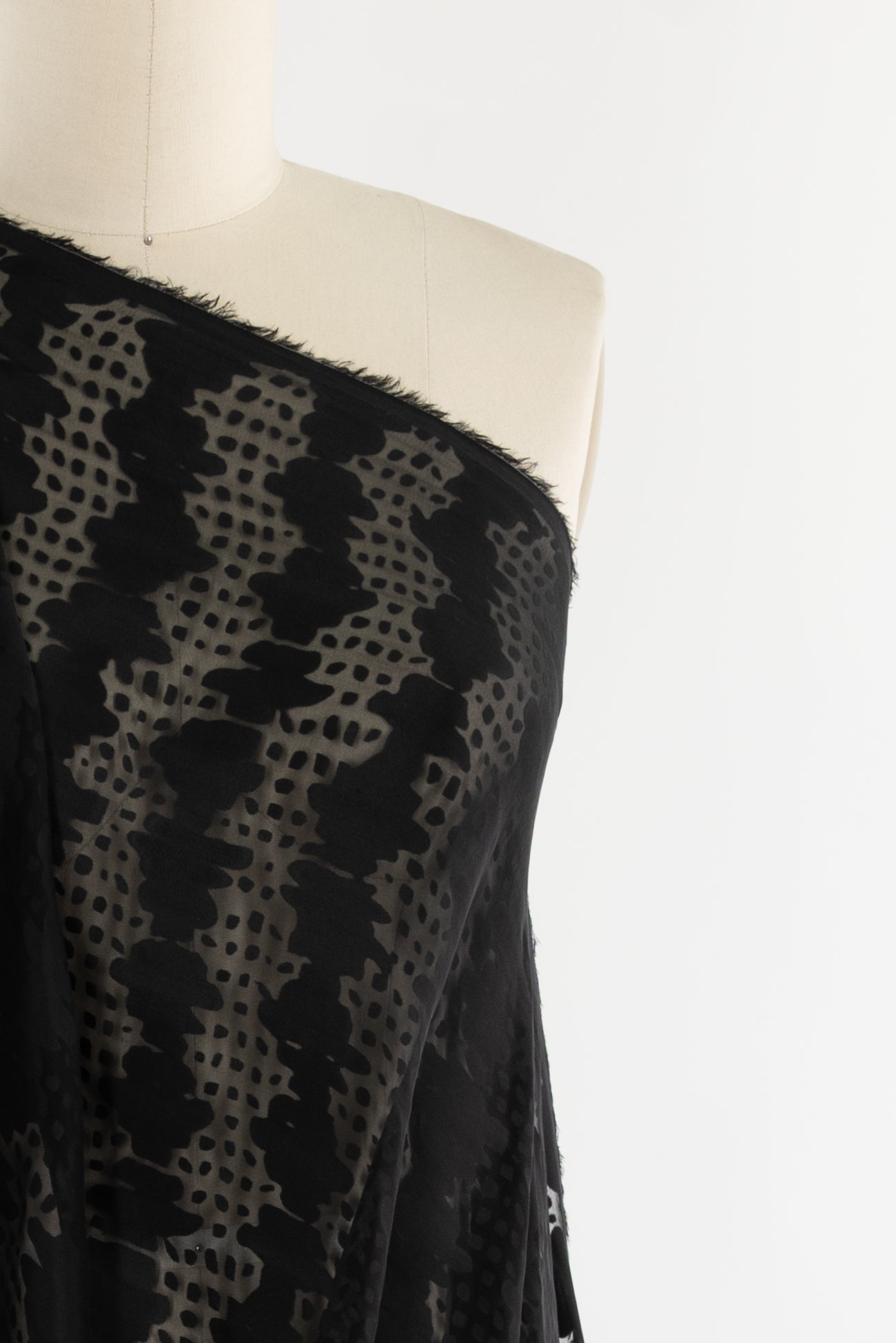 Striking singular eyelash jacquard weave with dots and stylized flowers in black. Fine quality deadstock from a NYC designer is semi-sheer, silky smooth, and supple, with a 2¼" repeat. Solid areas have a satin finish feel delicious. Right for layering or to line, making an airy jacket, shrug, shirt, tunic, dress, skirt, vest, or soft pants.