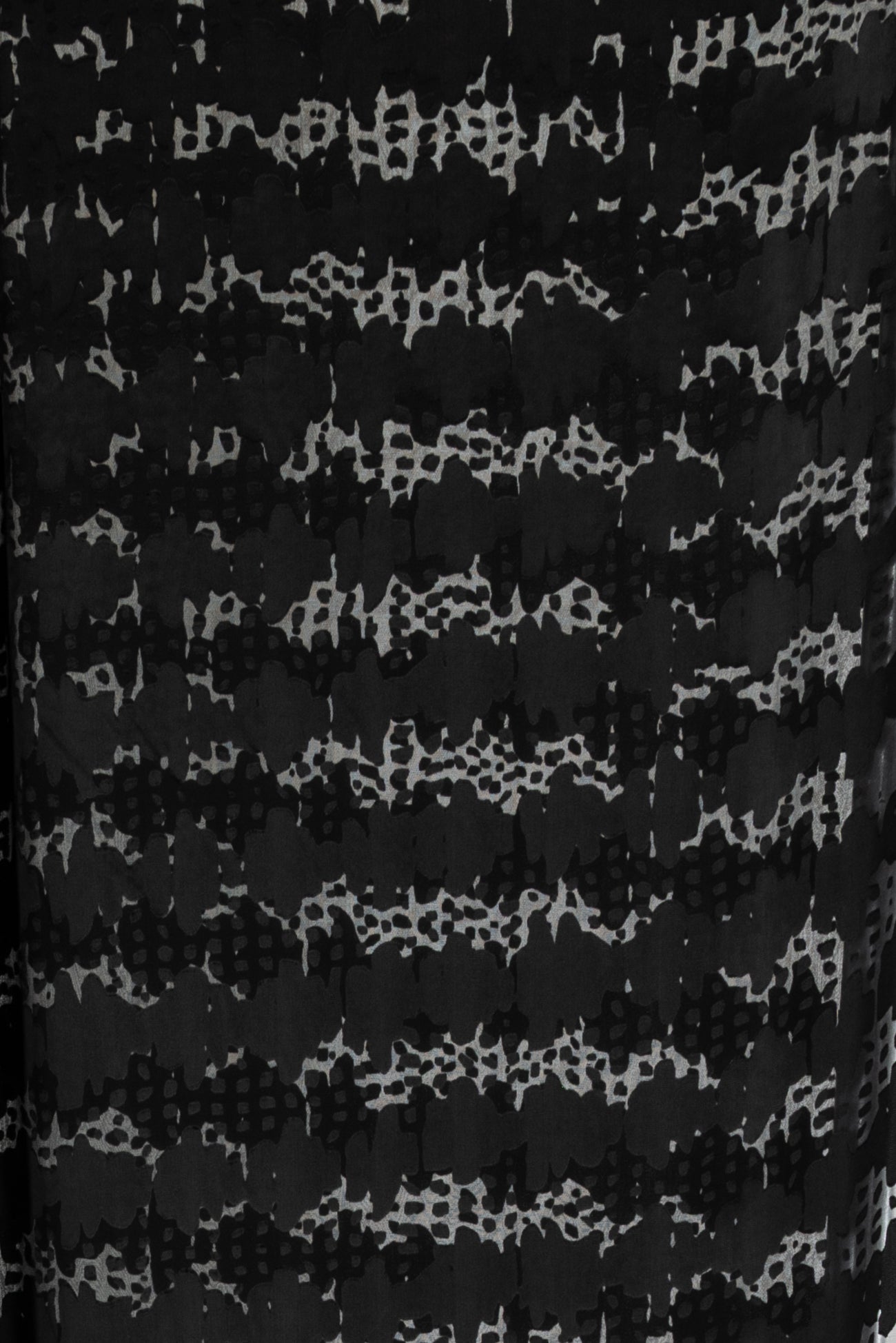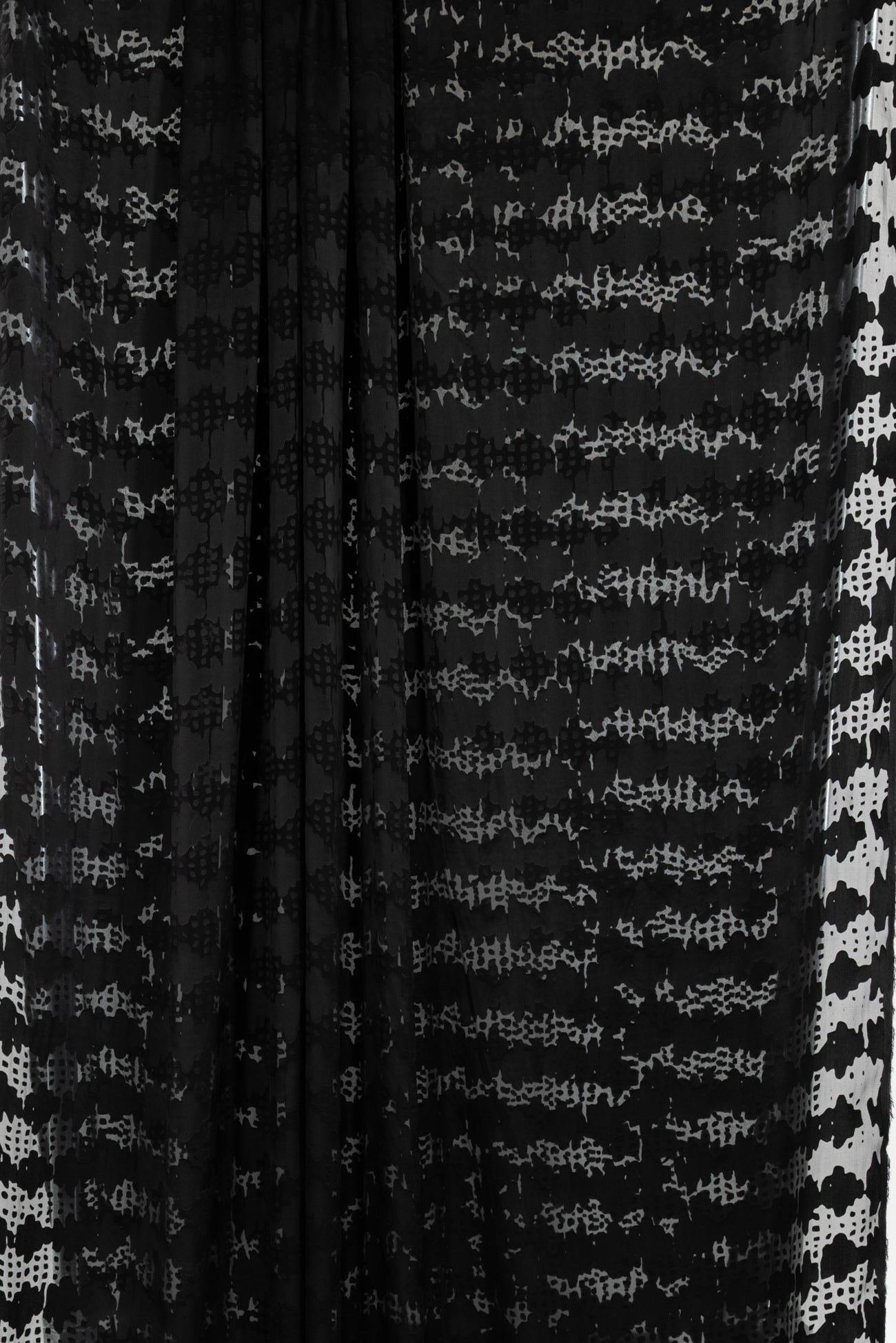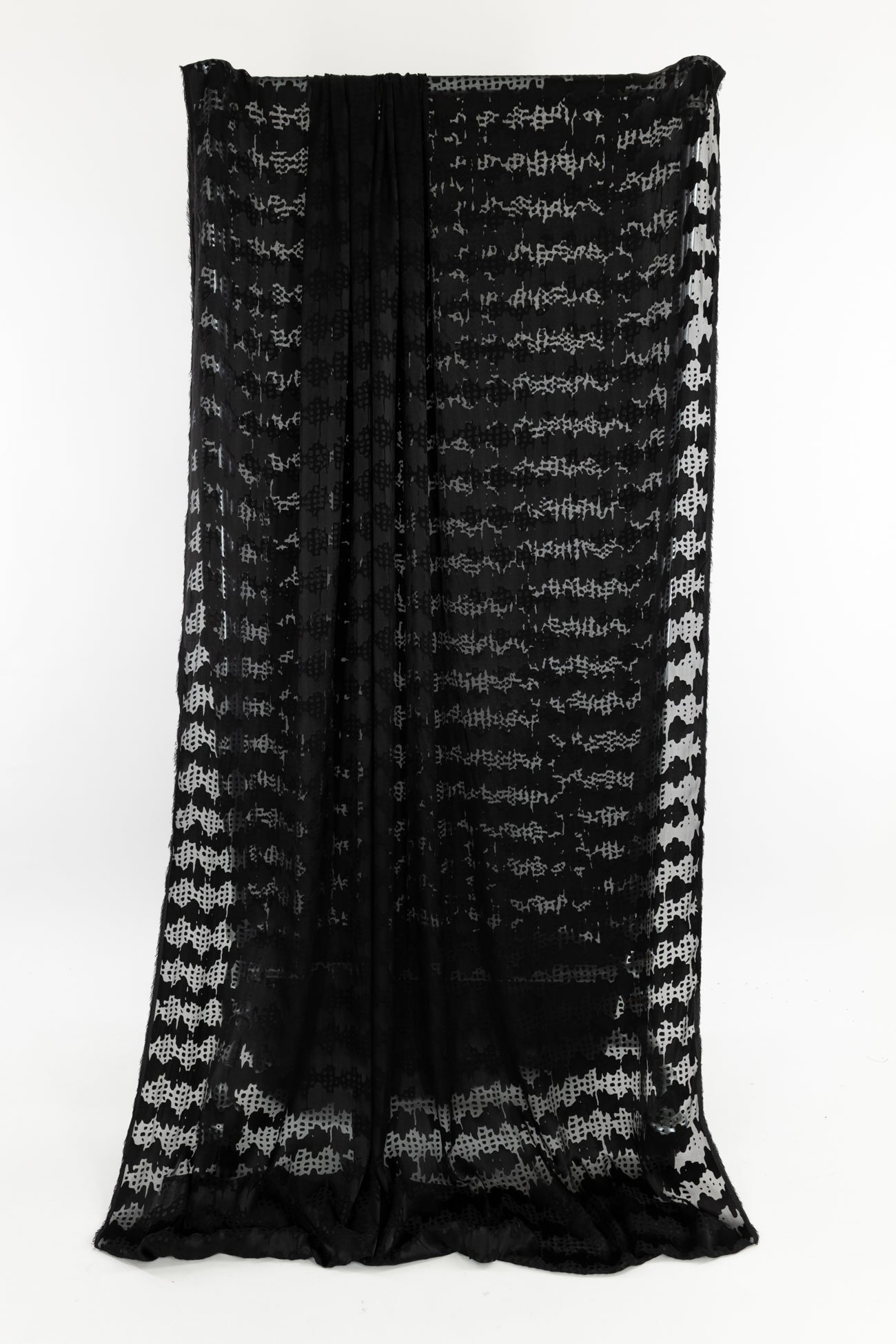 Striking singular eyelash jacquard weave with dots and stylized flowers in black. Fine quality deadstock from a NYC designer is semi-sheer, silky smooth, and supple, with a 2¼" repeat. Solid areas have a satin finish feel delicious. Right for layering or to line, making an airy jacket, shrug, shirt, tunic, dress, skirt, vest, or soft pants.