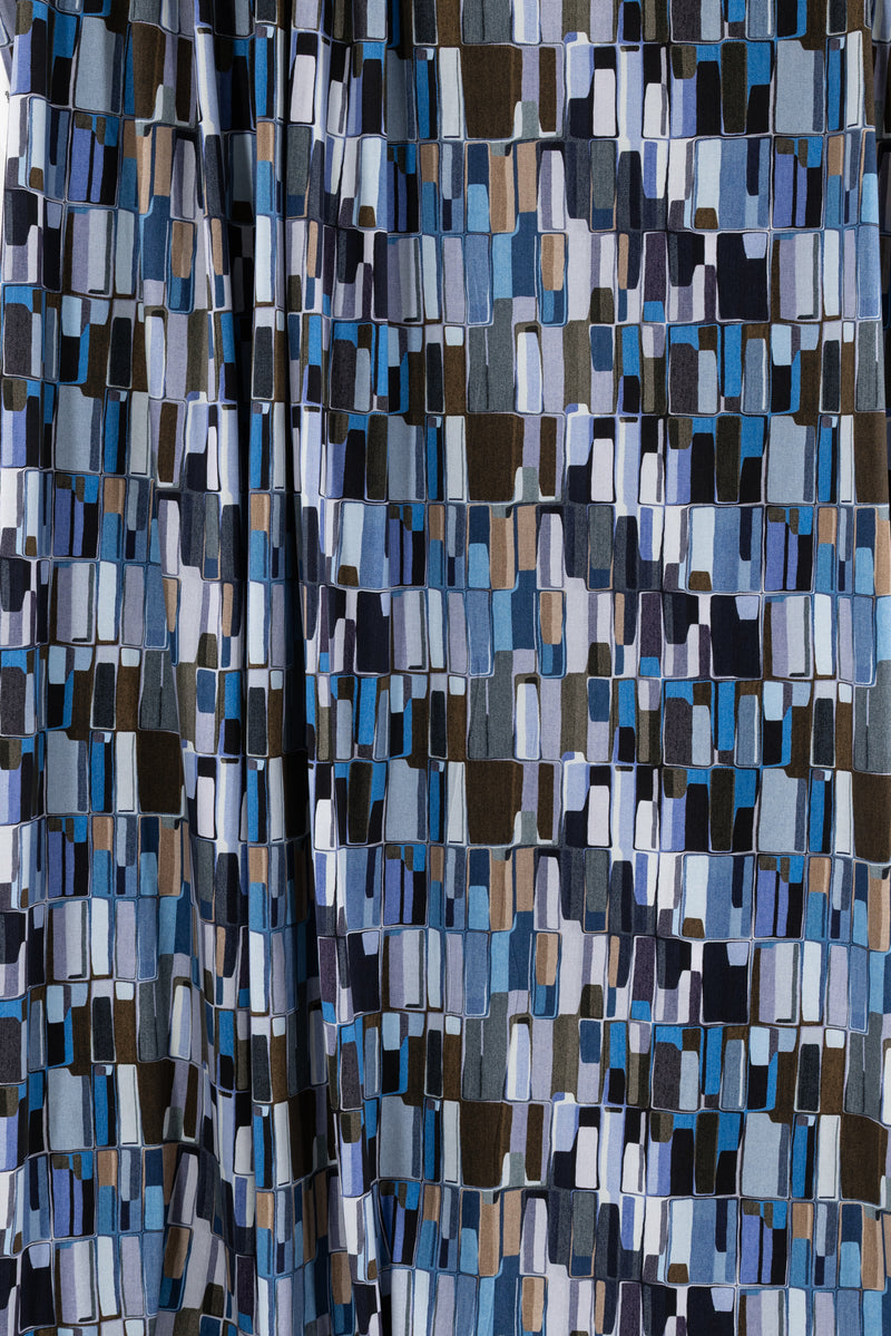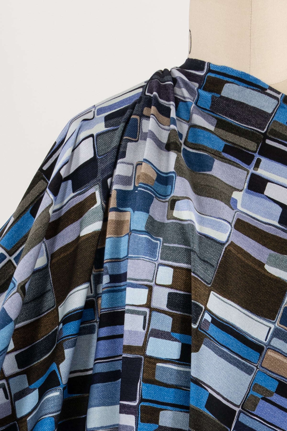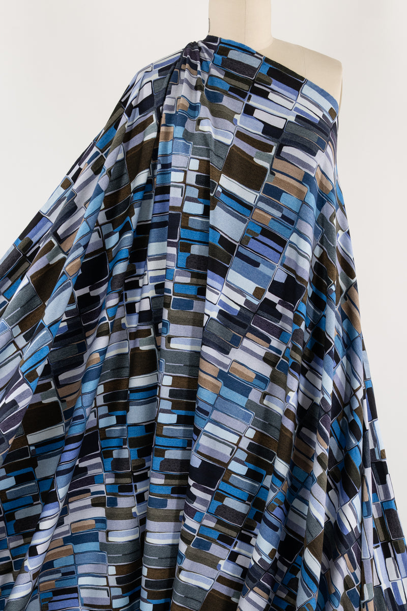 Contemporary cool toned geometric in shades of blue, brown, ecru, and white accented with black, digitally printed on luxurious cotton knit jersey in the Netherlands. Impeccable quality, light/mid-weight, opaque, with a flattering body-skimming flow, appealing soft hand, fluid drape, crosswise stretch, some lengthwise stretch, 12" repeat, one-way design, and some rolling at the cut edge. Ideal for a wide range of garments, t-shirt, tunic, dress, skirt, soft pants, loungewear, caftan, kimono, men's, or children's. Oeko-Tex® certified.