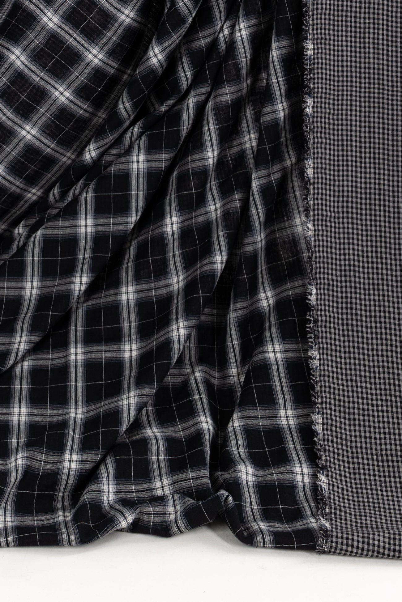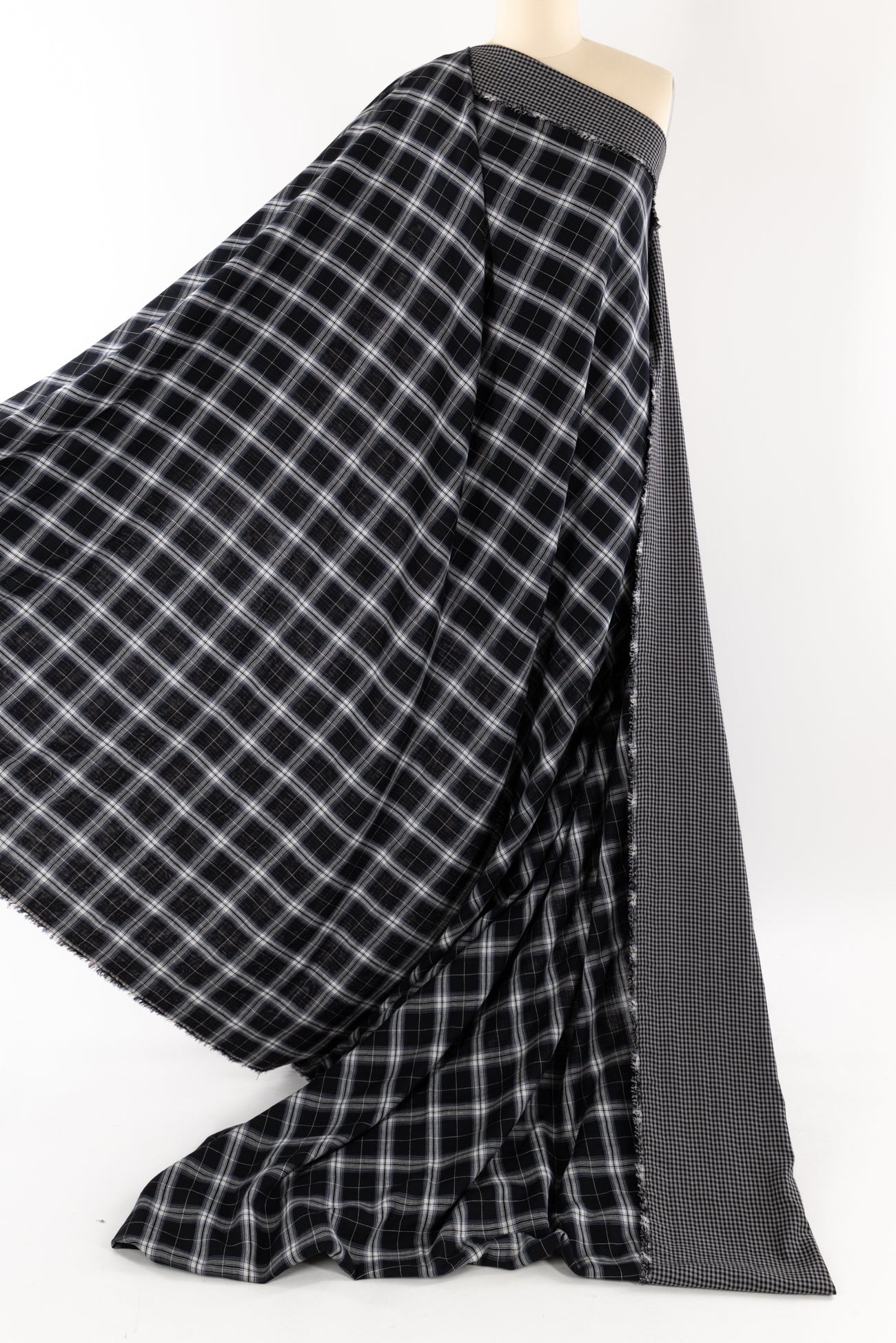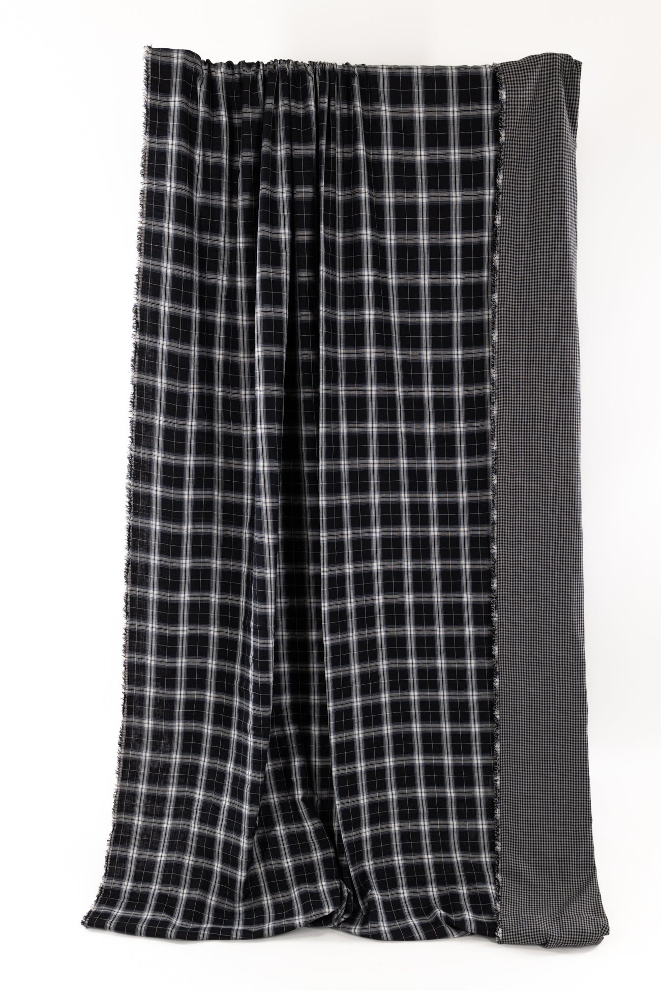 A black and white classic with a quintessential plaid on one side and tiny gray and black houndstooth on the reverse. A fine quality deadstock cotton double woven from an LA designer. Light/shirting weight, opaque with a soft smooth hand, 2¾" repeat on the plaid side and light drape. Really lovely and right for a shirt, tunic, skirt, dress, soft pants, caftan, men's or children's.