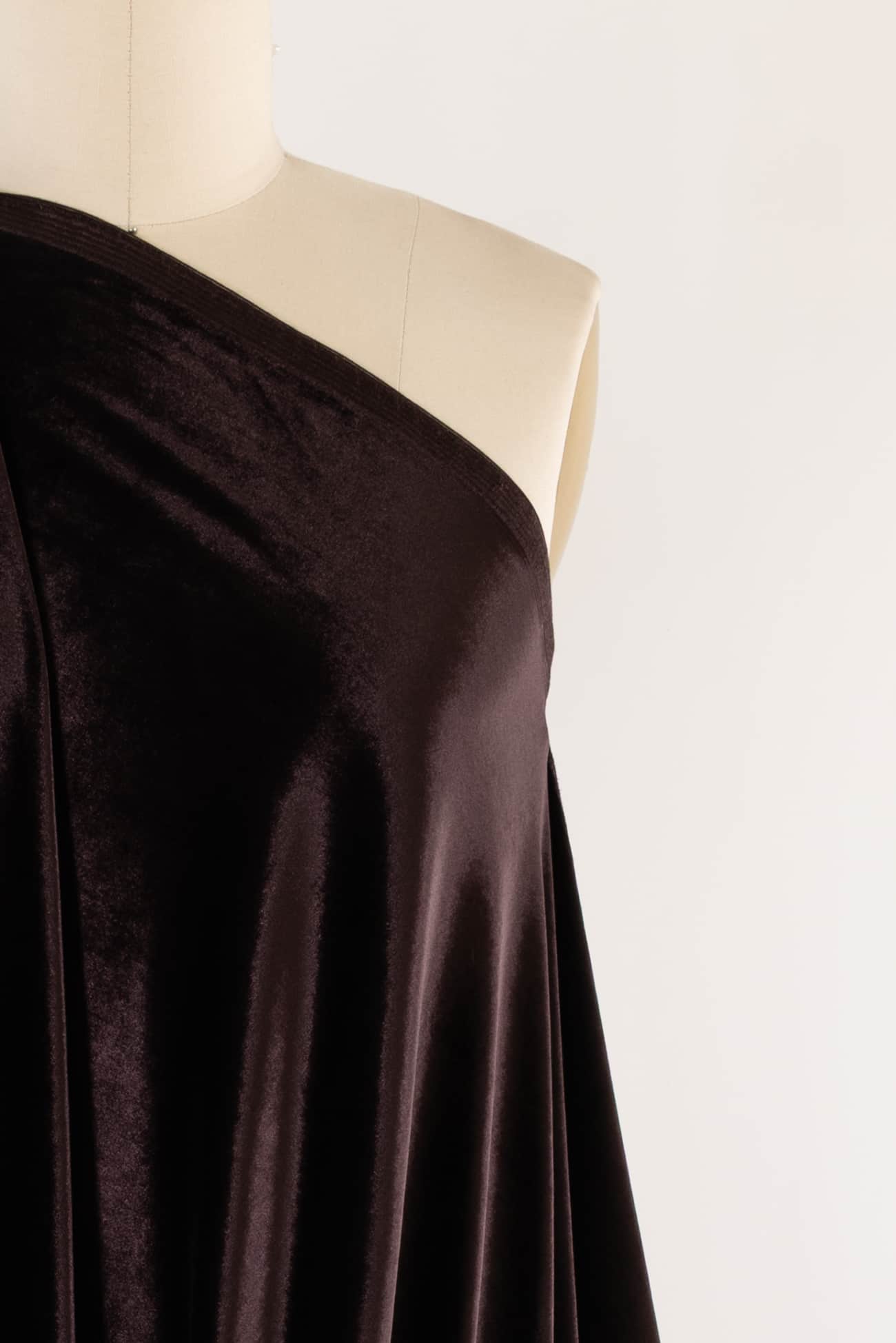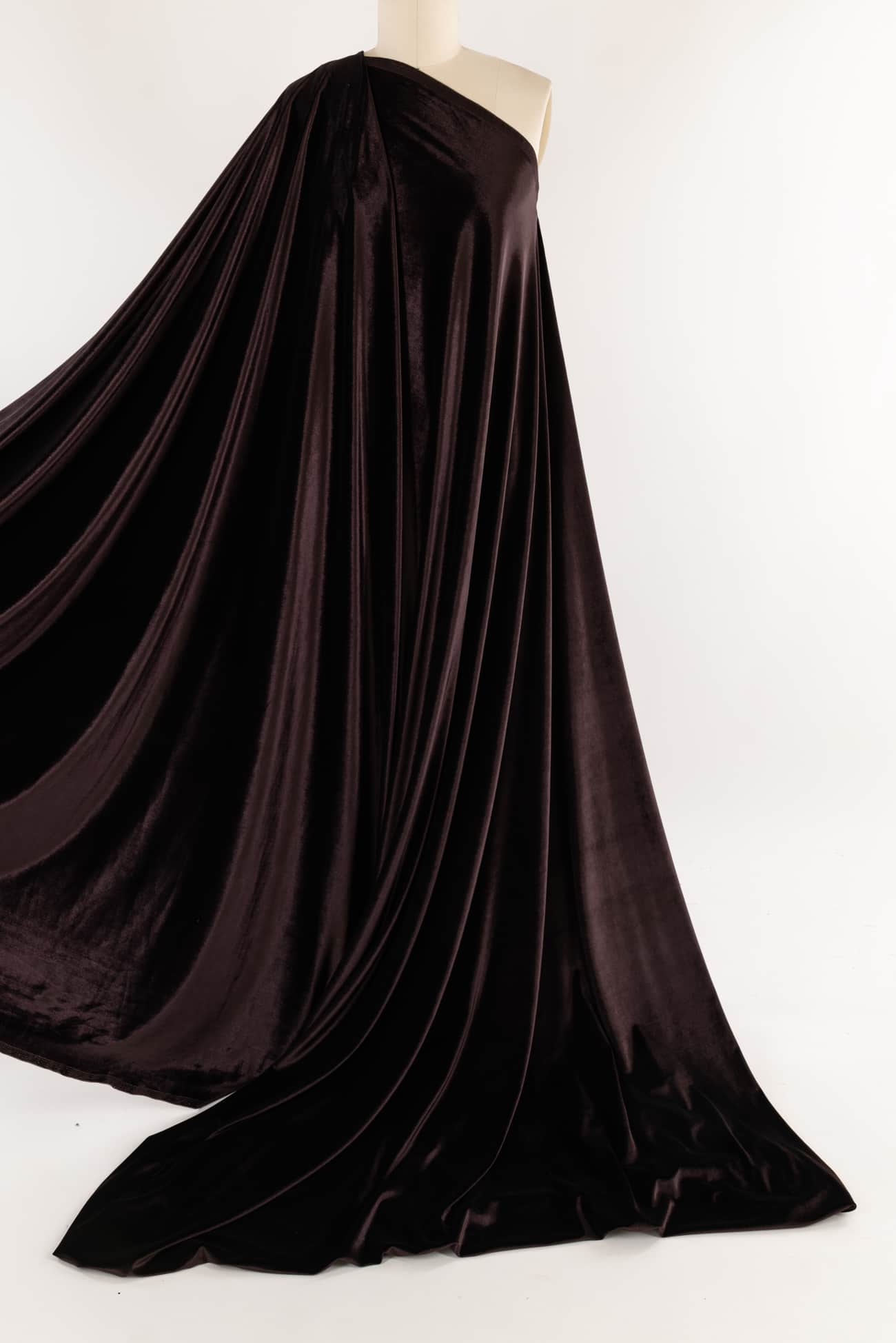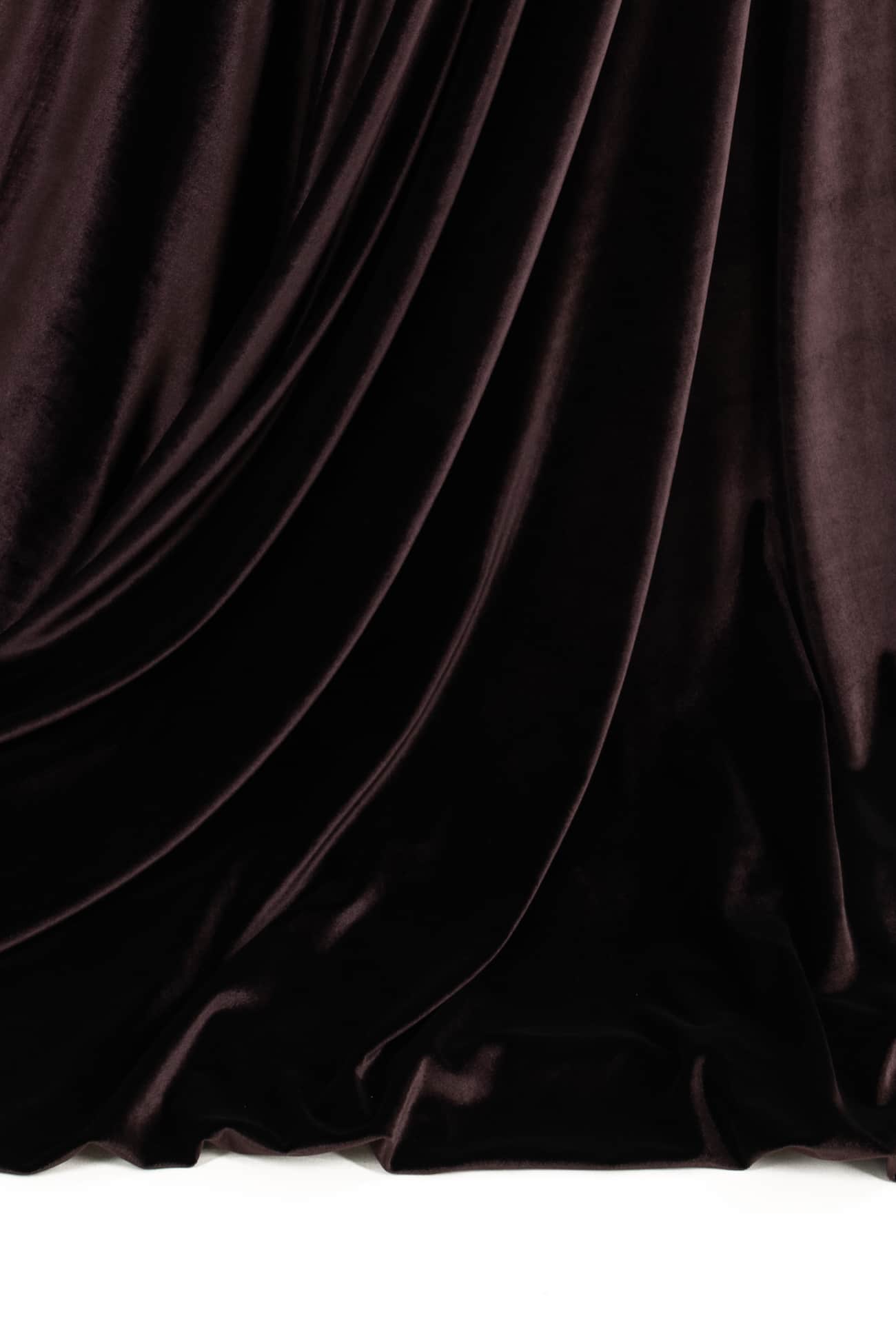 Rich and mysterious chameleon color -purple/brown/burgundy, deadstock from an LA designer. Unusual and gorgeous! Lightweight with a plush low pile soft velvety hand, silky smooth on the back side, a fluid drape with 4 way stretch, and excellent recovery. Cut for nap. A fabric to dress up or down; right for a top, t-shirt, dress, skirt, cardigan, hoodie, jacket, kimono, or soft pants.