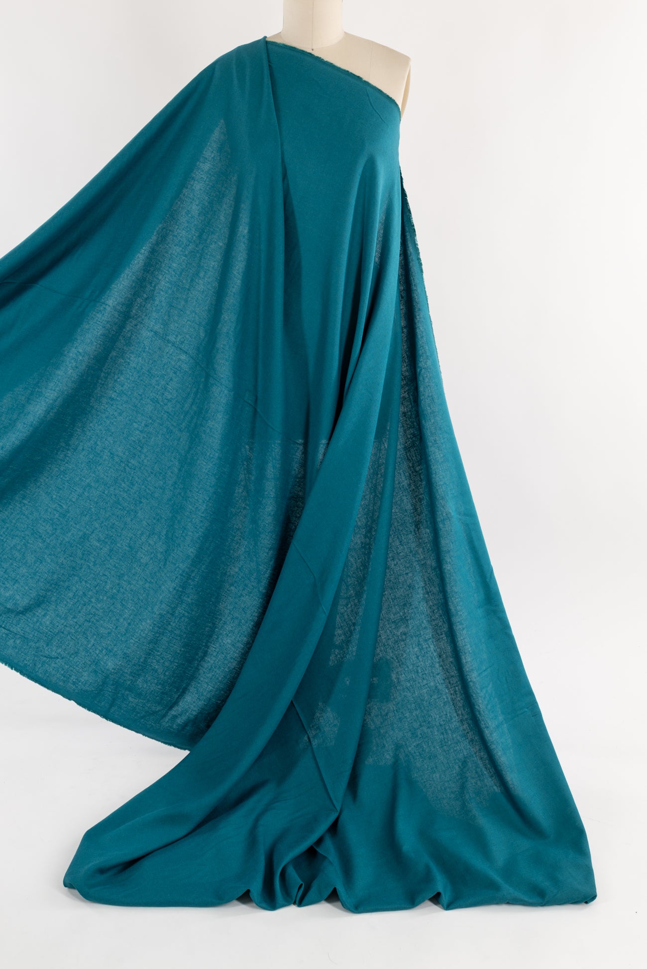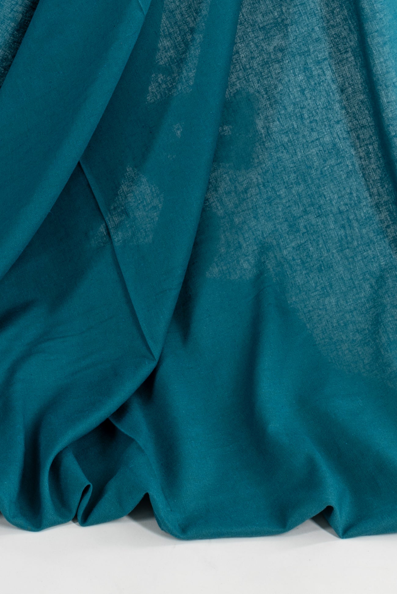 Clear green-toned turquoise/teal linen blend, deadstock from a NYC designer, a beautiful rich color. Light weight, opaque, with a fine grained linen texture, soft hand and fluid drape. Perfect for soft, drapey styles: top, tunic, dress, skirt, soft pant, caftan, kimono. Limited quantity.