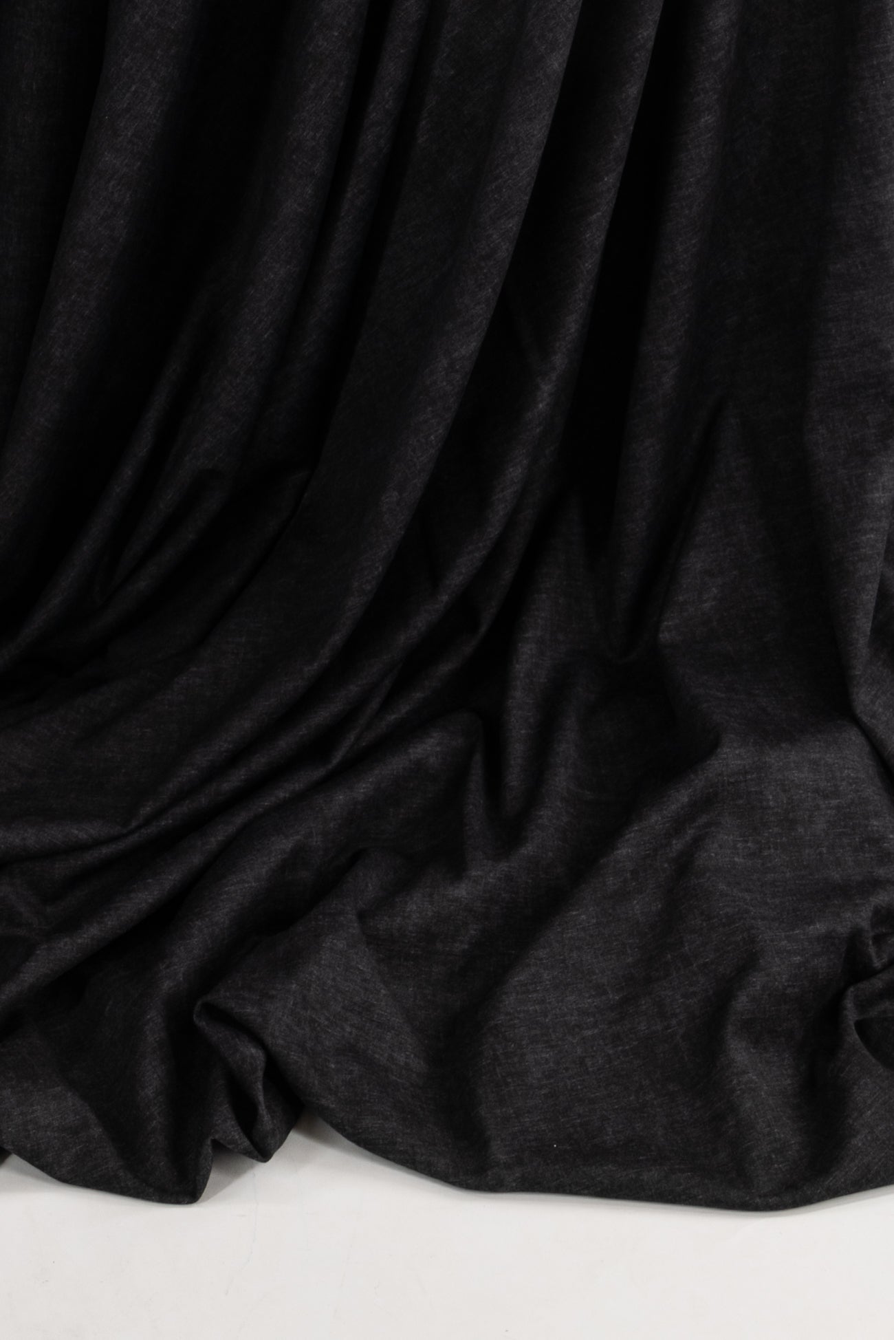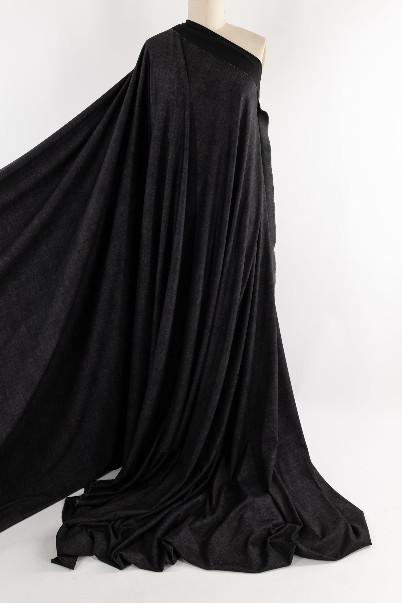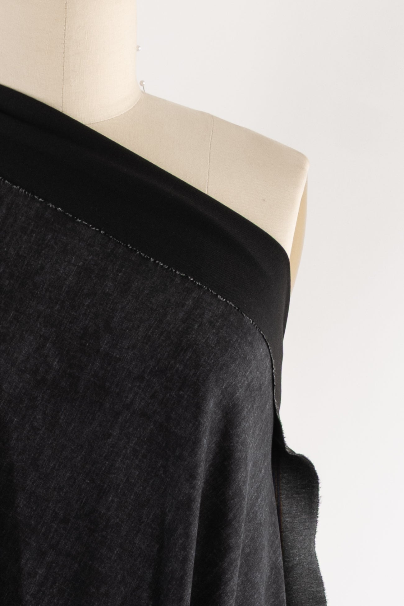Black knit is digitally over-printed in gray in a subtle woven/textured effect design - the subtle print 'reads' almost like a solid color. With a cool, dry matte hand, this is an appealing fine double knit that will be easy to sew and wear and is great for travel and wardrobe building. I see this kind of knit used in fine French ready to wear for t-shirts, tops, drapey skirts, pants, dresses etc. Light/midweight with a smooth hand, lightly structured drape, 4 way stretch with good recovery and no rolling at the cut edge so a seam finish is optional. Reverses to solid black. The weight is perfect for slimming pants, t-shirt, cardi, dress, light jacket or vest, hoodie, or activewear.