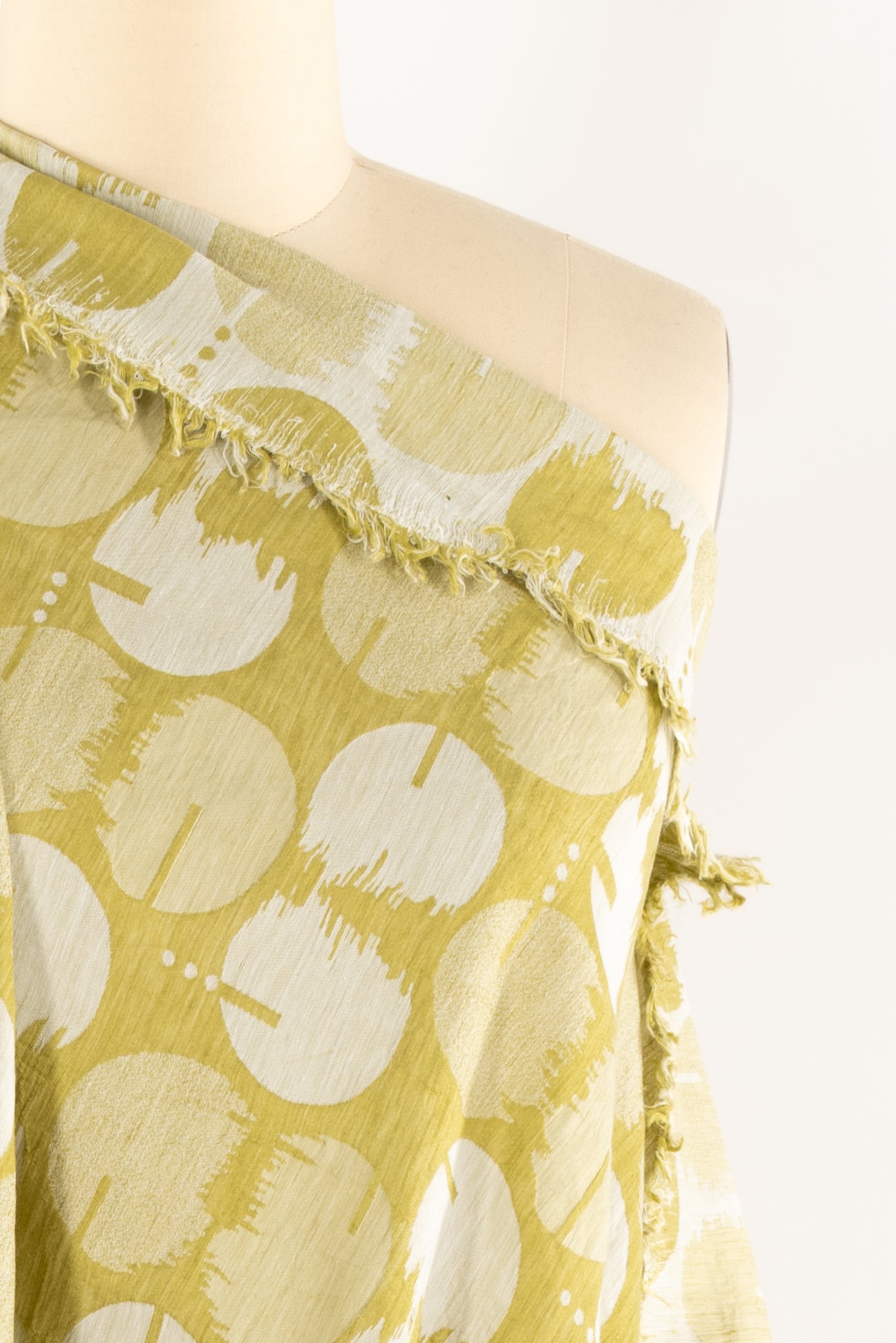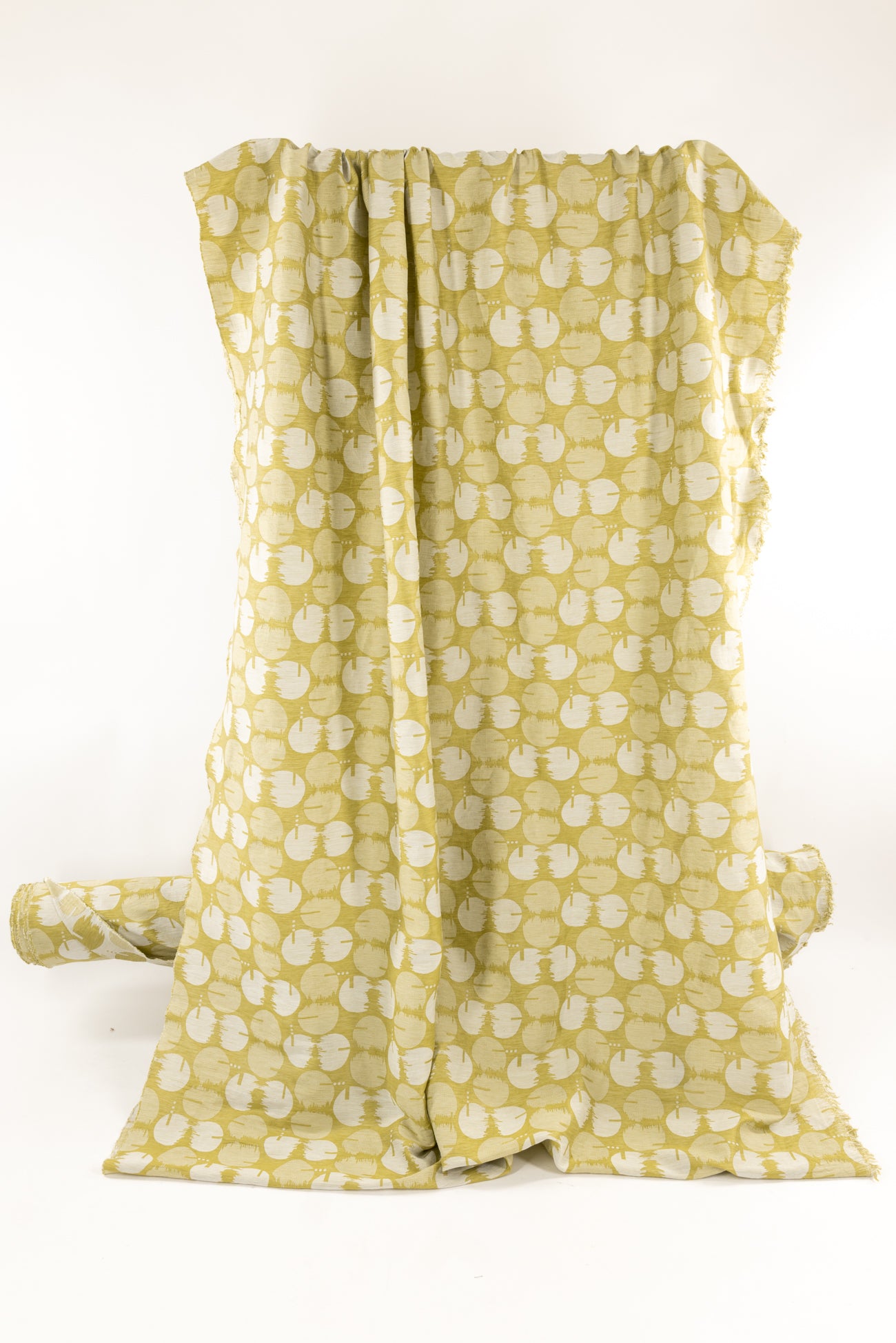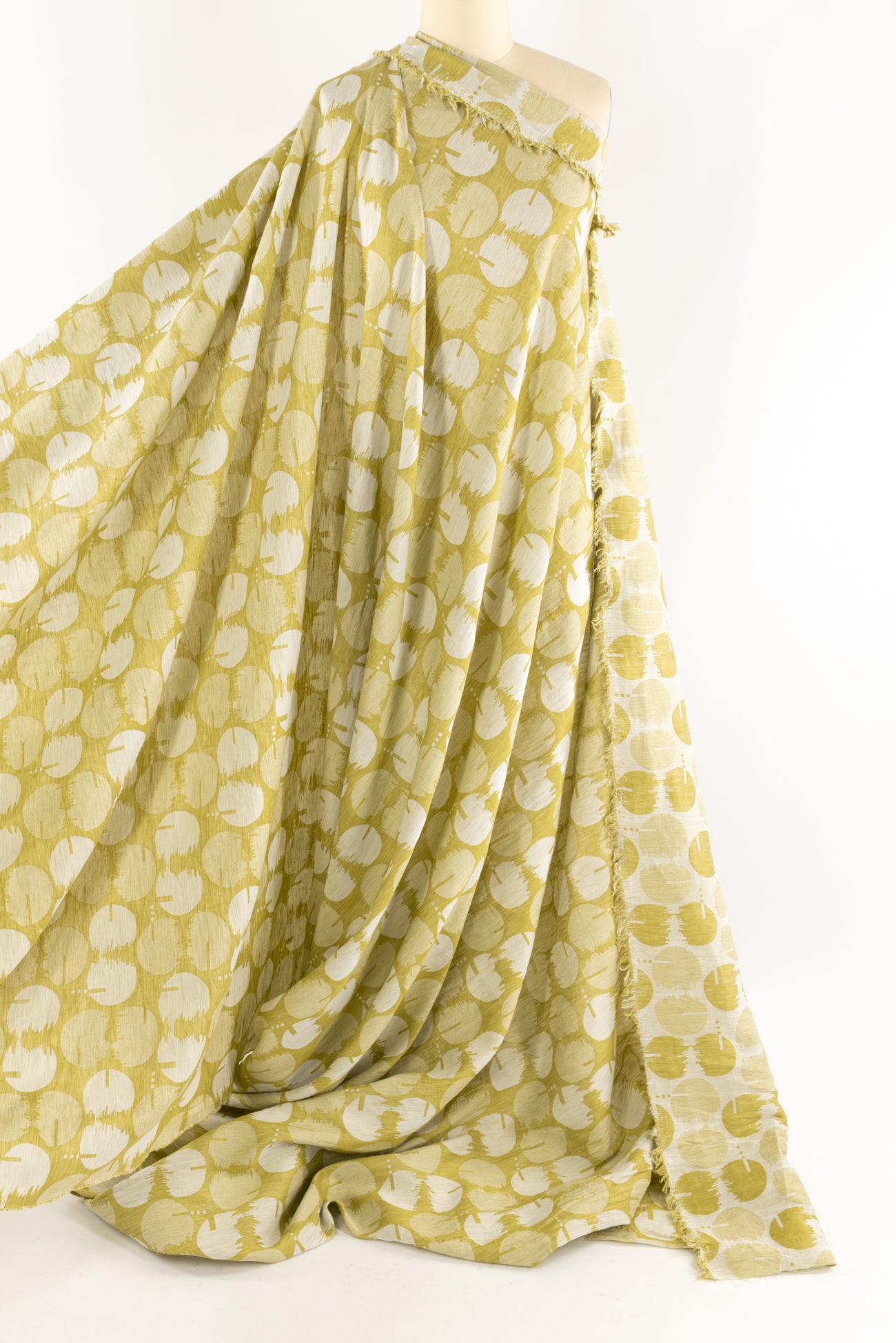 Charming citron and white jacquard woven with an enticing diversity of dots. Fine quality deadstock from Southern California designer Chalet et Céci. Lightweight linen/rayon/nylon blend is opaque, with a softly textured hand, light drape and a 7" repeat. Right for both tops and bottoms, for a light jacket, vest, dress, shirt, tunic, top, skirt, caftan, soft pants, men's or children's.
