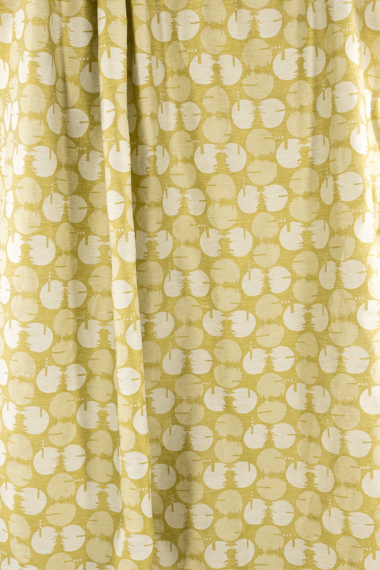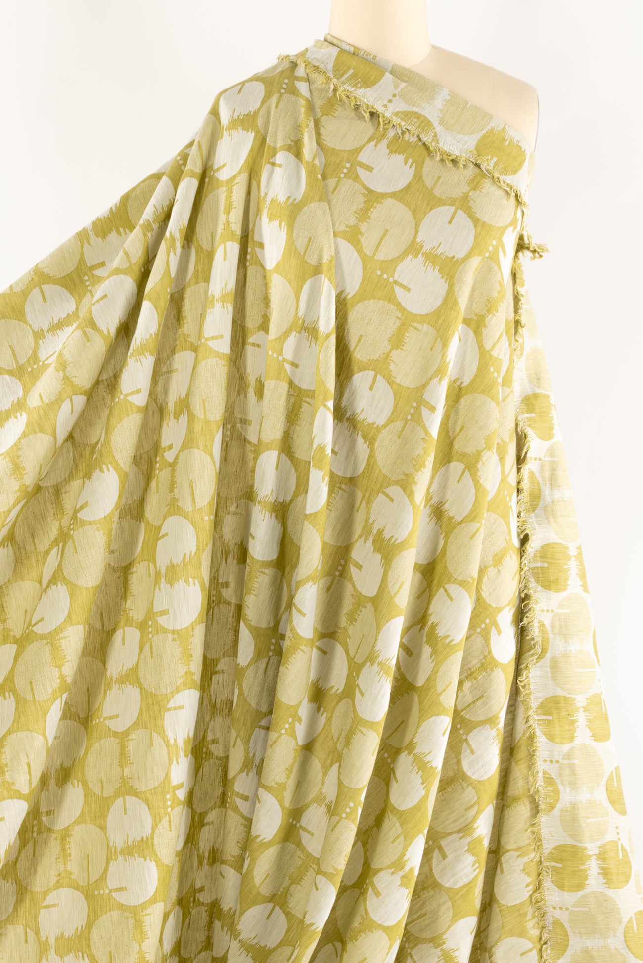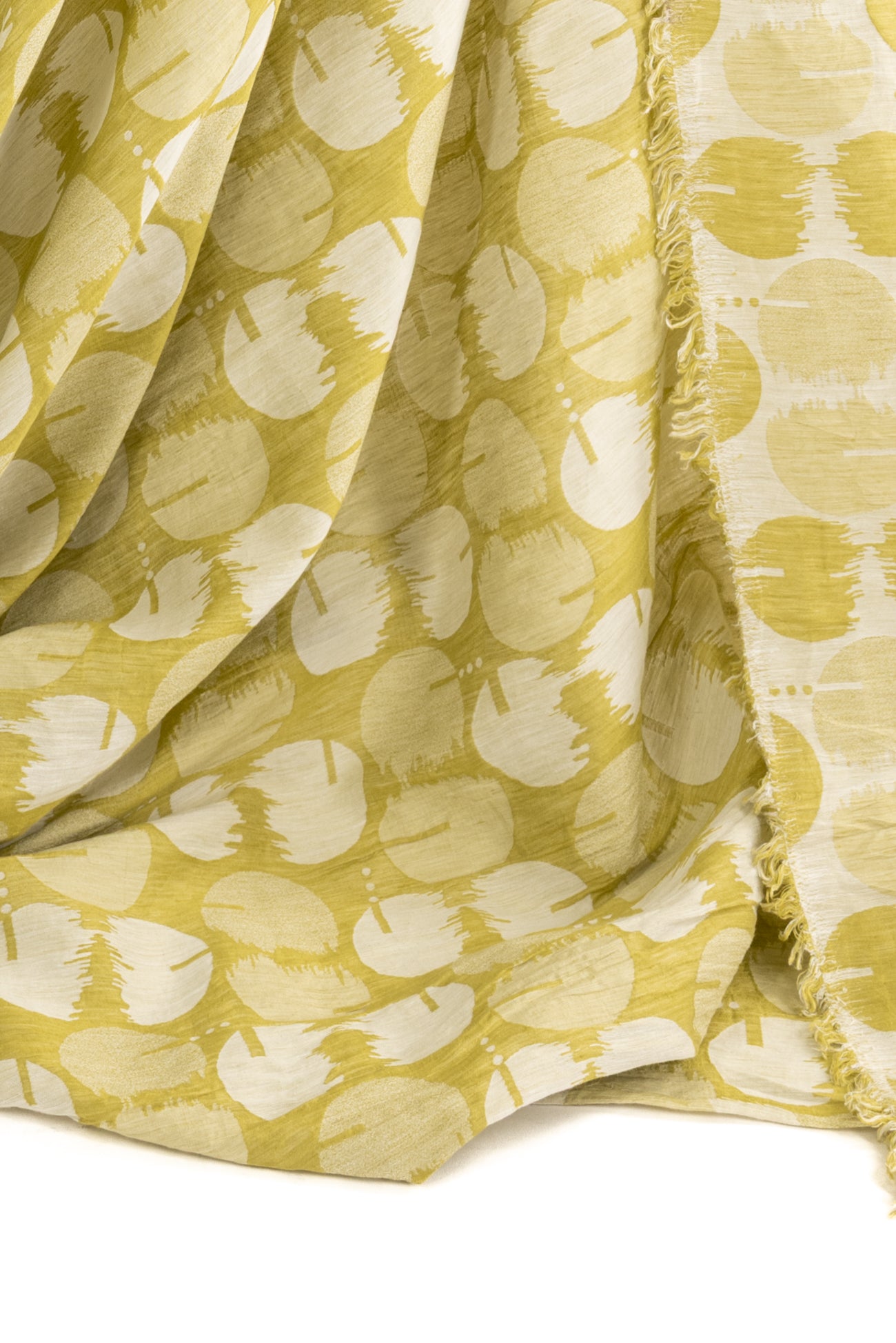 Charming citron and white jacquard woven with an enticing diversity of dots. Fine quality deadstock from Southern California designer Chalet et Céci. Lightweight linen/rayon/nylon blend is opaque, with a softly textured hand, light drape and a 7" repeat. Right for both tops and bottoms, for a light jacket, vest, dress, shirt, tunic, top, skirt, caftan, soft pants, men's or children's.